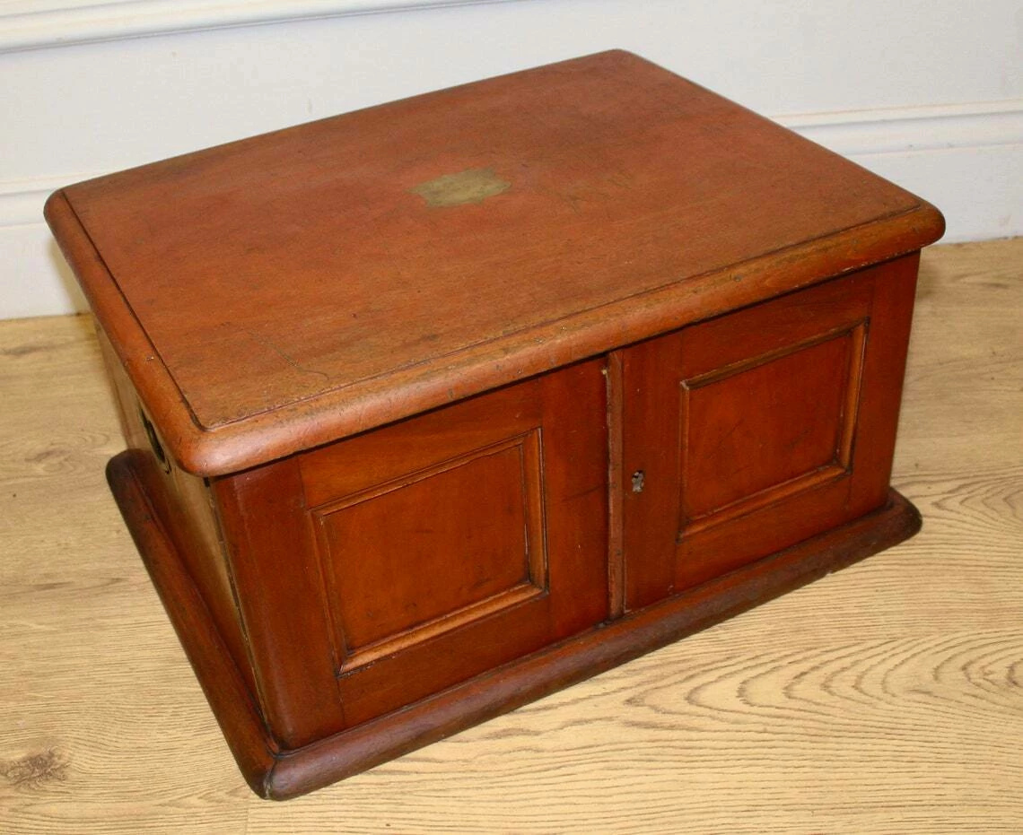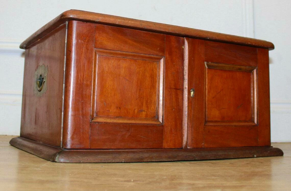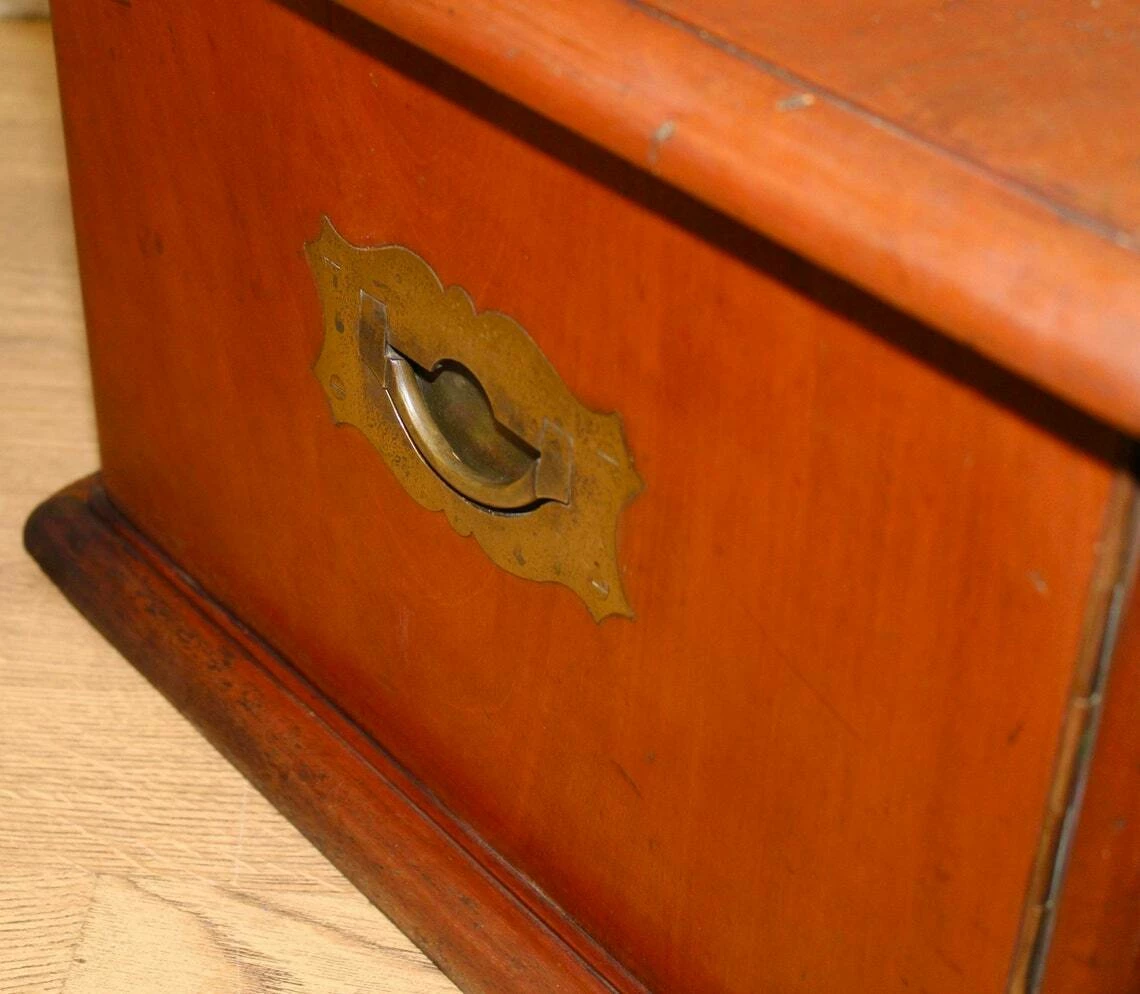 The item is in good condition for age although is missing key to the front, some marks, staining and scratches to the wooden surface.