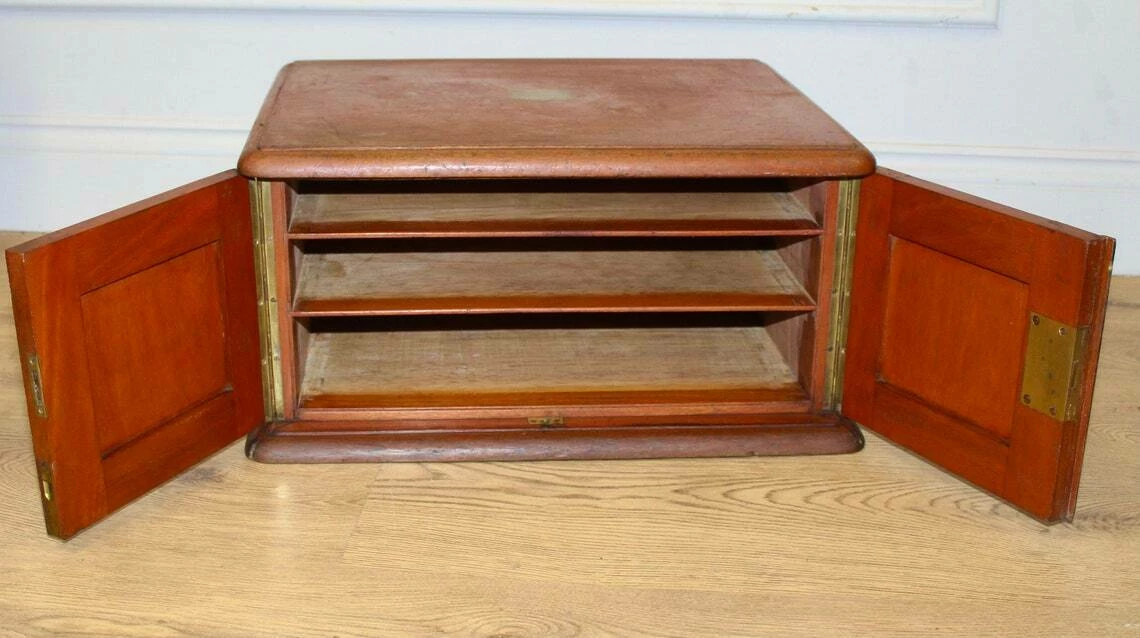 Highly original and desirable three tier letter desk mahogany cabinet with inset brass handles and brass shield to the top. Dating from the beginning of the 20th century, this charming item is highly practical and would make a stylish alternative for storage.