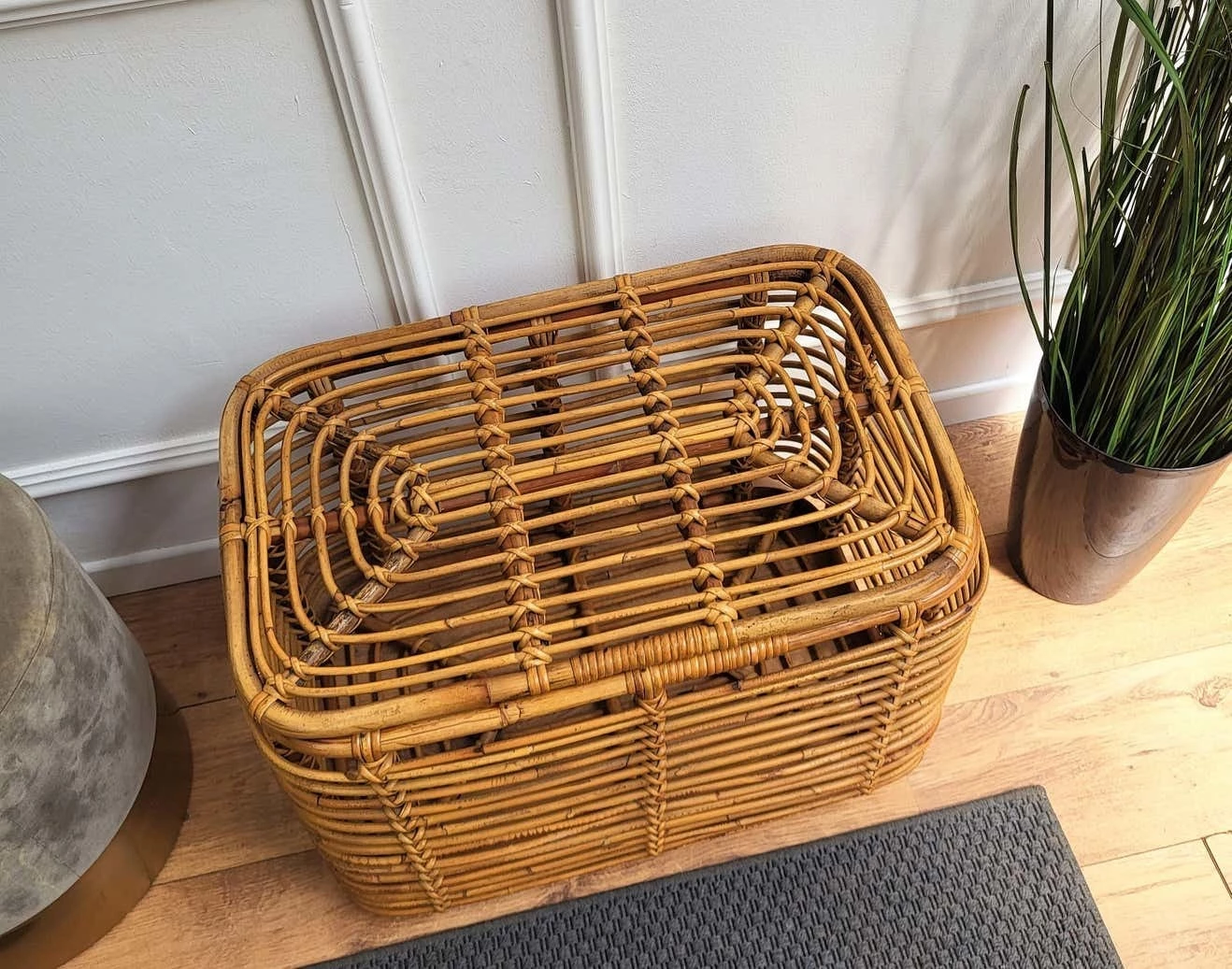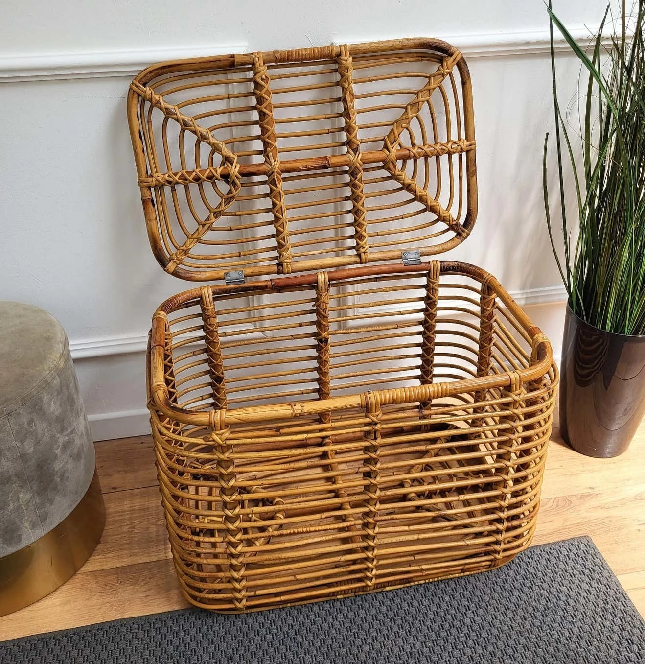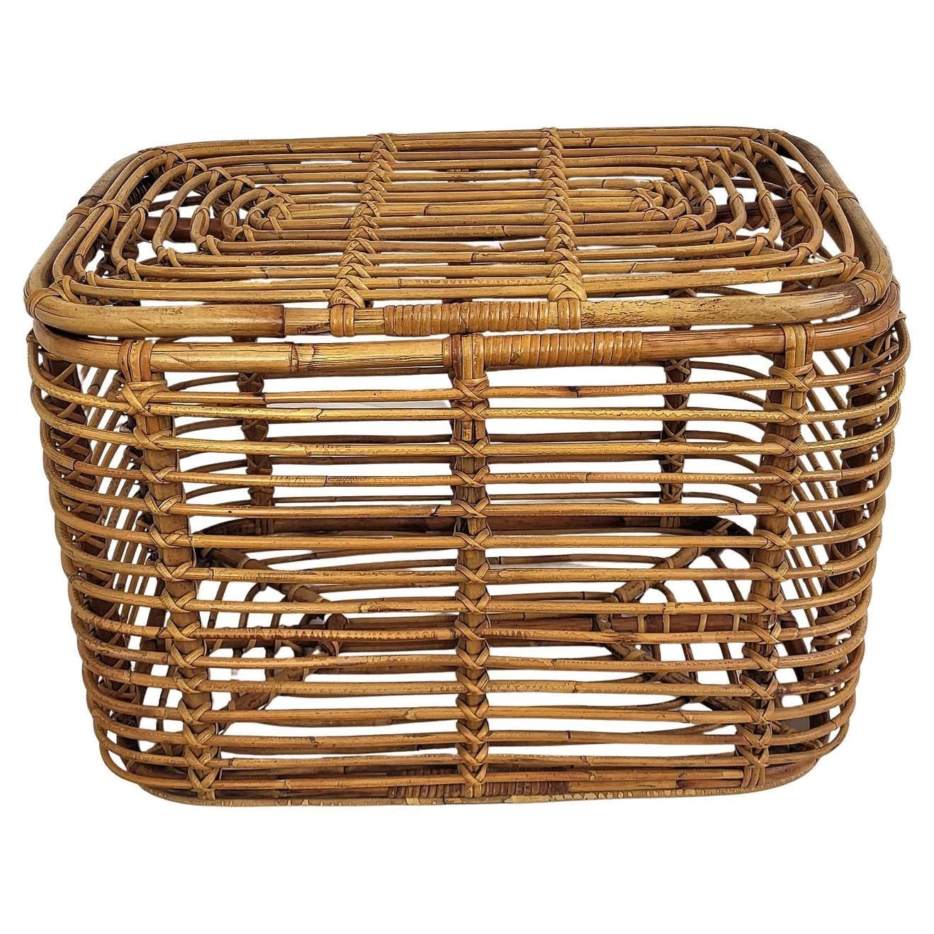Beautiful 1960s Italian Mid-Century Modern basket or container, perfect in any next to a sofa or in a bedroom as pillow or blanket storage as well as in any bathroom as bathrobe and towels. This charming piece is in the typical style of Audoux and Minet where the organic beauty of the woven materials is timeless and Classic, making bamboo and rattan furniture incredibly versatile.