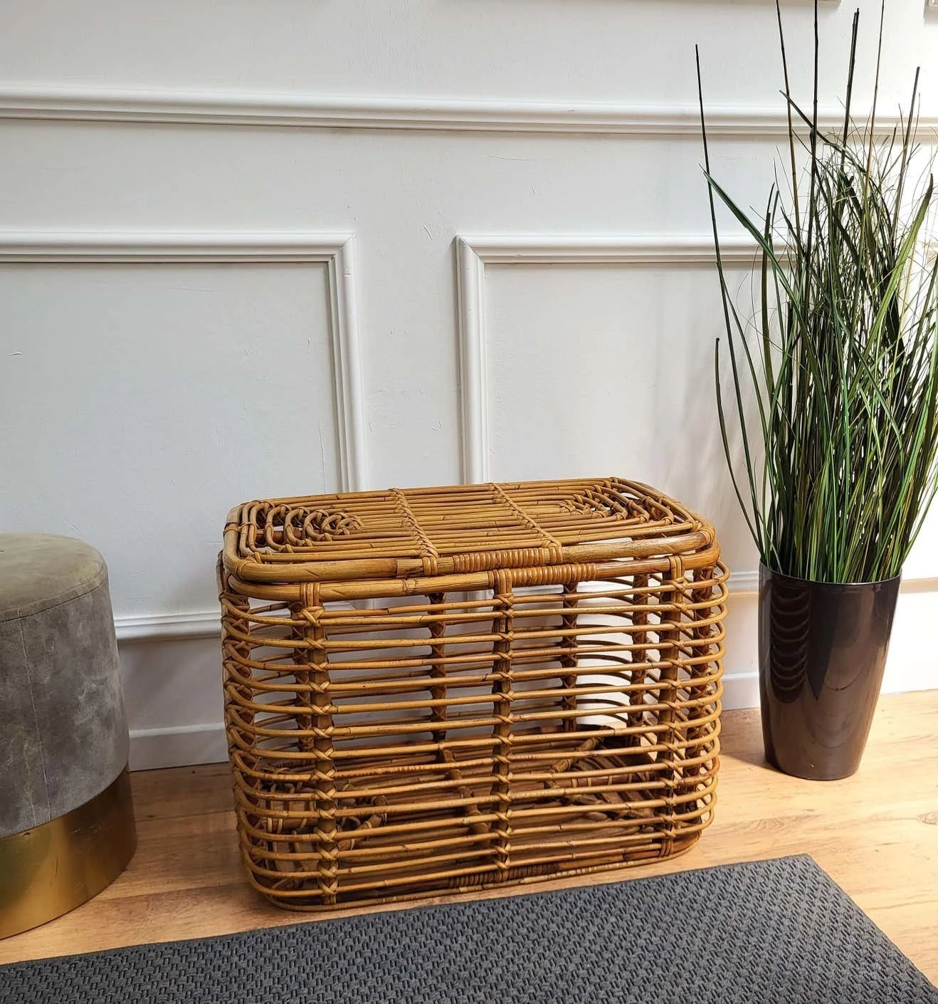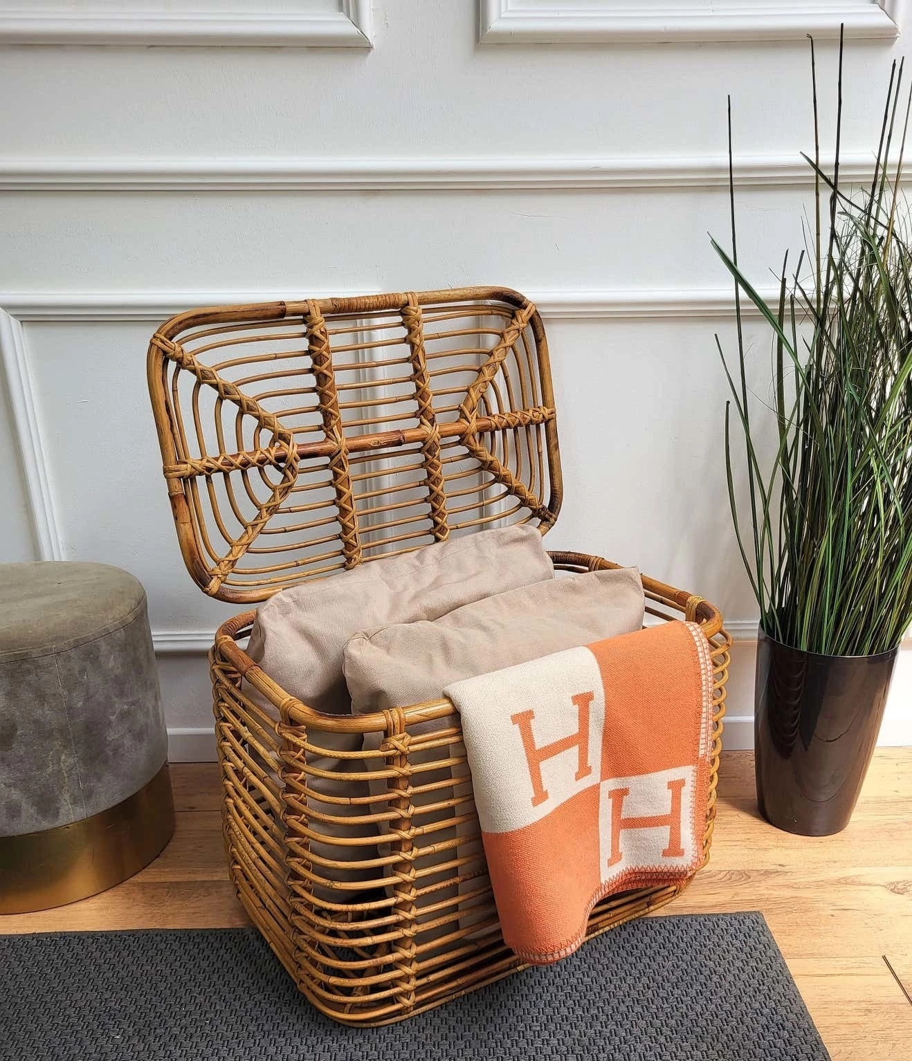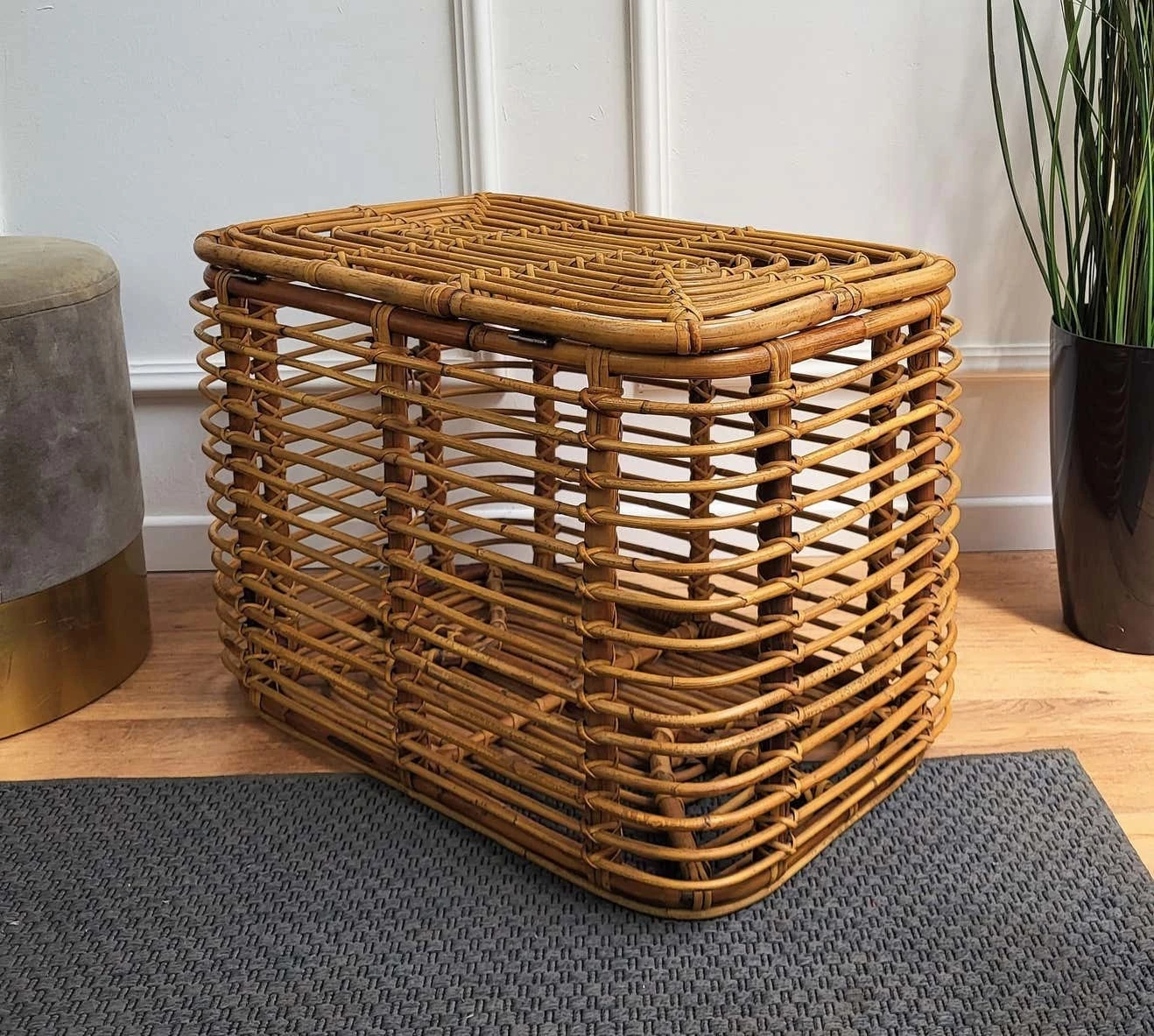 Beautiful 1960s Italian Mid-Century Modern basket or container, perfect in any next to a sofa or in a bedroom as pillow or blanket storage as well as in any bathroom as bathrobe and towels. This charming piece is in the typical style of Audoux and Minet where the organic beauty of the woven materials is timeless and Classic, making bamboo and rattan furniture incredibly versatile.