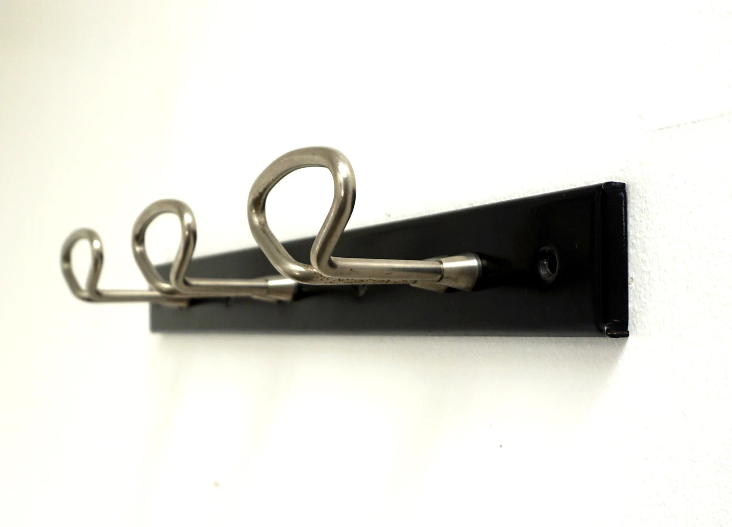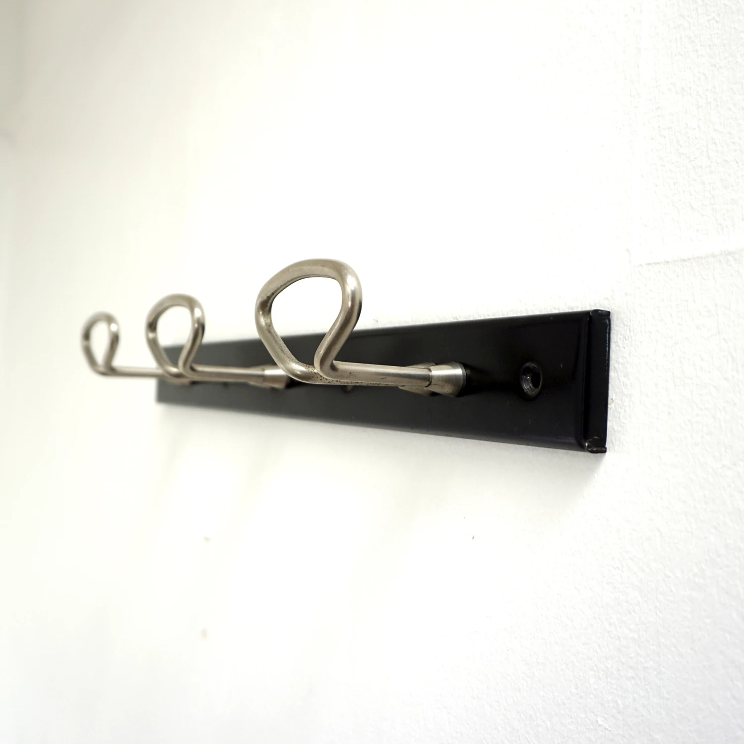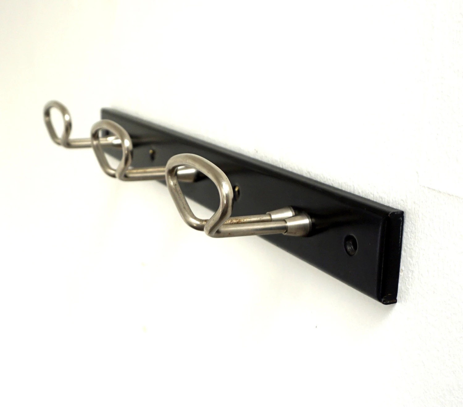 Vintage 1970’s industrial coat hook rack. With a black coated metal back and a trio of curvy chromed metal hooks.