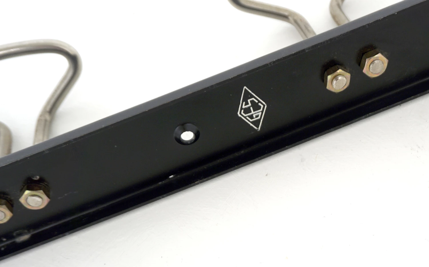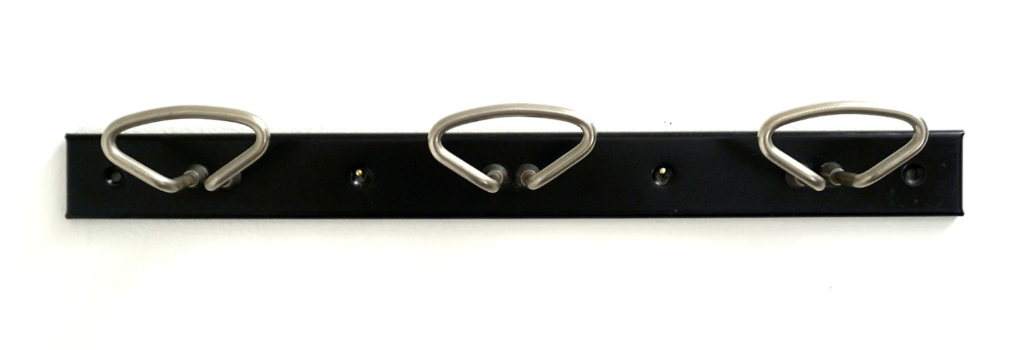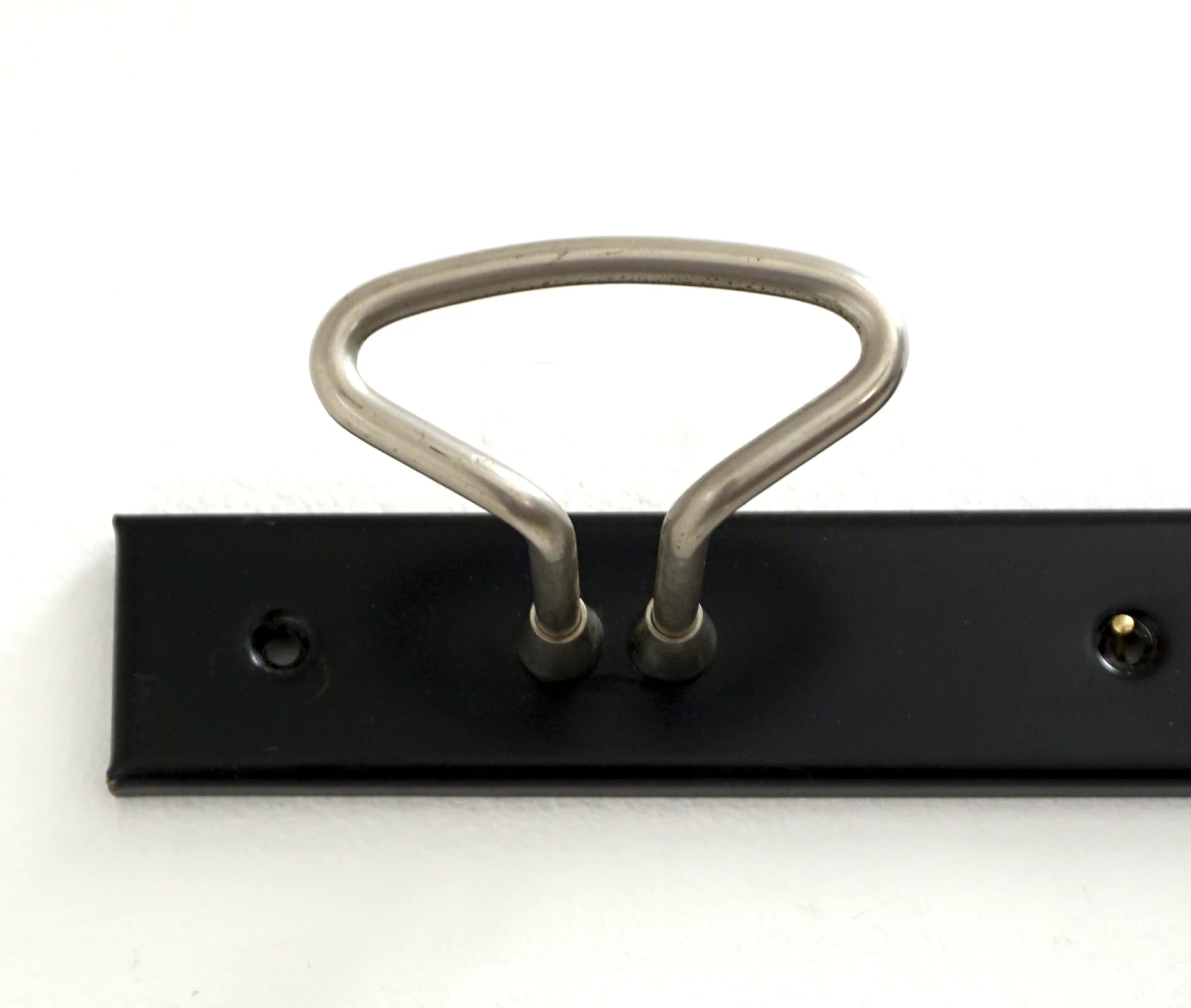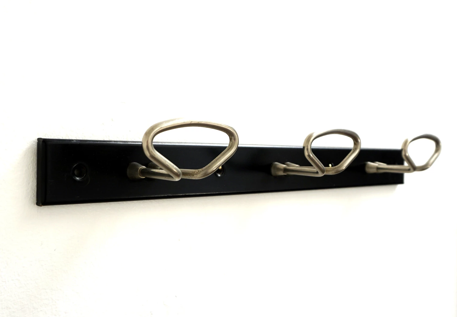 Vintage 1970’s industrial coat hook rack. With a black coated metal back and a trio of curvy chromed metal hooks.