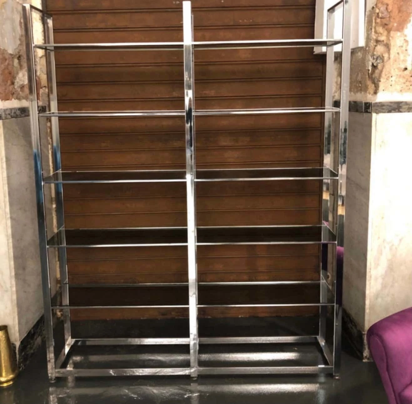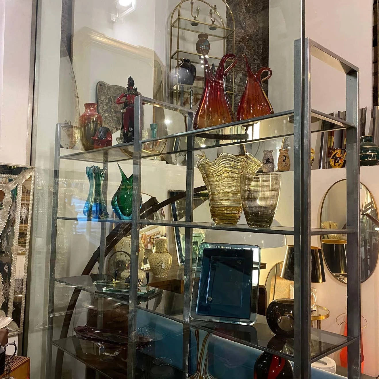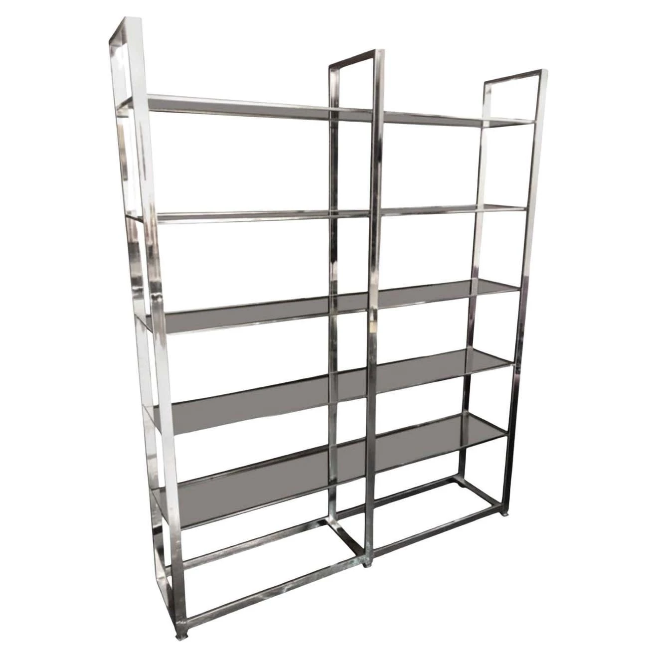 A five-shelf bookcase made in Italy in the 1970s, steel and smoked glass. The simplicity and essentiality of its line makes it very elegant.