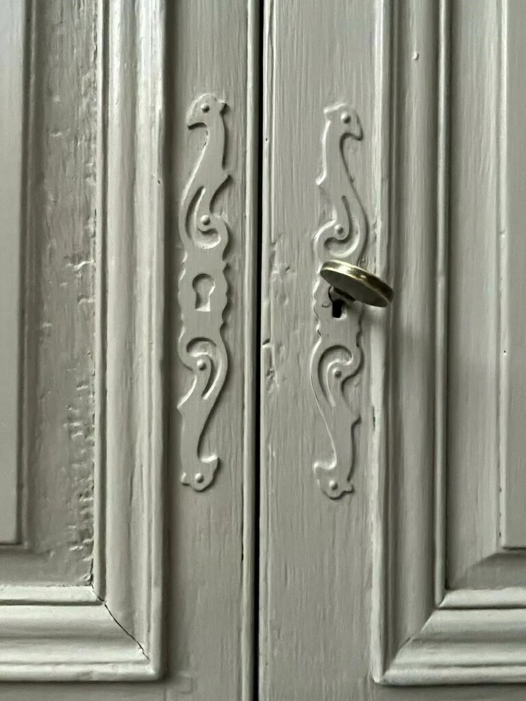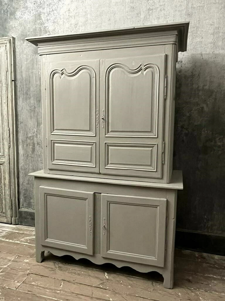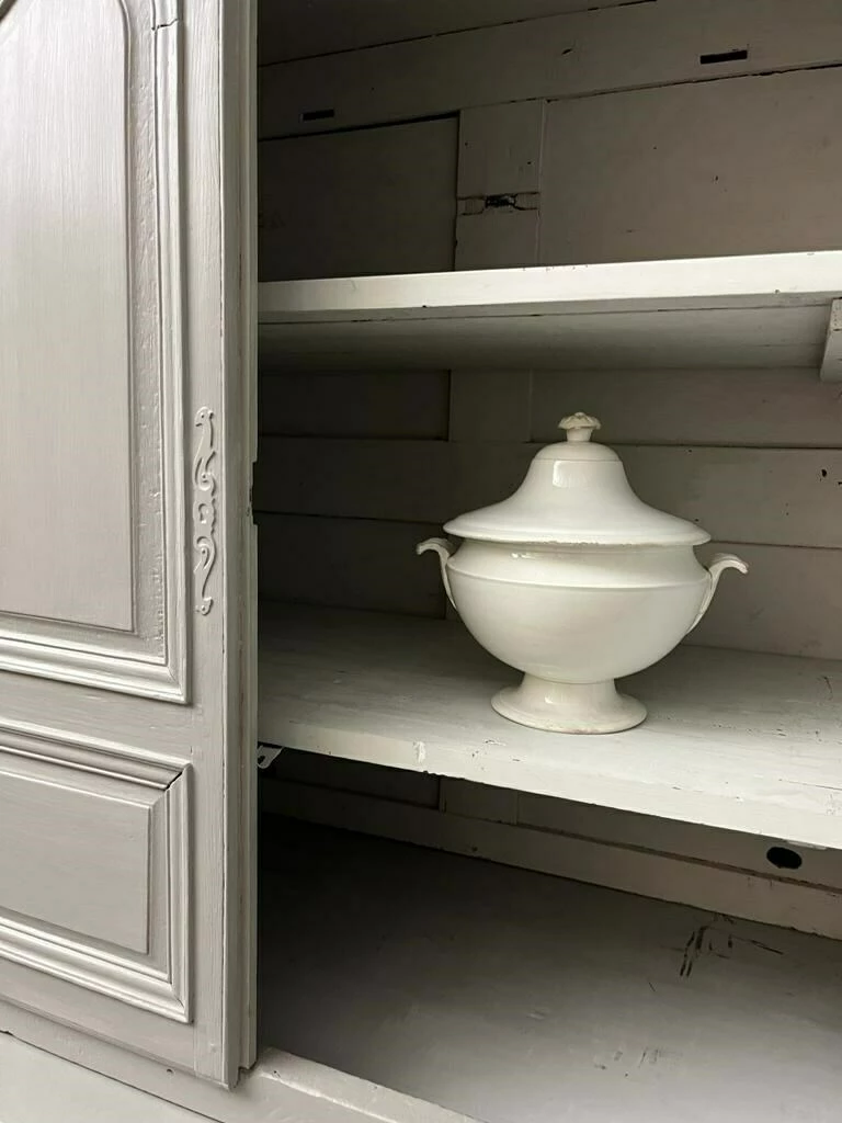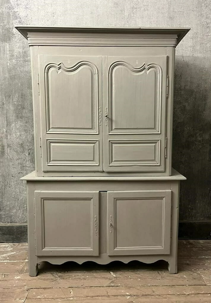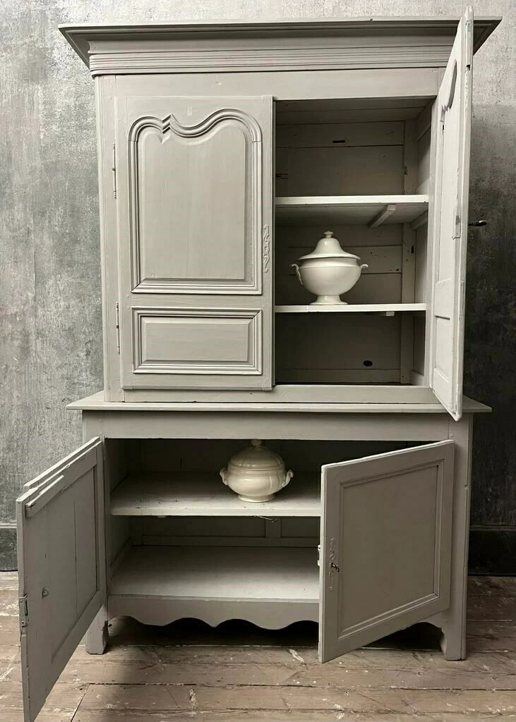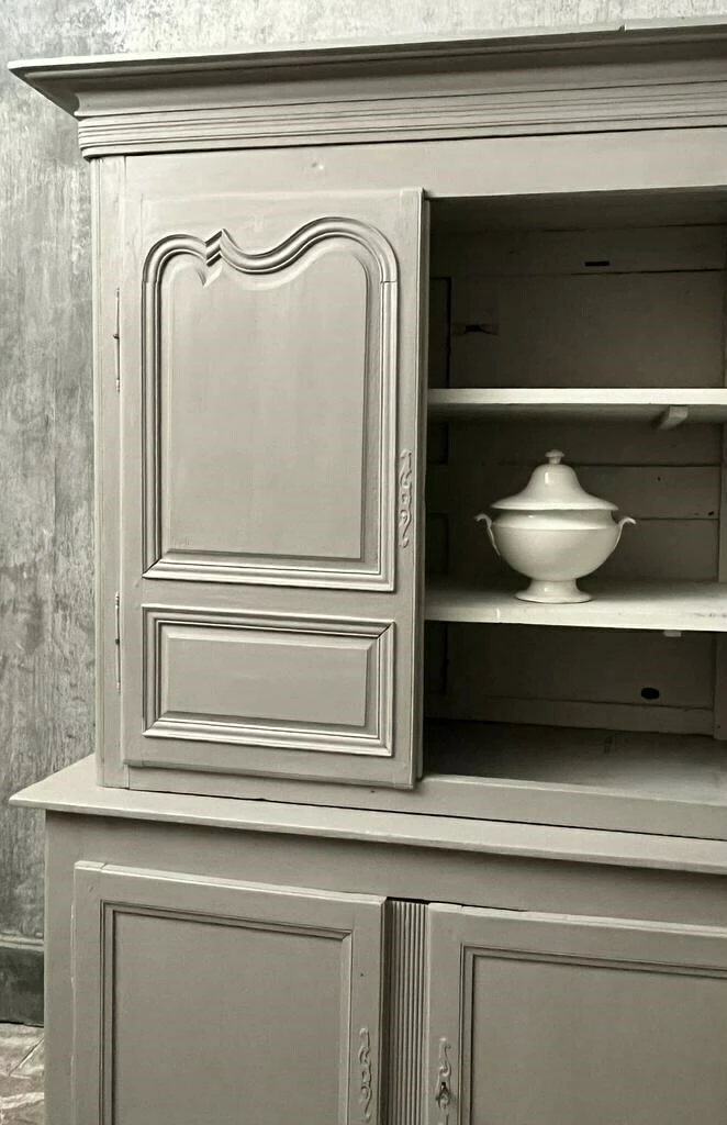 19th century French Oak buffet deux corps with original lock and working key. Shelves in upper and lower cupboards. The buffet has been later painted