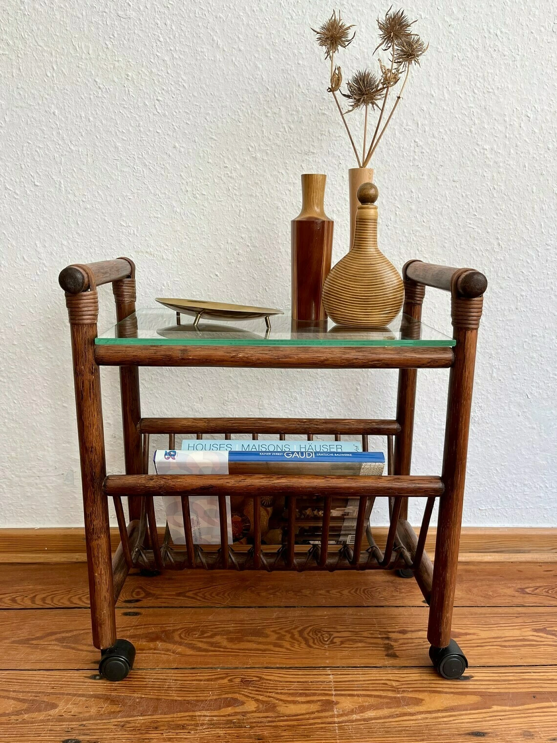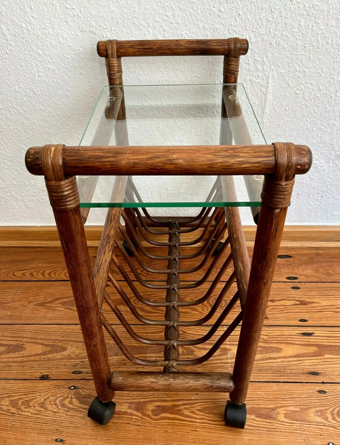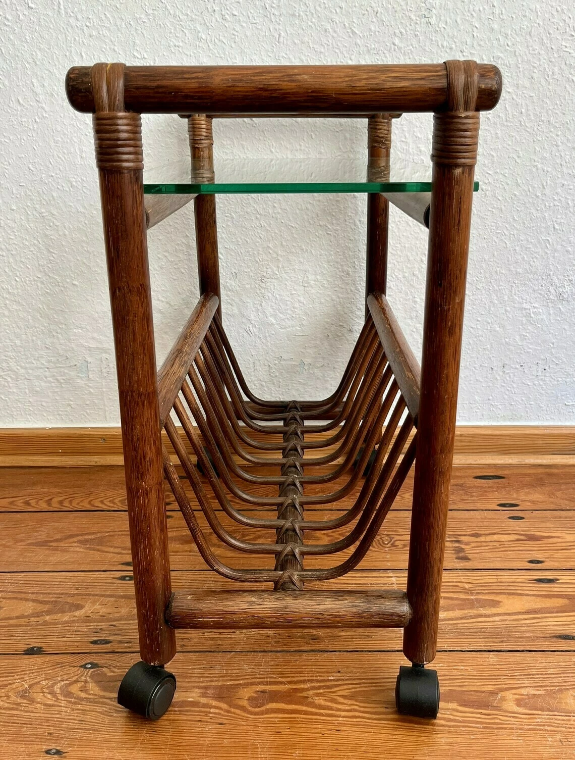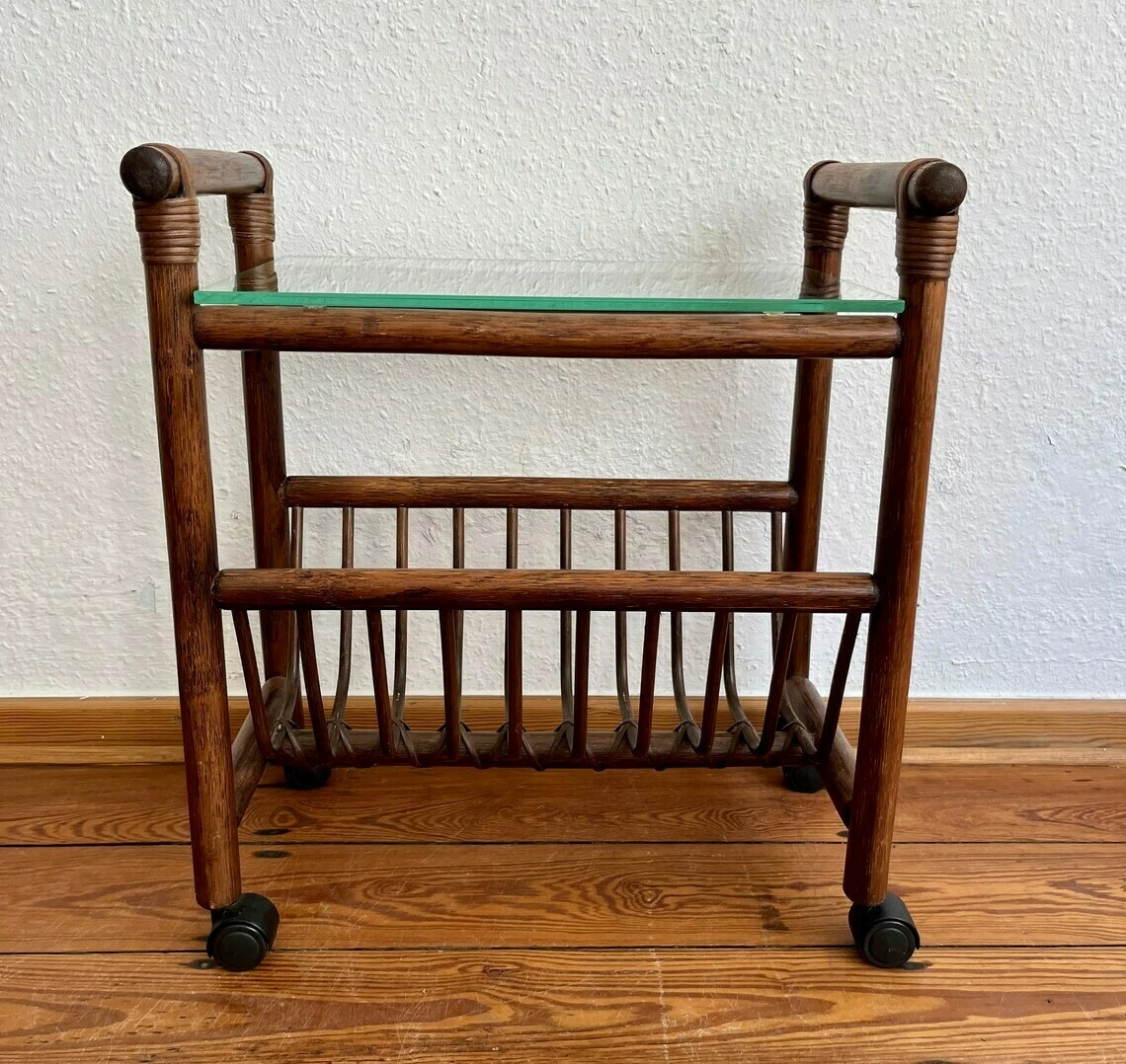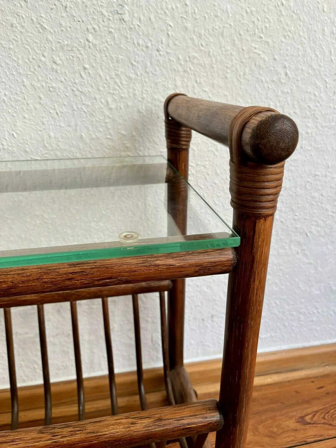 Mid Century 50s 60s magazine rack made of bamboo and rattan with a glass top (without decoration).