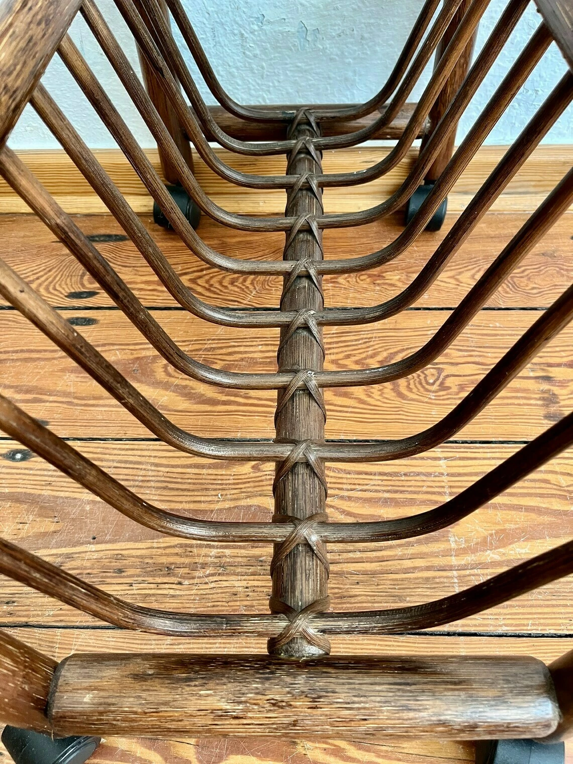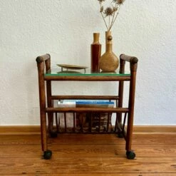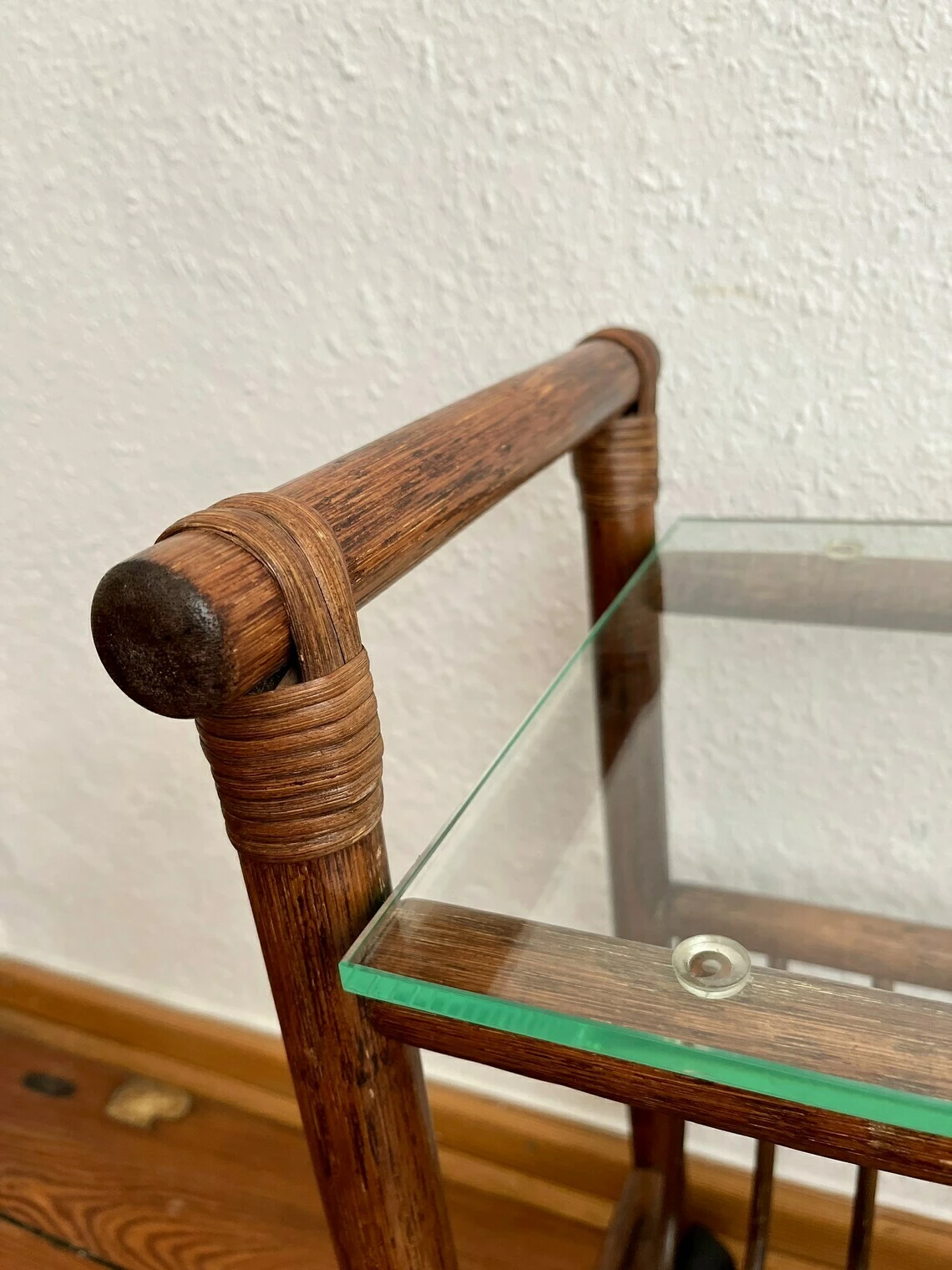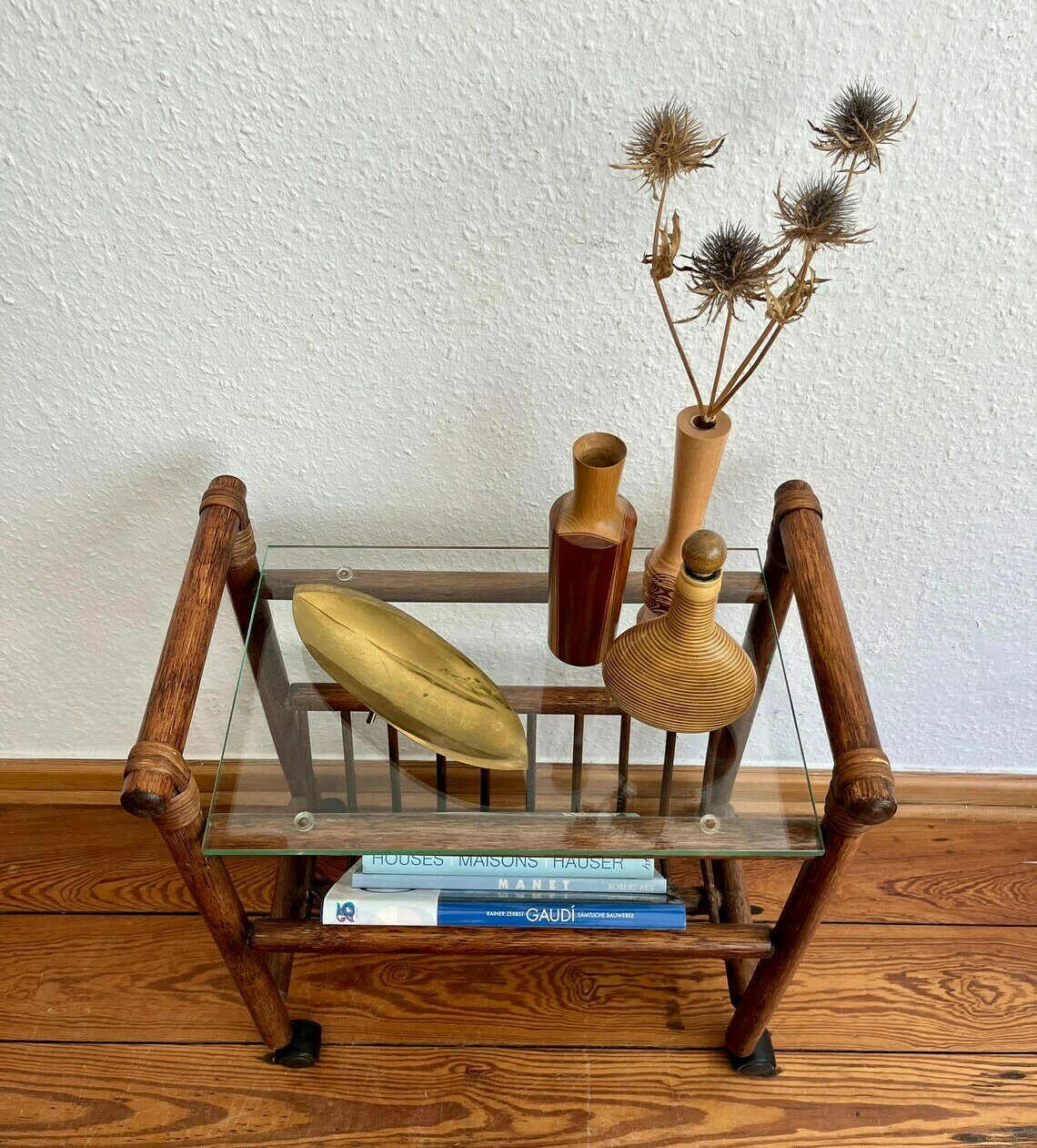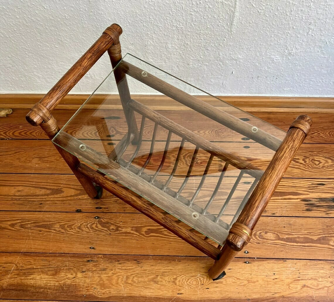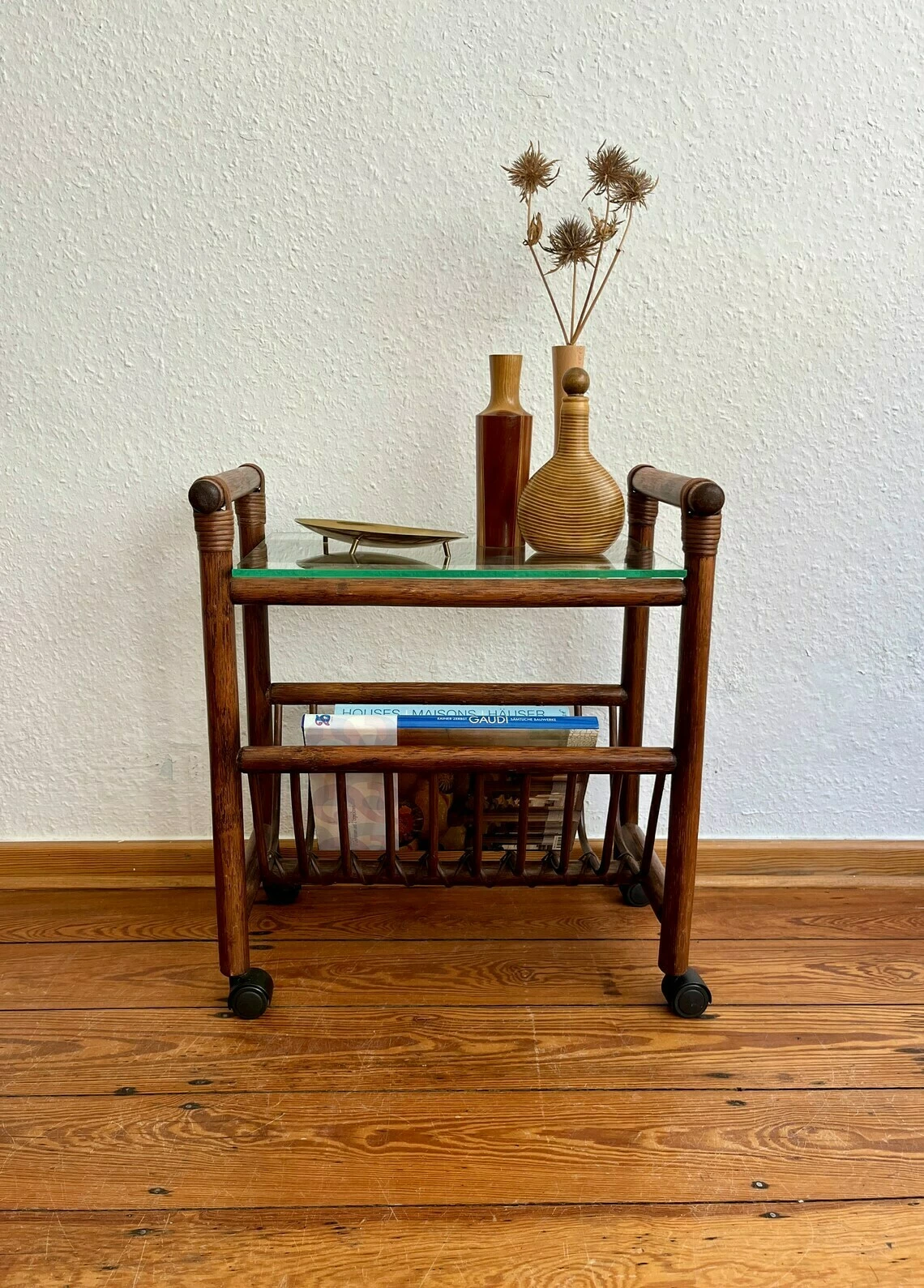 Mid Century 50s 60s magazine rack made of bamboo and rattan with a glass top (without decoration).