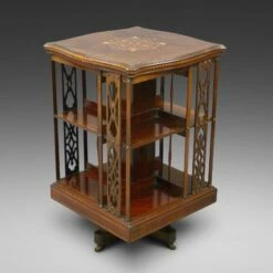 A fine quality inlaid revolving bookcase possibly by Mapels & Co. In dense well figured mahogany, the bookcase is serpentine shaped all round and has a large floral roundel inlaid into the top The book supports are decoratively fretted. English. Circa 1880.