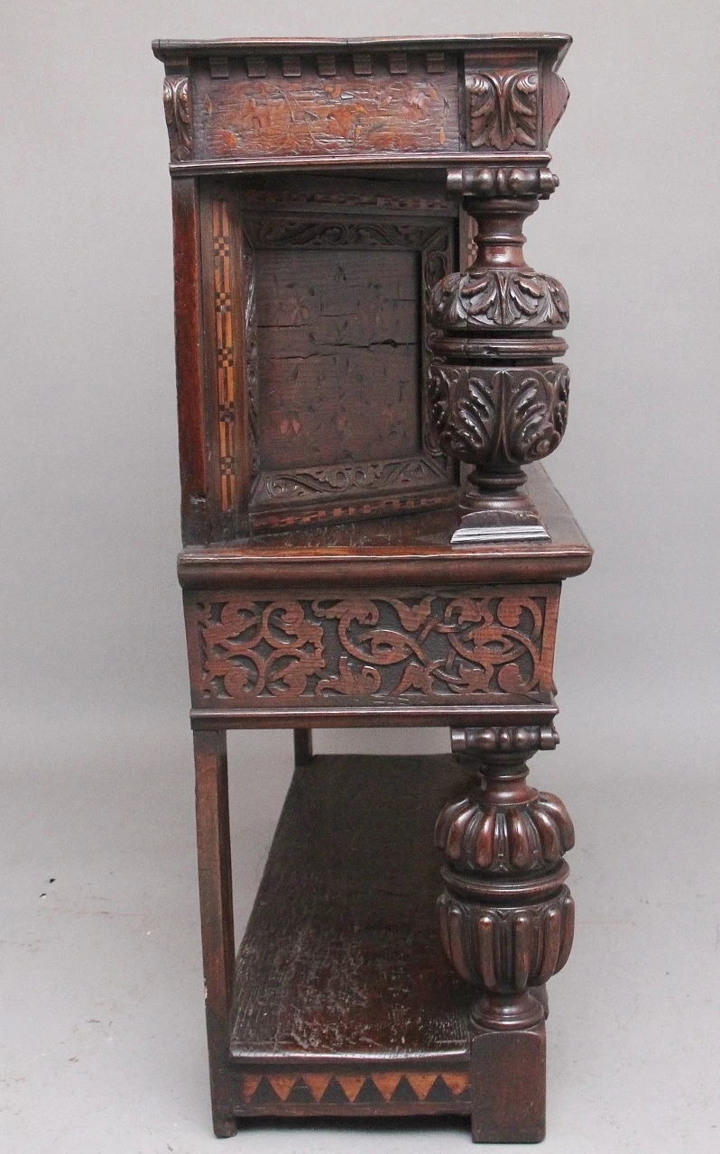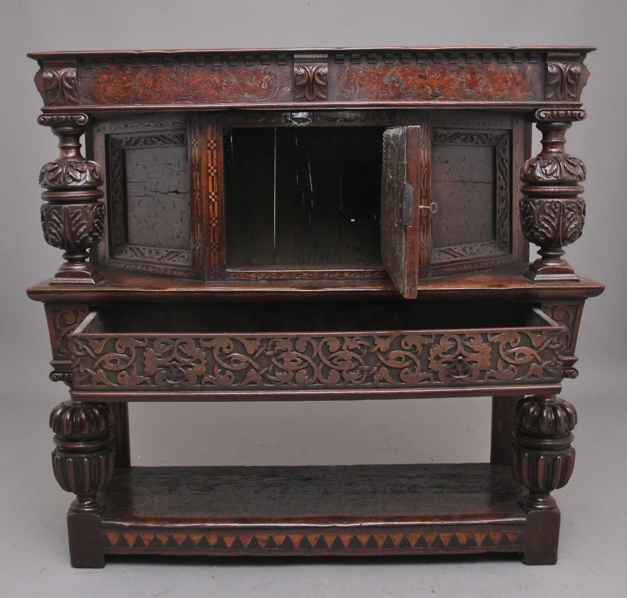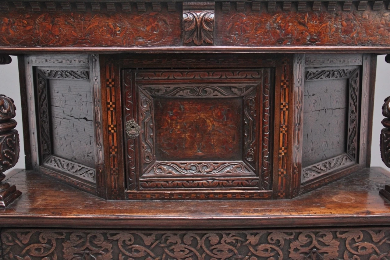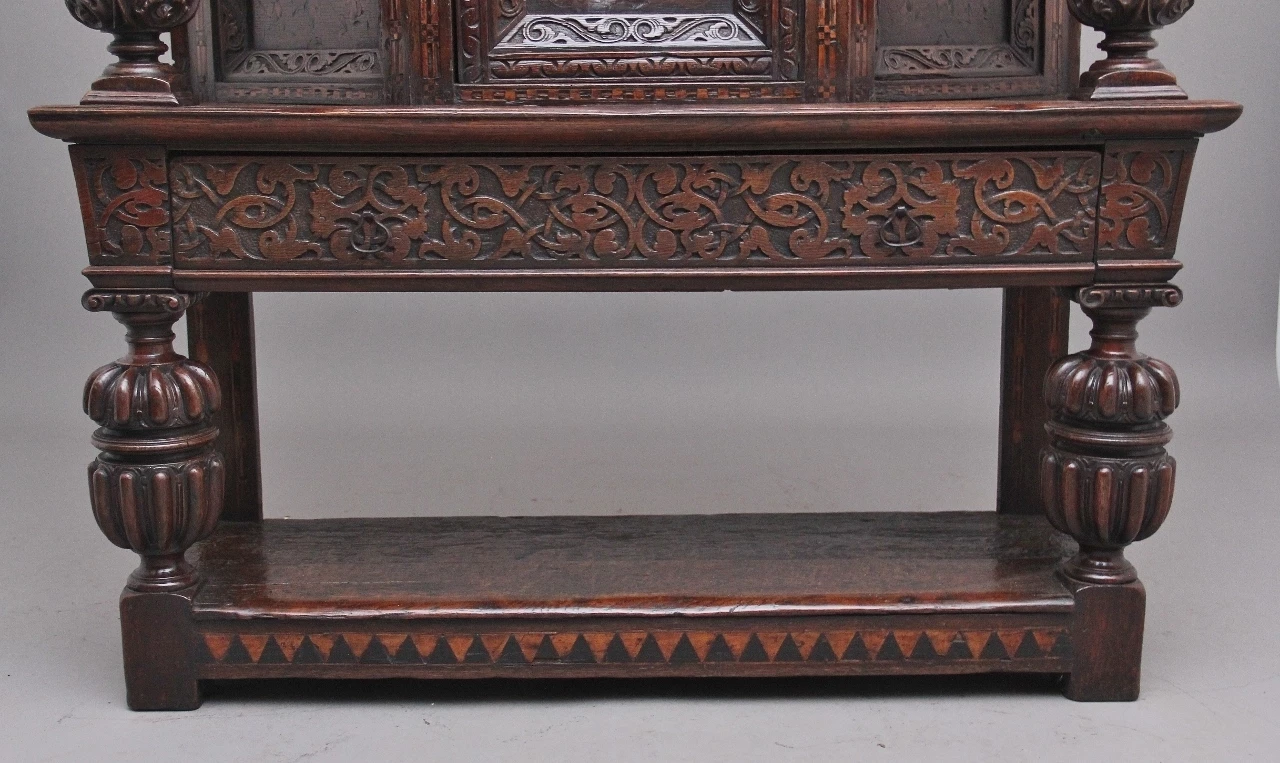 A very rare late 16th Century oak court cupboard dating from the Tudor period, having a wonderfully rich oak patina, beautifully carved supports and rails, with holly and bog oak inlay, the top section having a central cupboard with angled panels either side, a heavily carved oak lined frieze drawer below with brass ring handles.