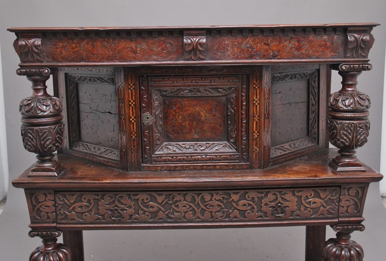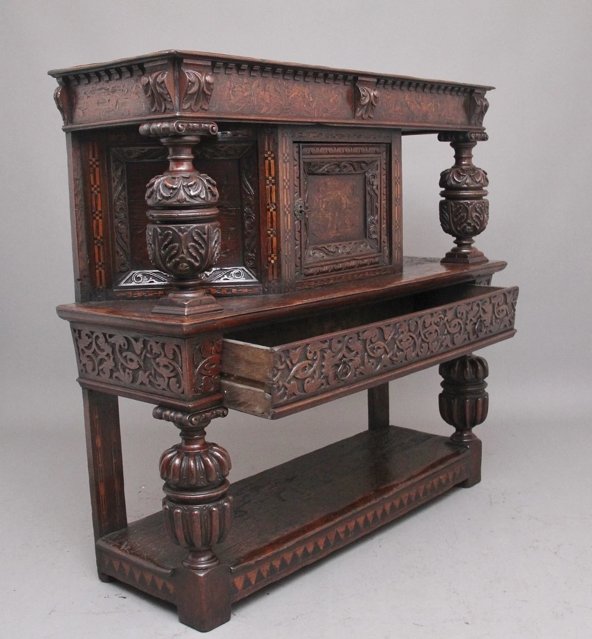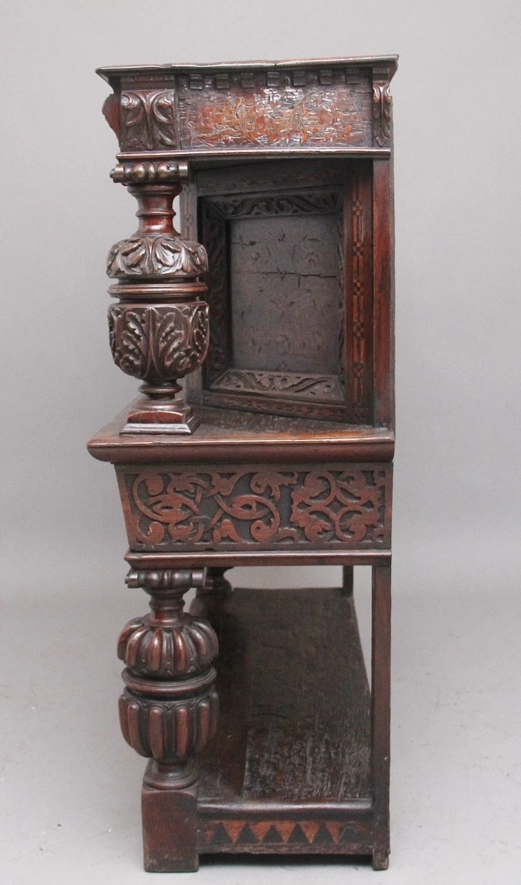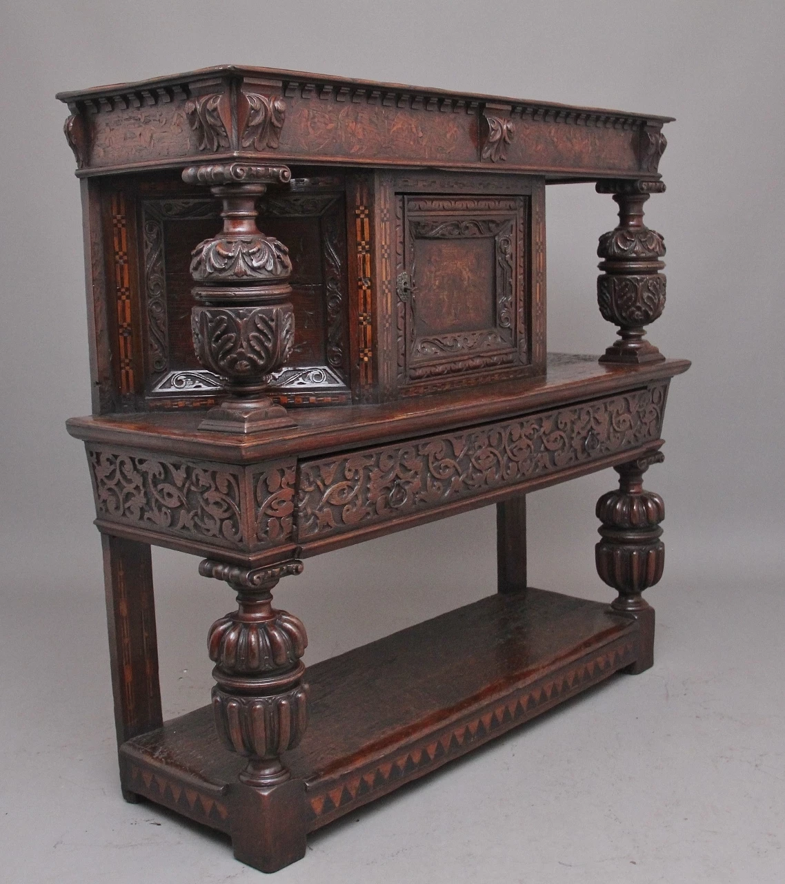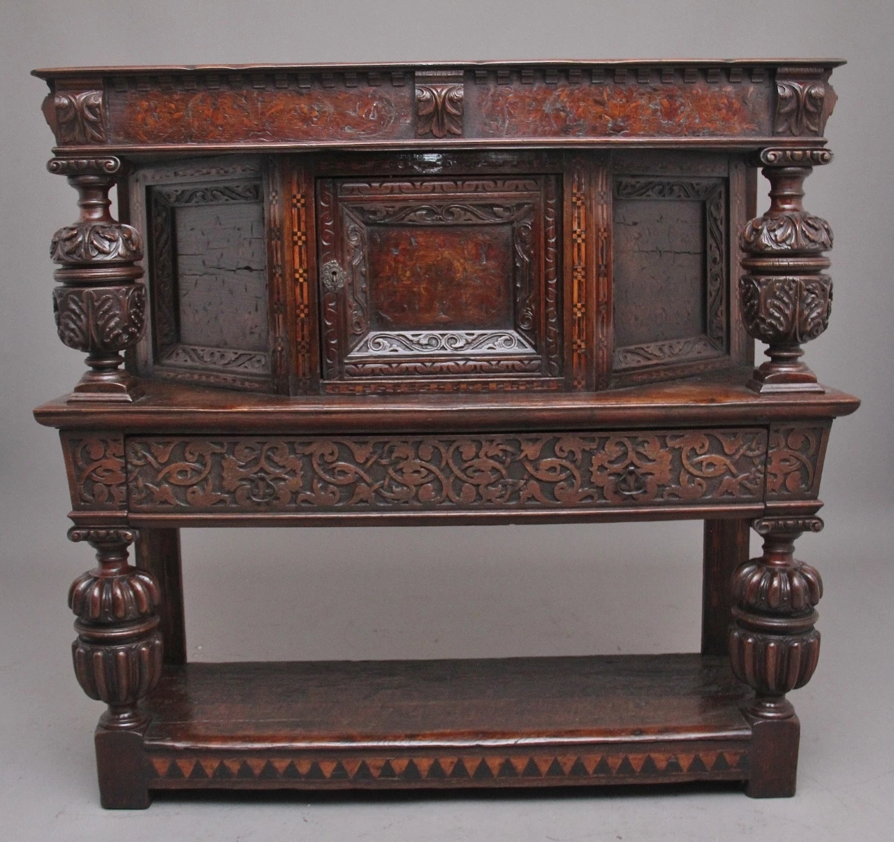 A very rare late 16th Century oak court cupboard dating from the Tudor period, having a wonderfully rich oak patina, beautifully carved supports and rails, with holly and bog oak inlay, the top section having a central cupboard with angled panels either side, a heavily carved oak lined frieze drawer below with brass ring handles.