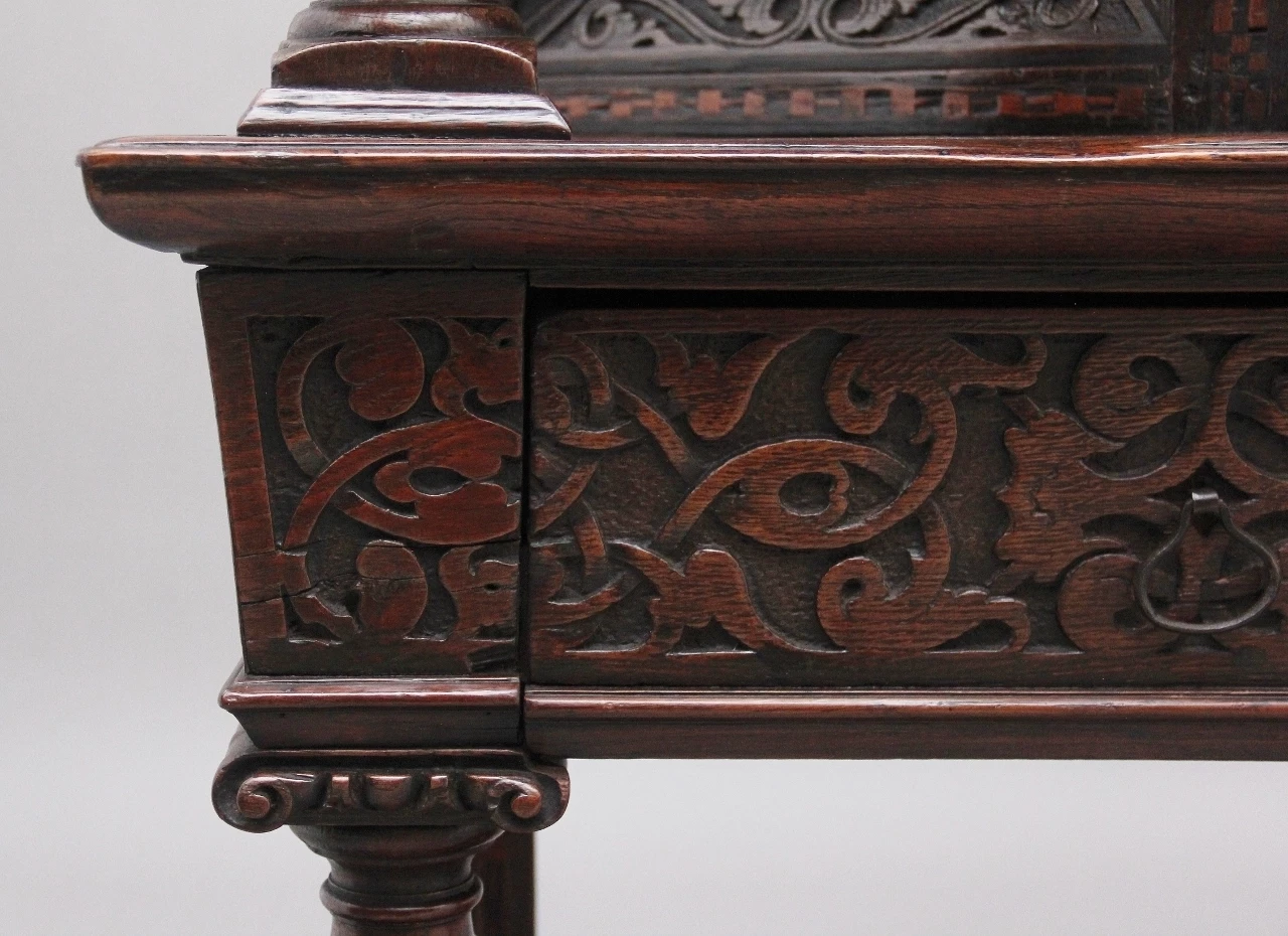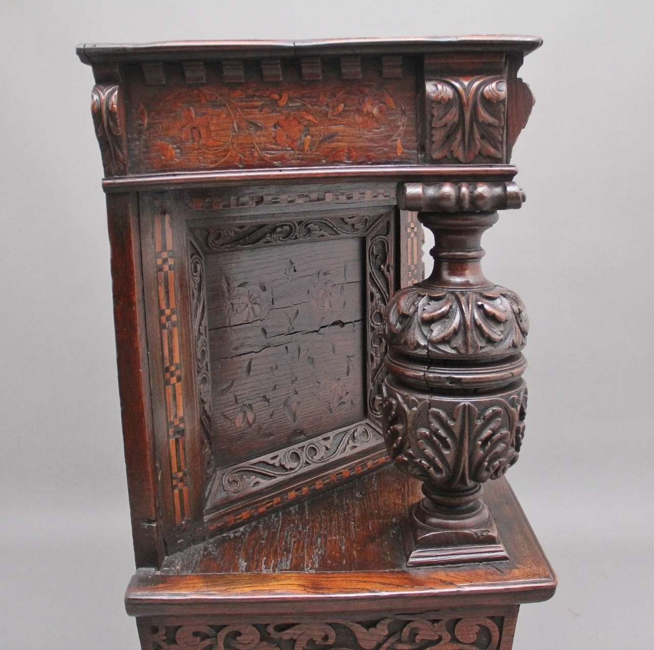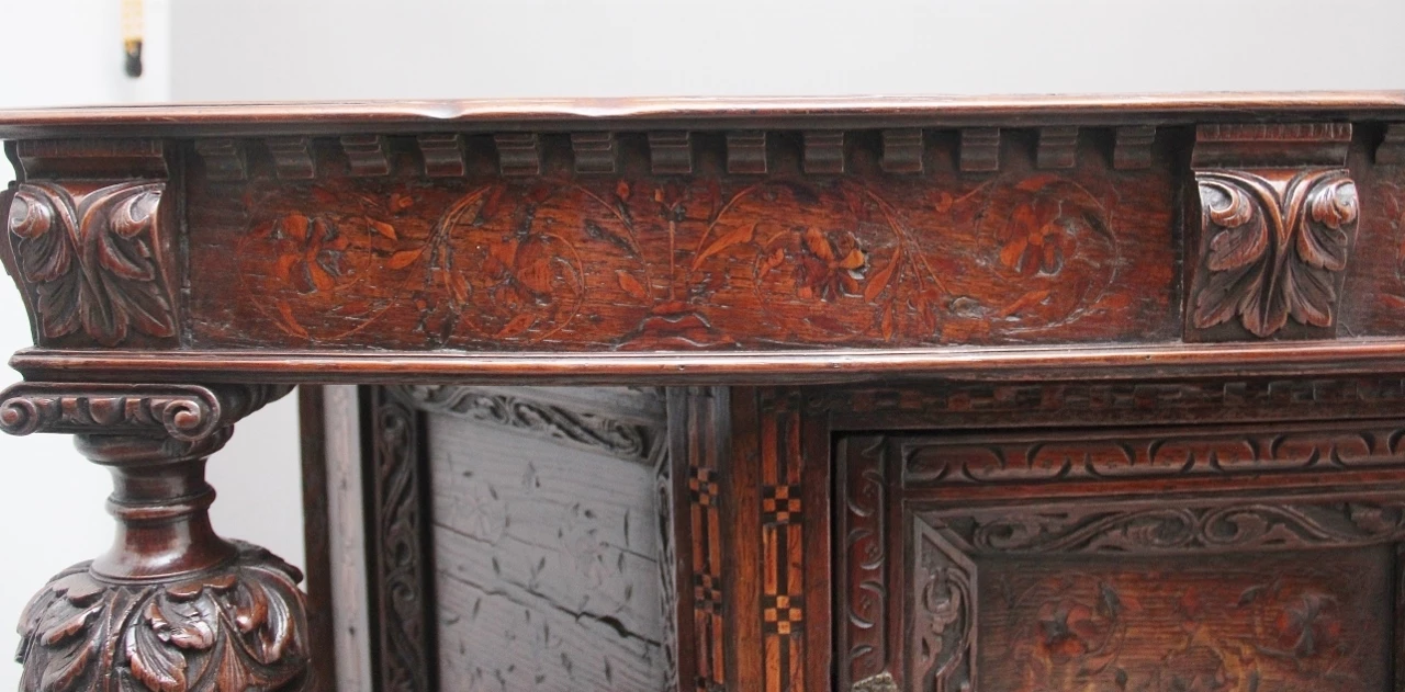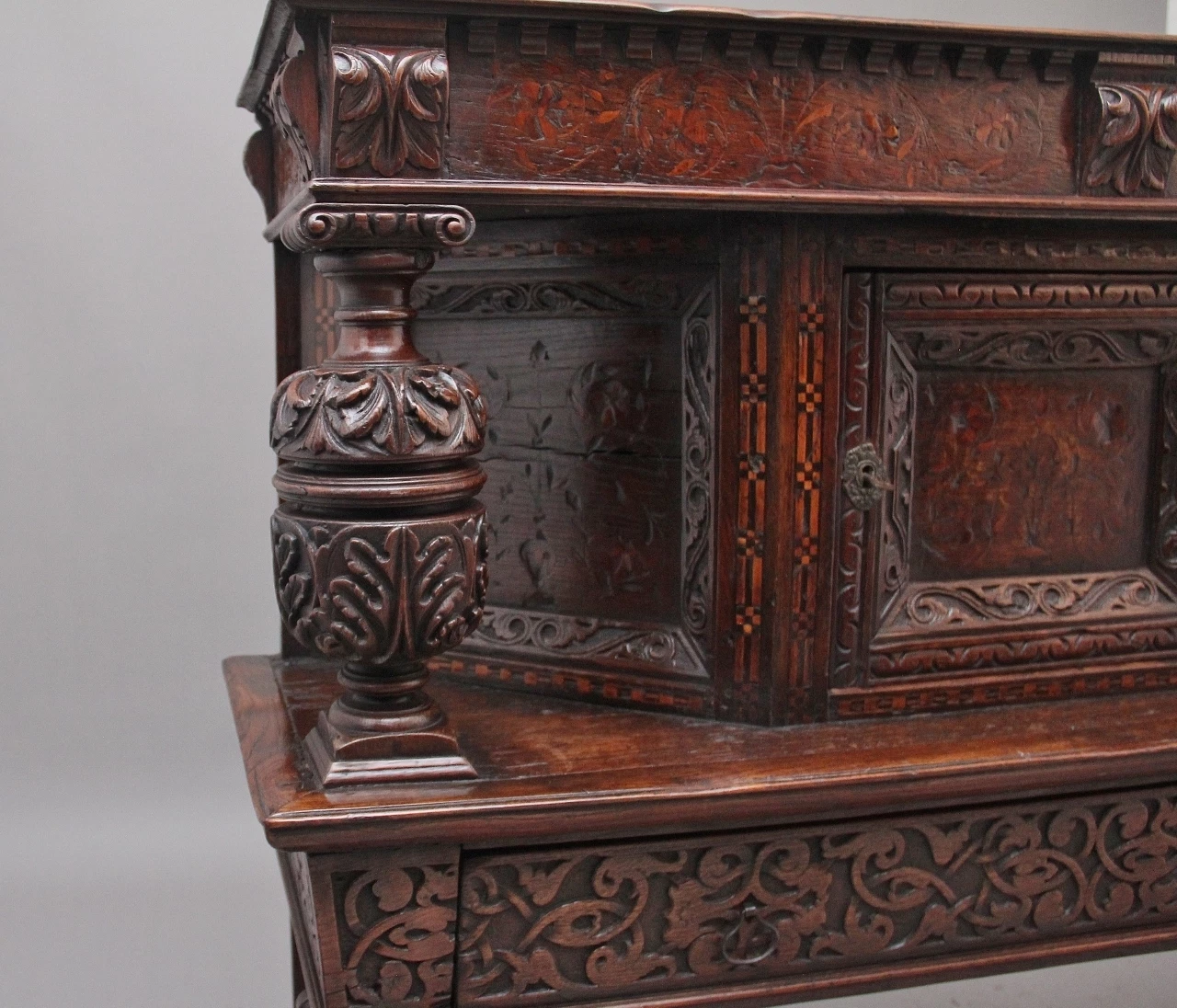 A very rare late 16th Century oak court cupboard dating from the Tudor period, having a wonderfully rich oak patina, beautifully carved supports and rails, with holly and bog oak inlay, the top section having a central cupboard with angled panels either side, a heavily carved oak lined frieze drawer below with brass ring handles.