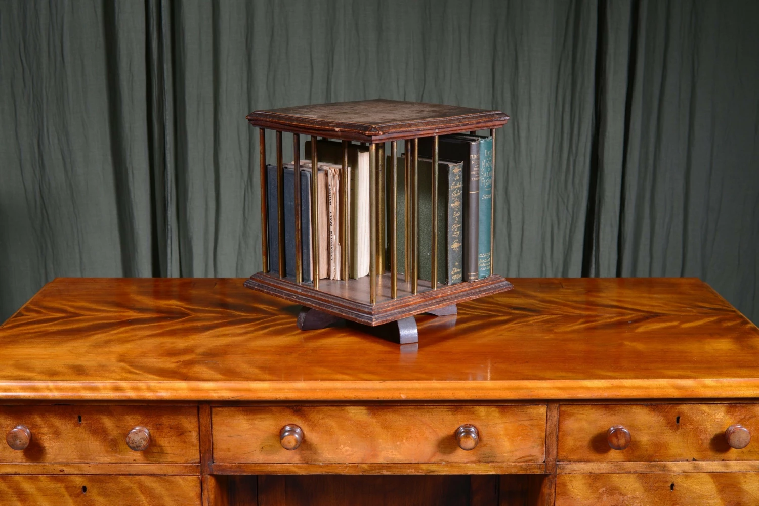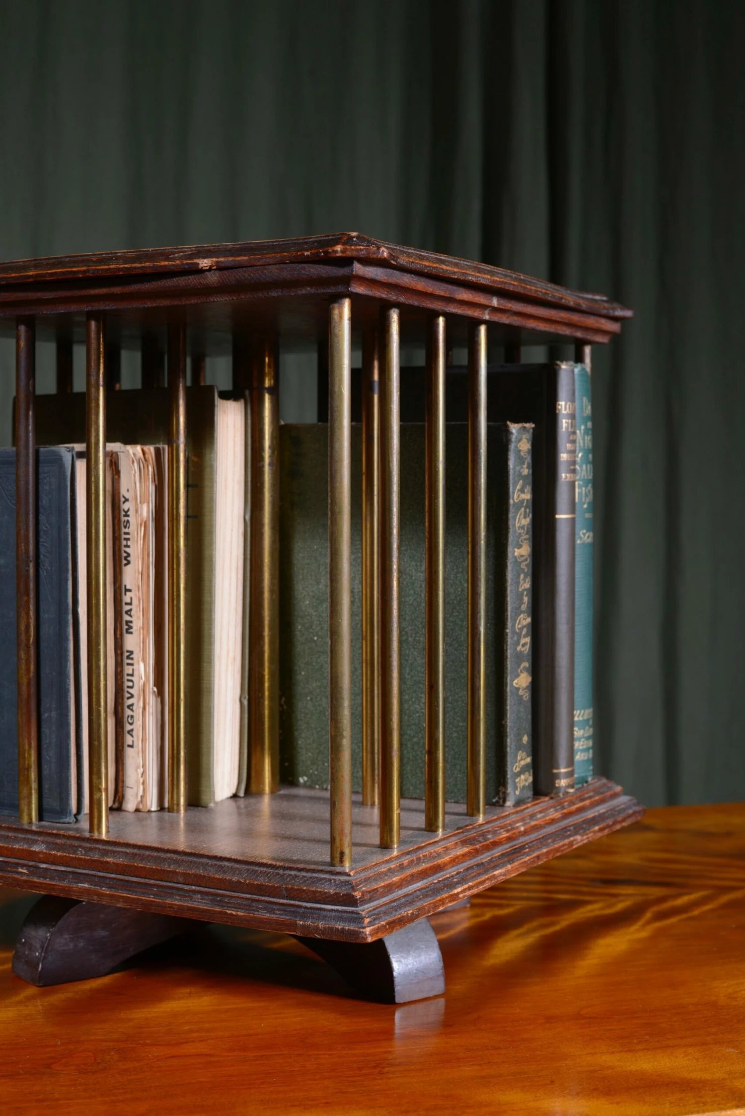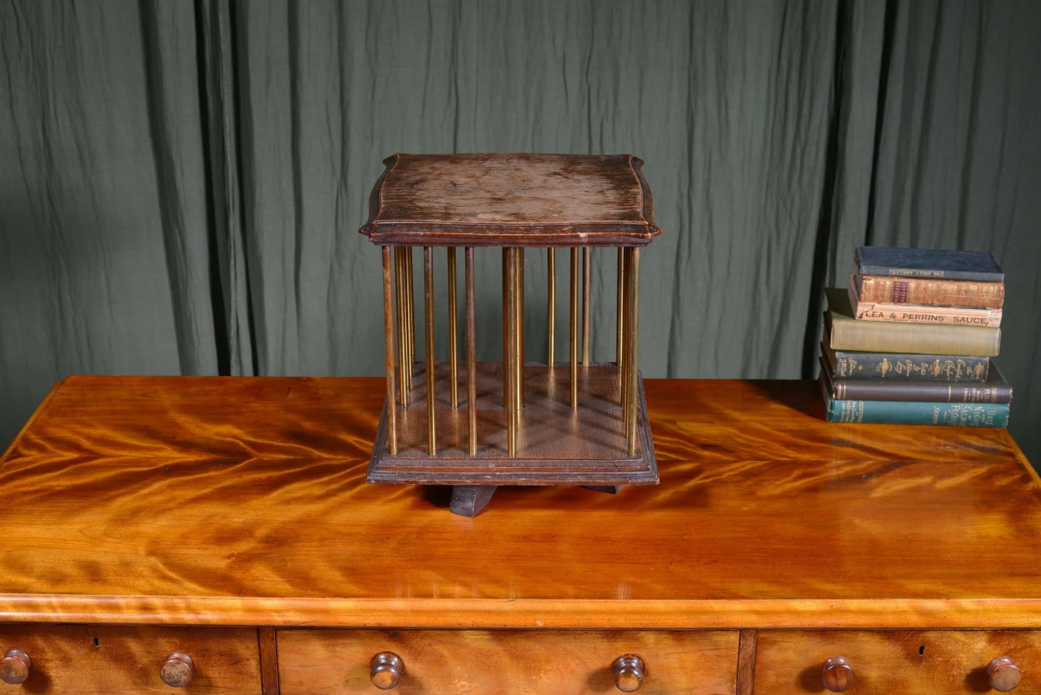 A smart little Edwardian tabletop oak revolving bookcase, with brass pillars, to hold 4 groups of books. Label to underneath ‘Rd At Patent Office, Designs Branch No 245908.’