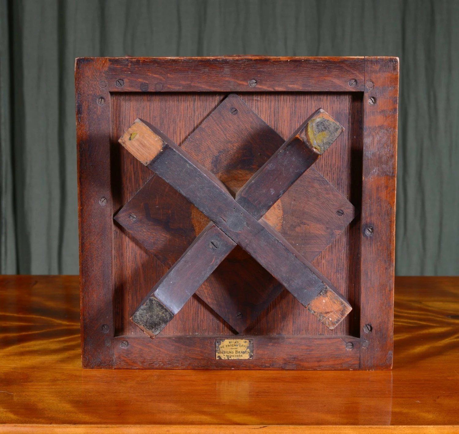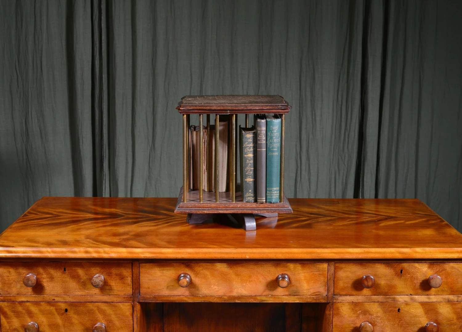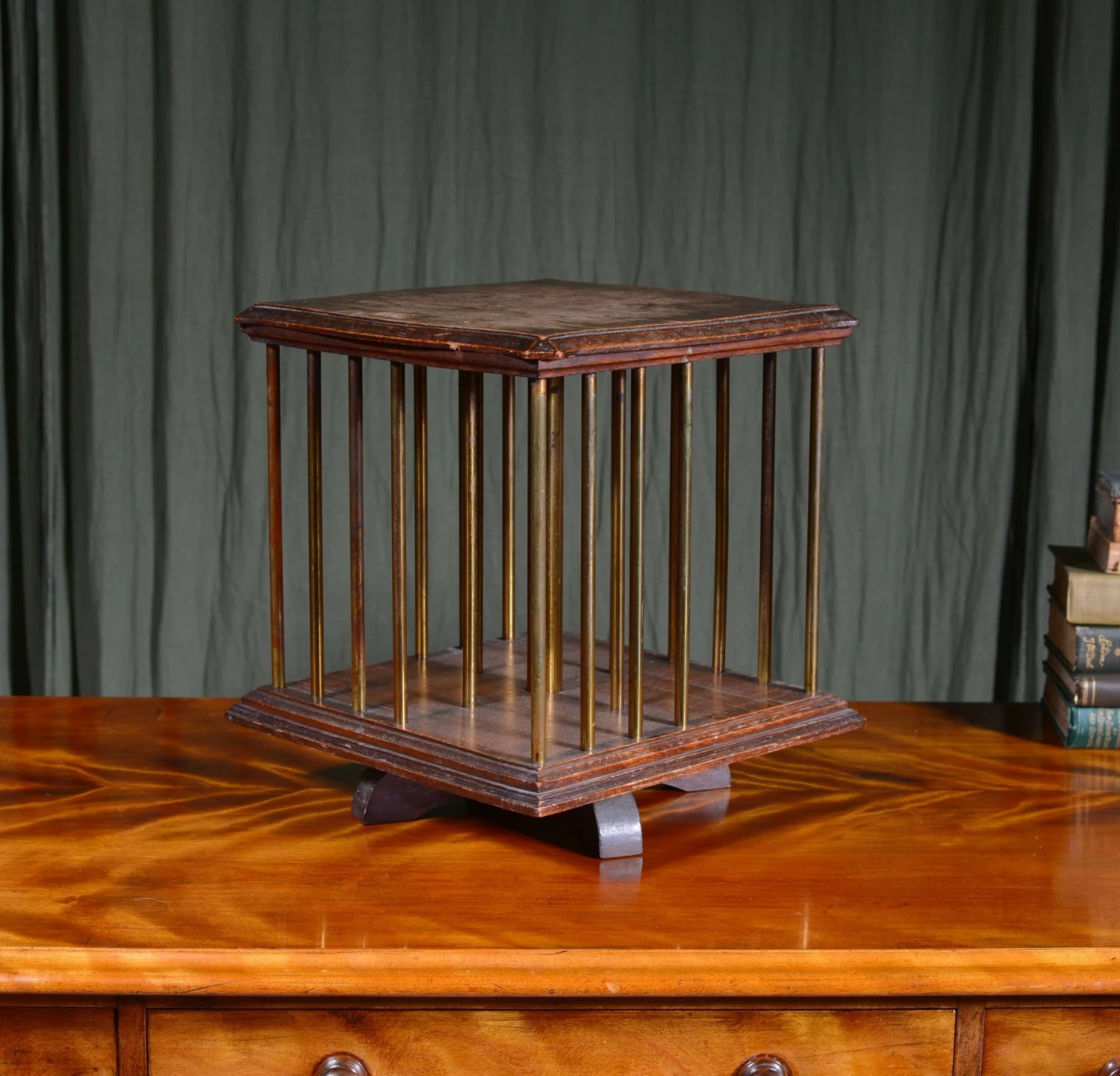 A smart little Edwardian tabletop oak revolving bookcase, with brass pillars, to hold 4 groups of books. Label to underneath ‘Rd At Patent Office, Designs Branch No 245908.’