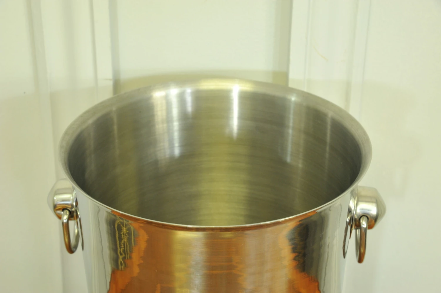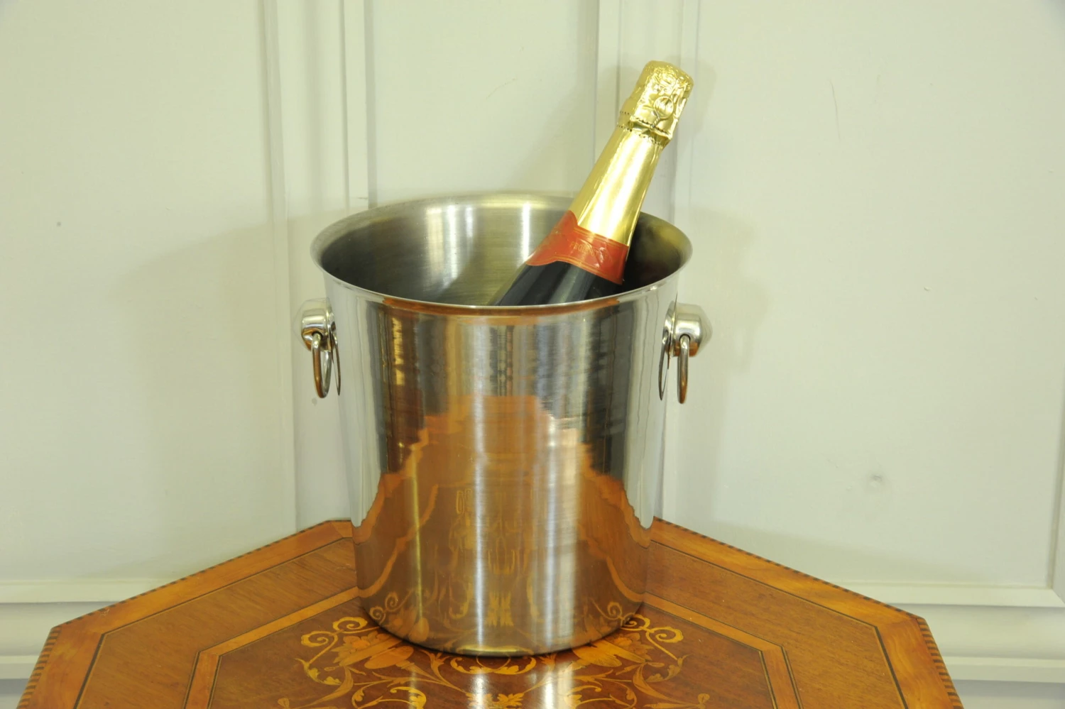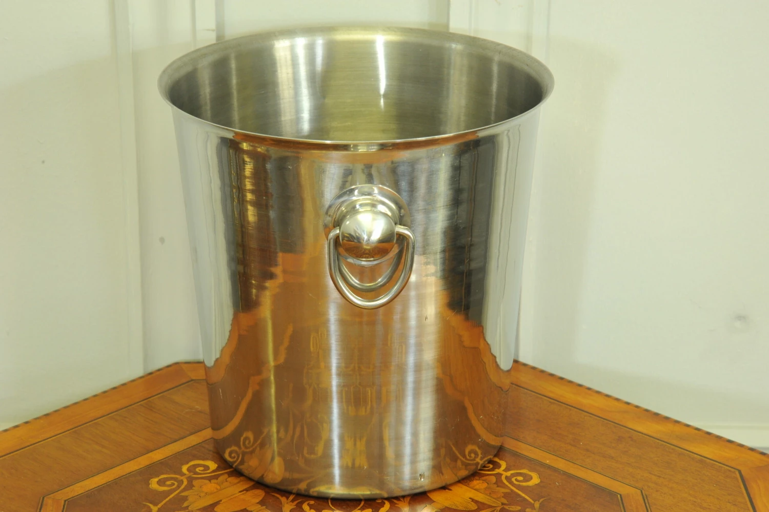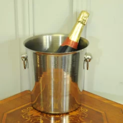 A striking vintage Champagne ice bucket made by the well known manufacturer of Vogalu, in heavy stainless steel form and with classic drop rings to each side, ready to be enjoyed.