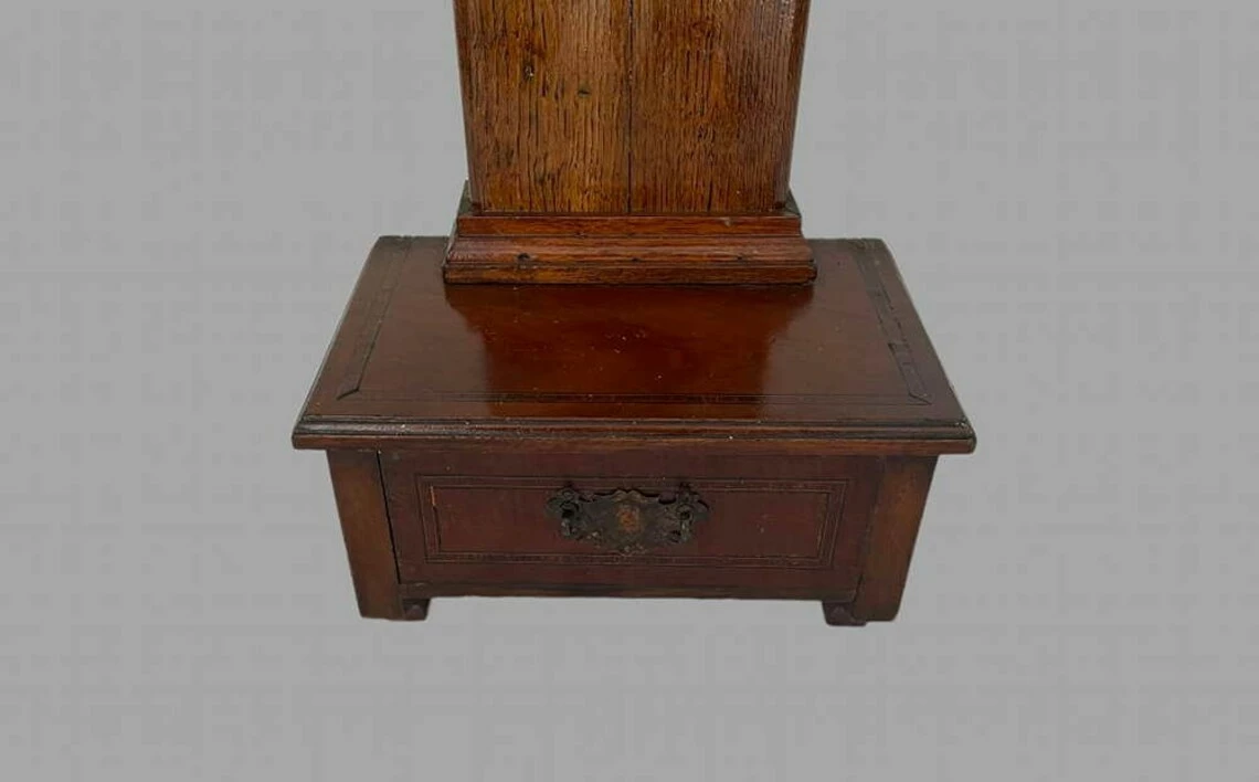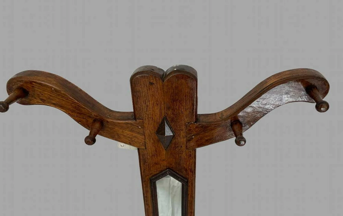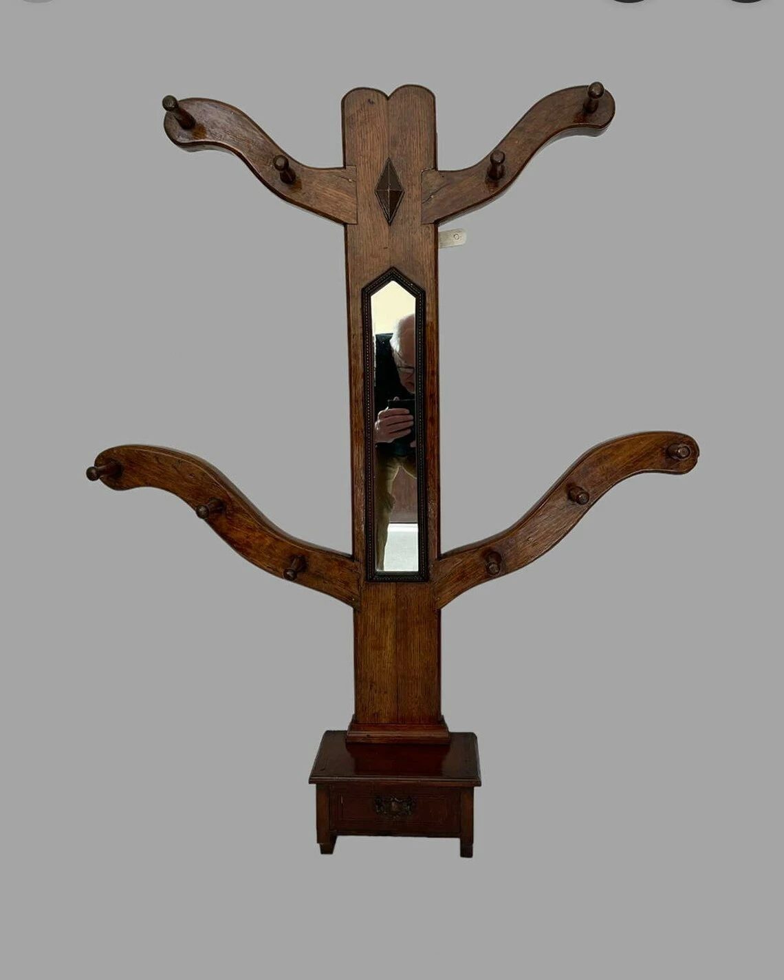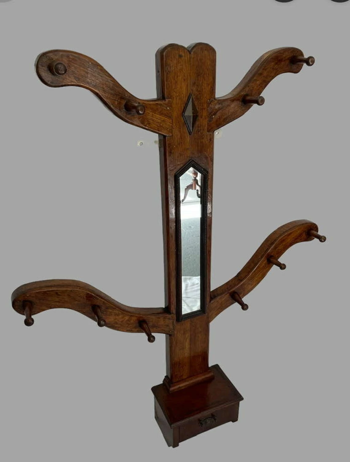 A Wall Hanging Victorian Oak Coat Stand with mirror to centre and six coat wooden points on two branches and draw to bottom.