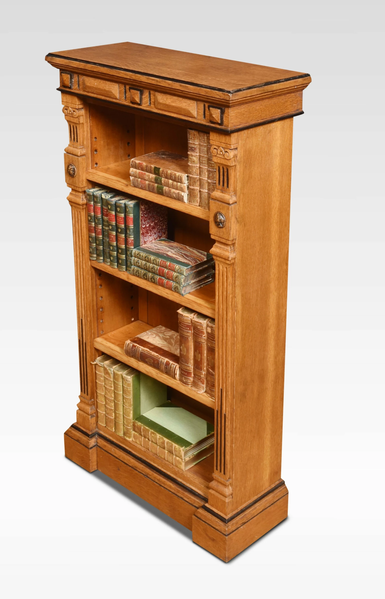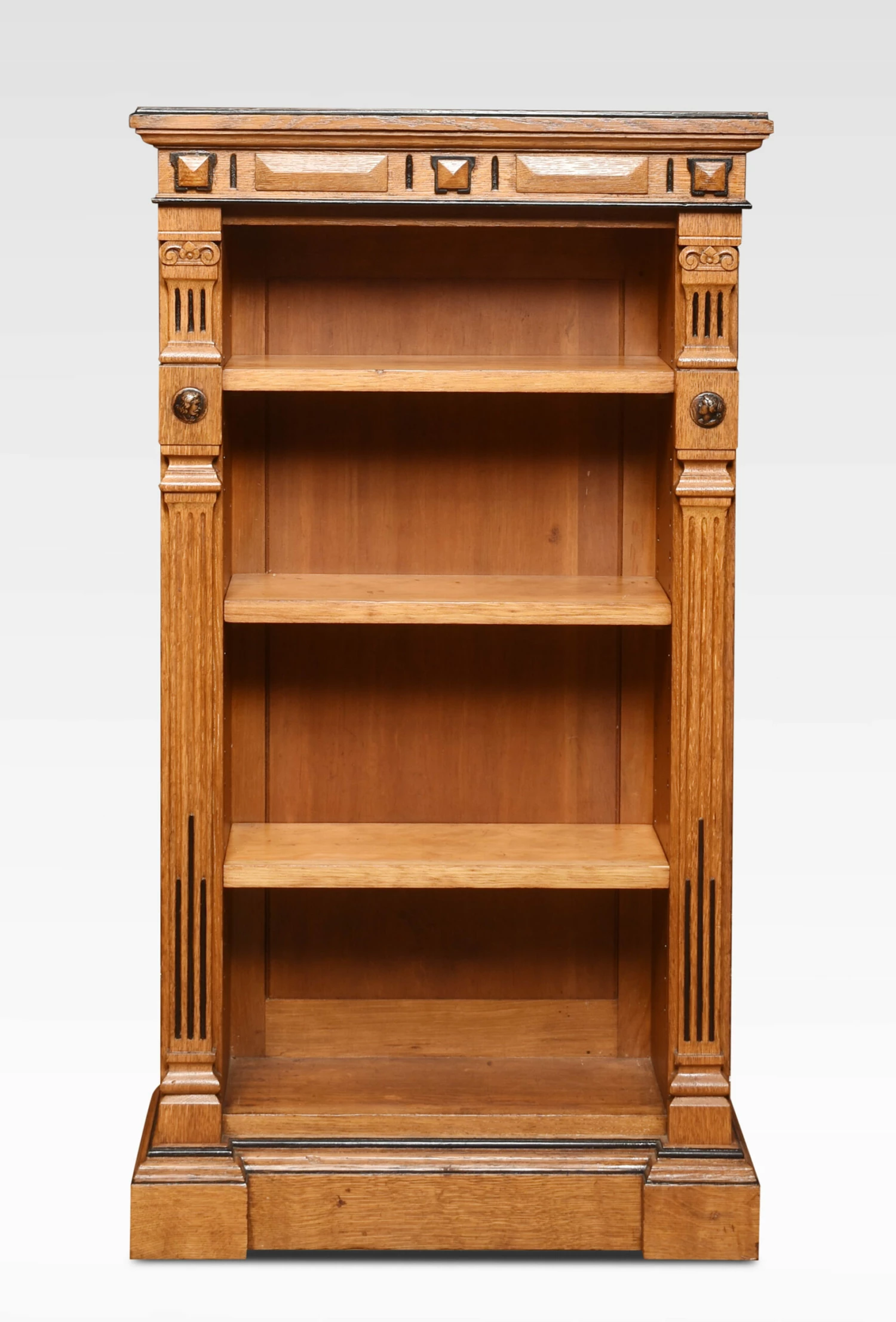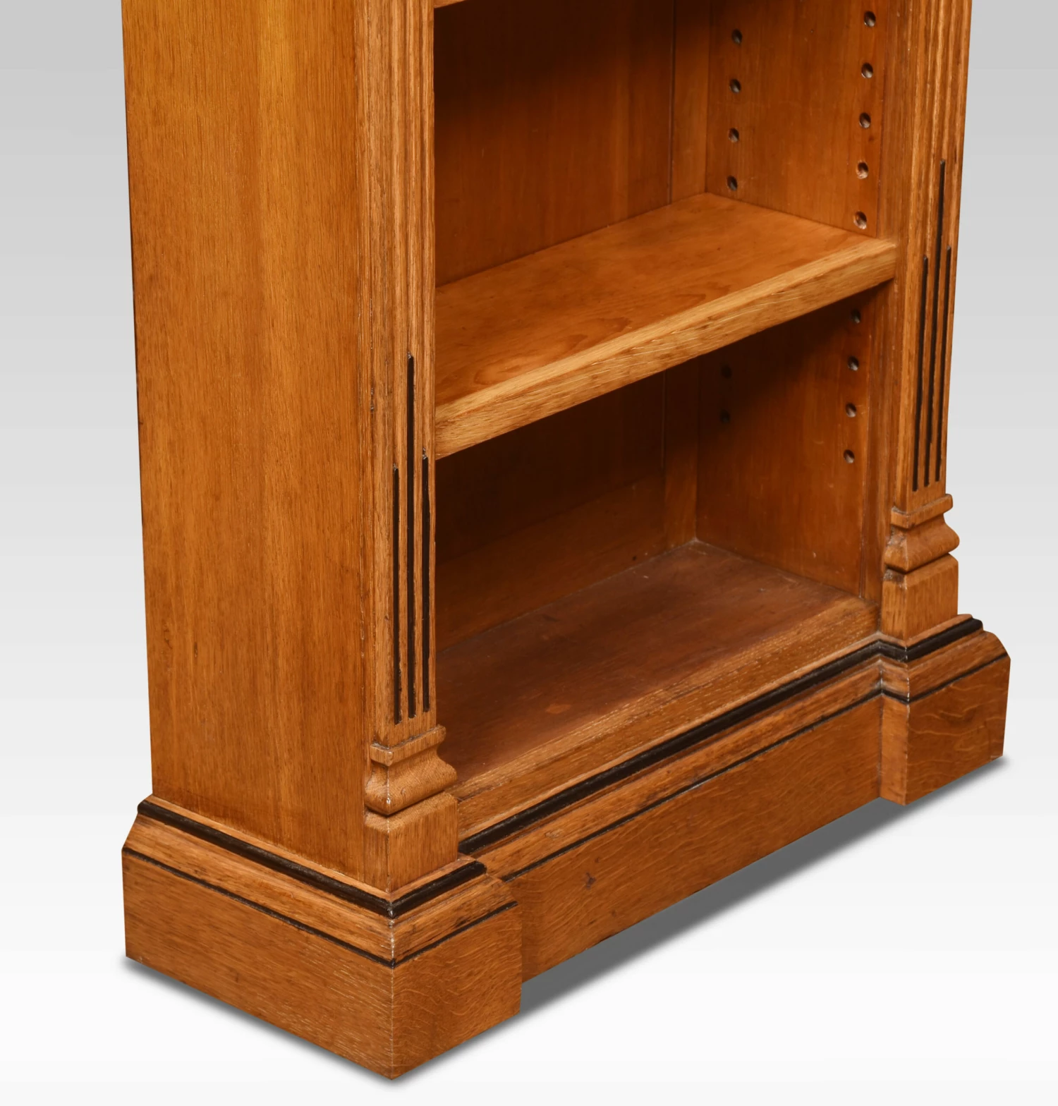 Aesthetic oak open bookcase of small proportions, the rectangular top above a carved frieze with ebonized detail, to the adjustable shelving flanked by reeded columns. All raised up on plinth base.