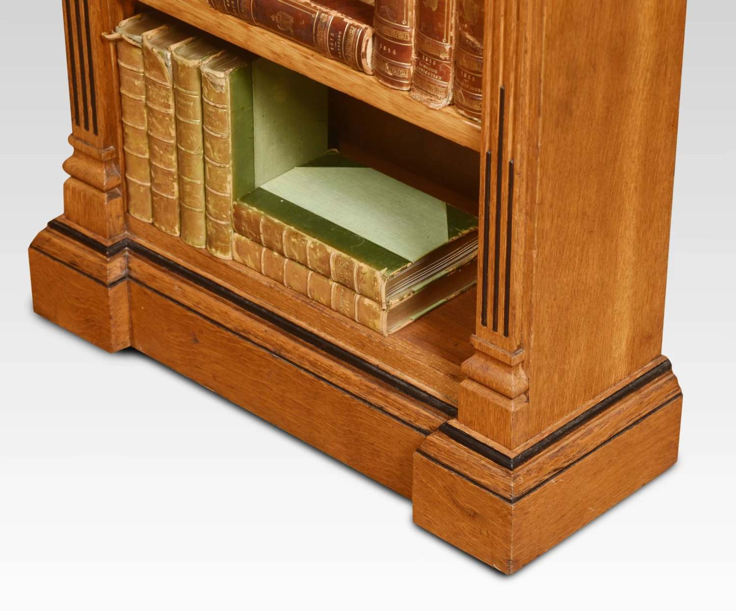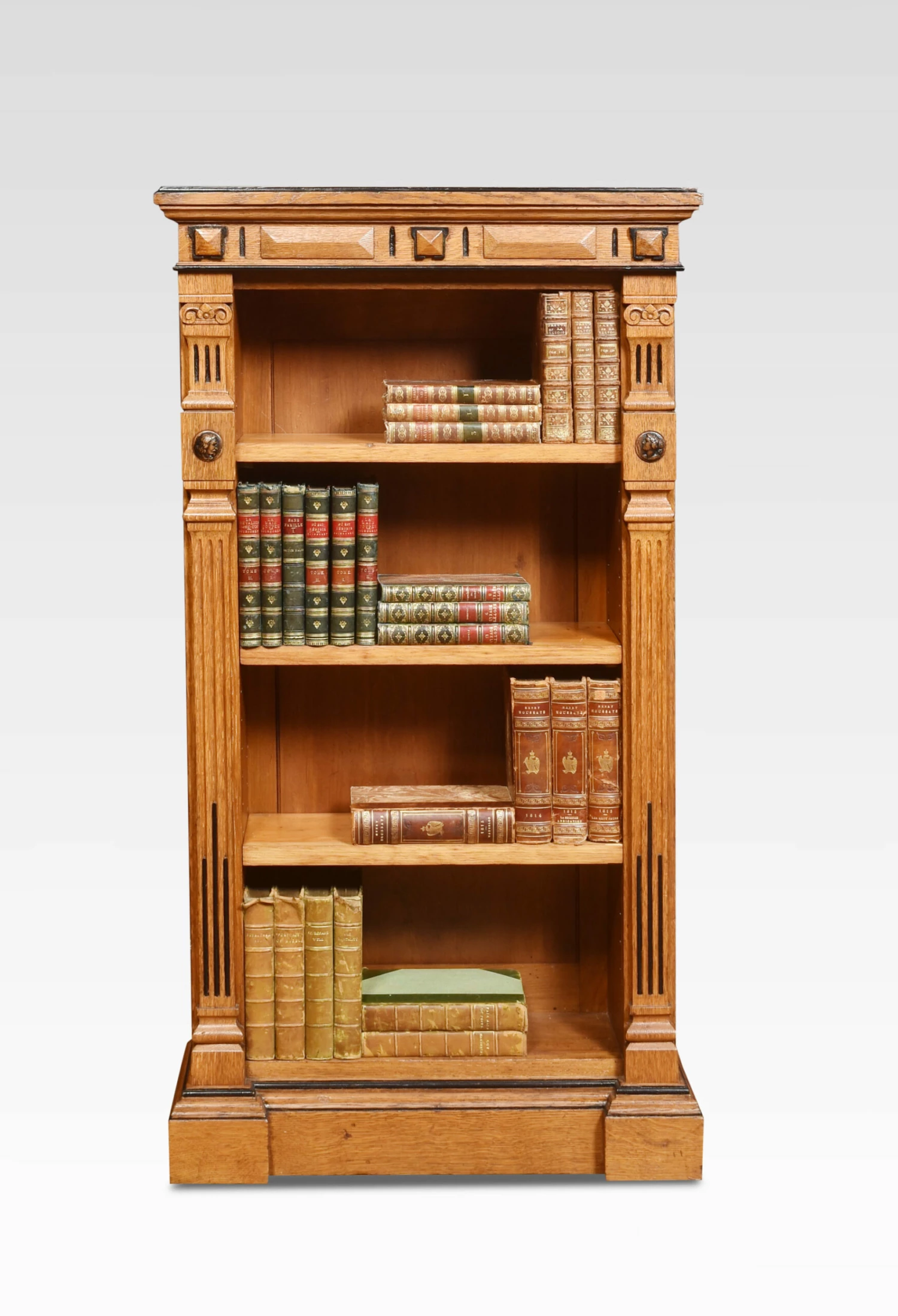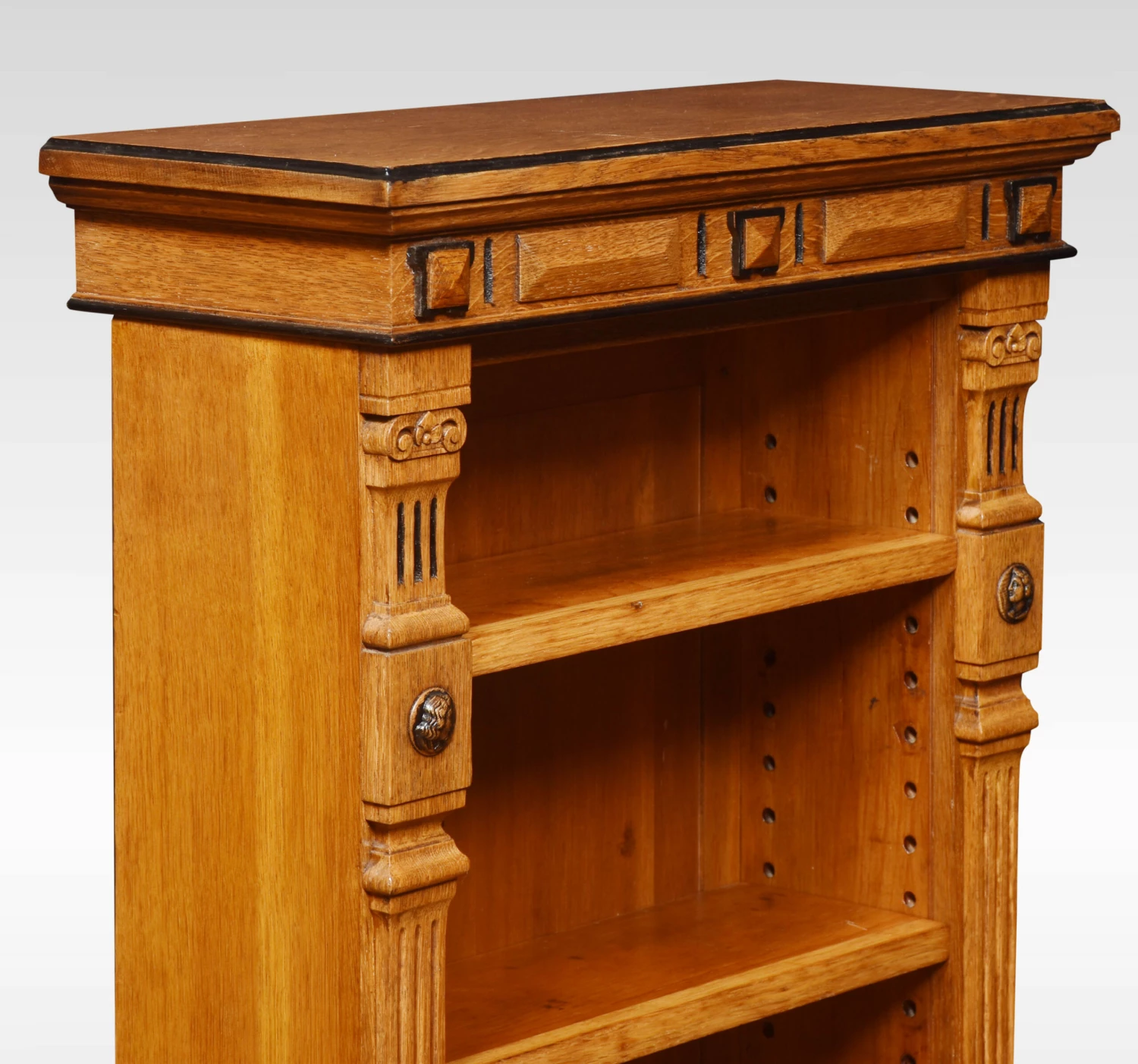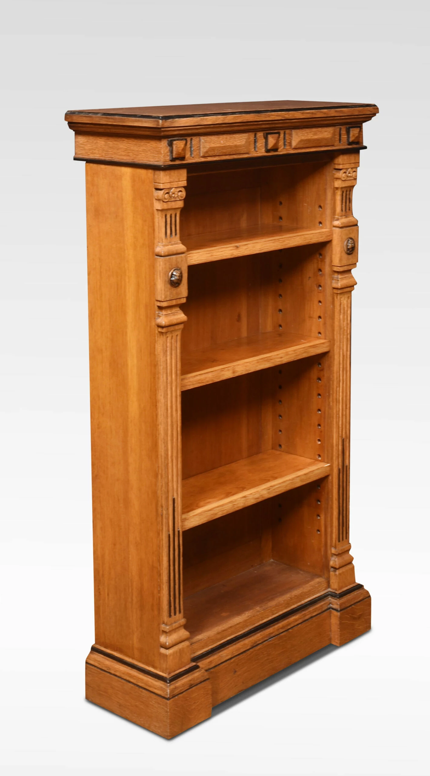 Aesthetic oak open bookcase of small proportions, the rectangular top above a carved frieze with ebonized detail, to the adjustable shelving flanked by reeded columns. All raised up on plinth base.