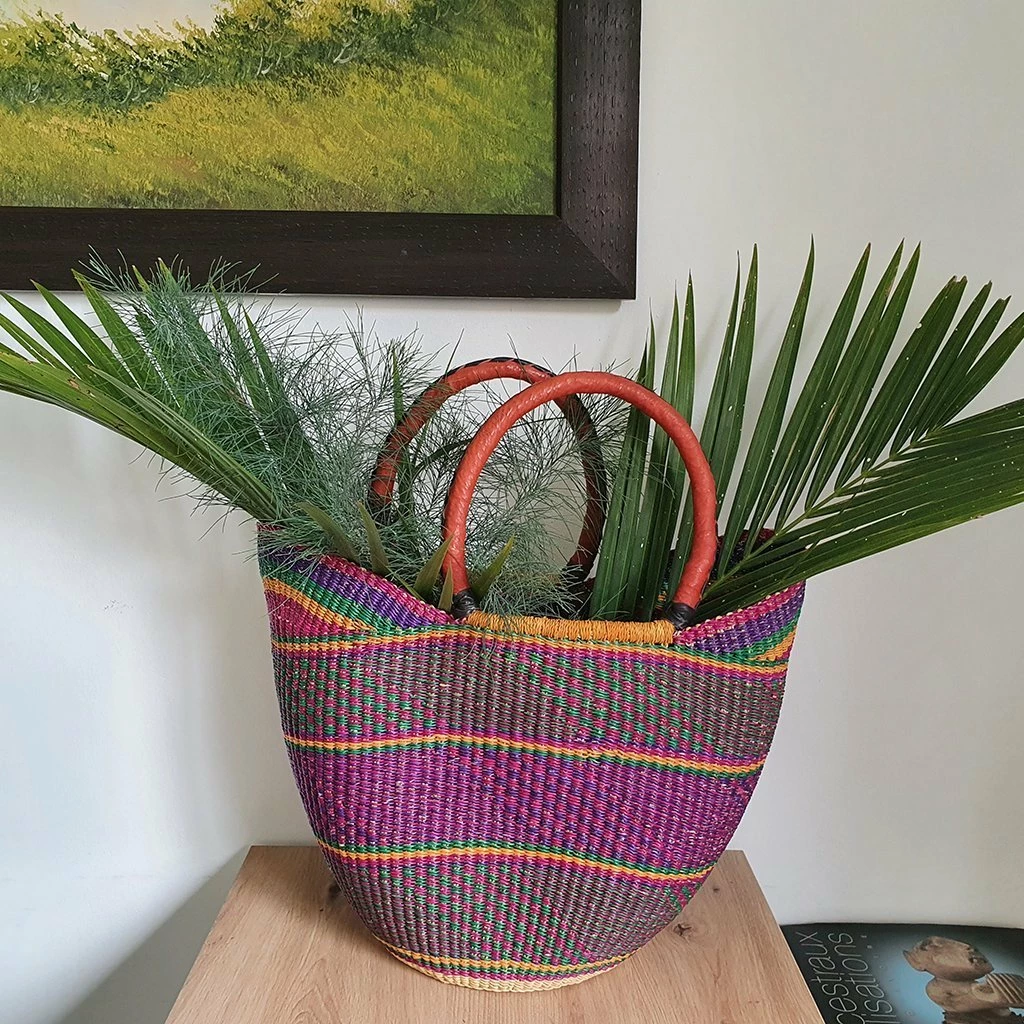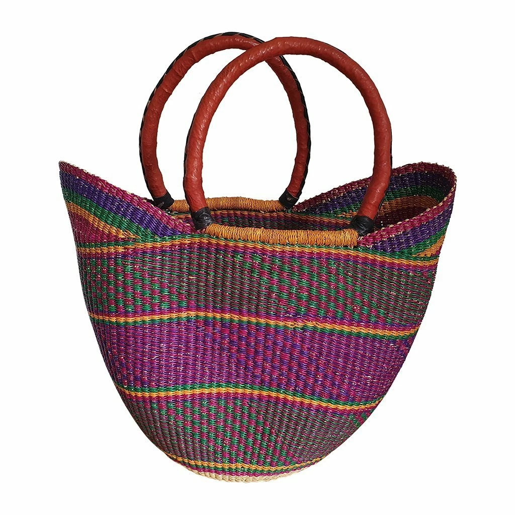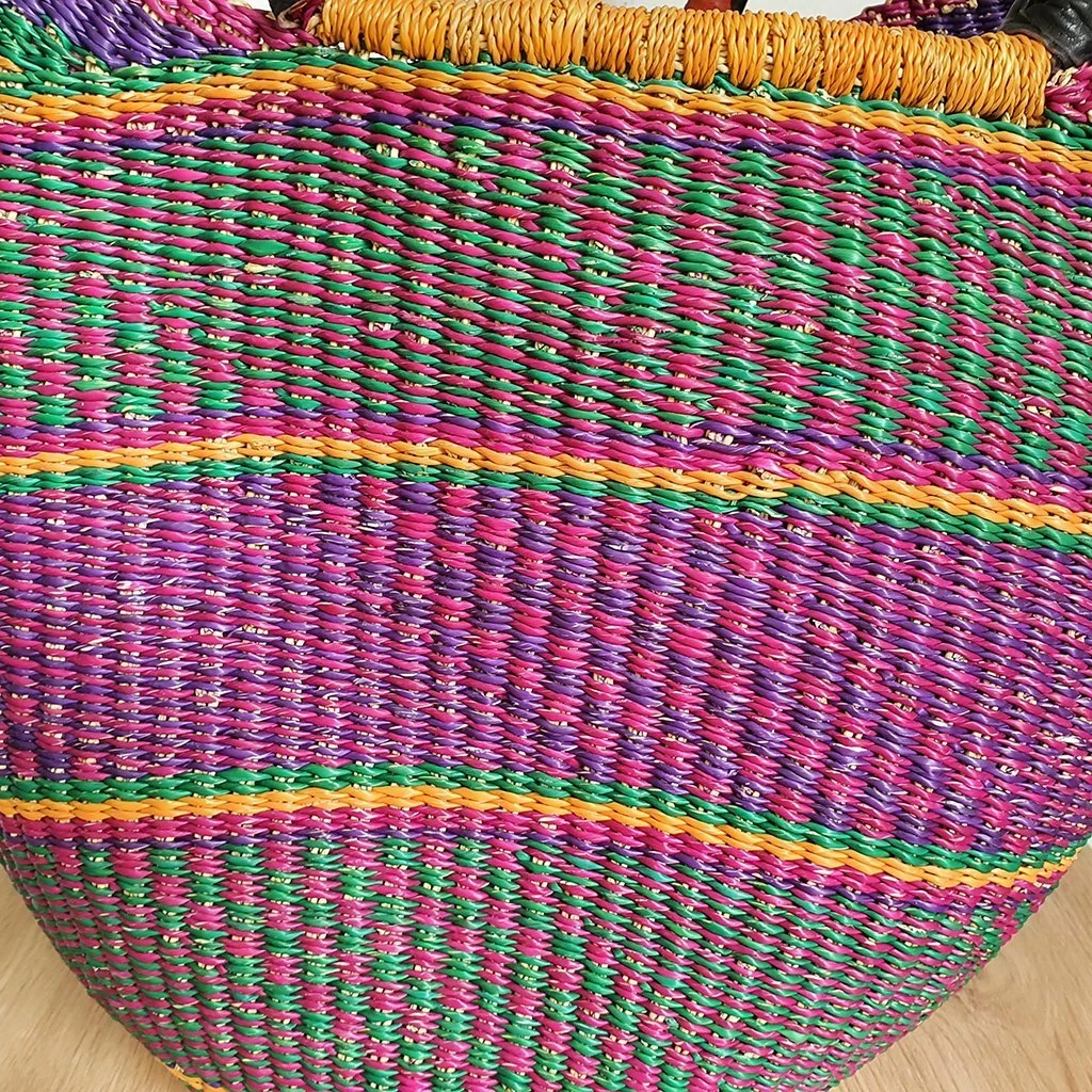 Beautiful, durable, all-natural Nyariga Bolga basket dyed with eco-friendly purple, green and yellow colors. This bag will be amazing for shopping at your local market or decor to your kitchen table as a fruit basket or flower basket in your living room.