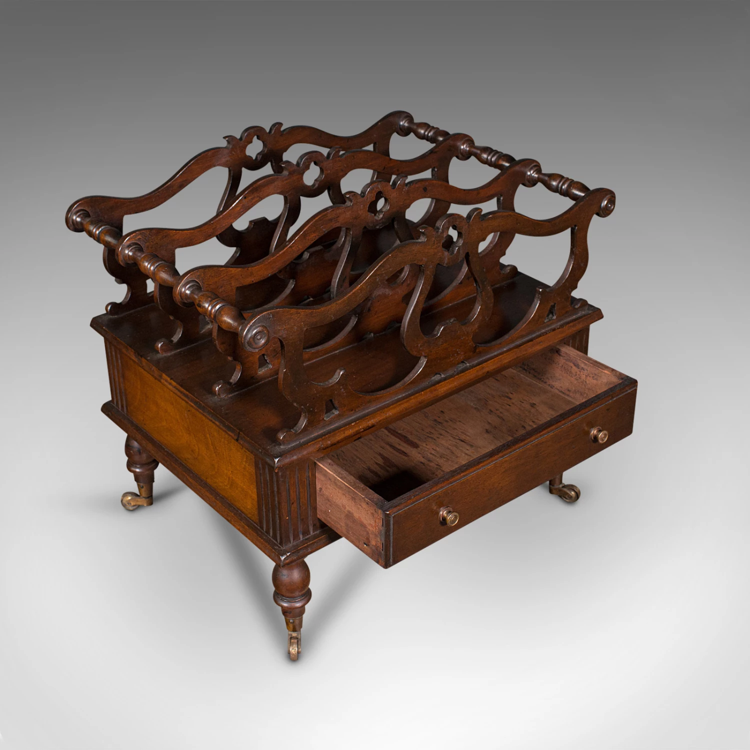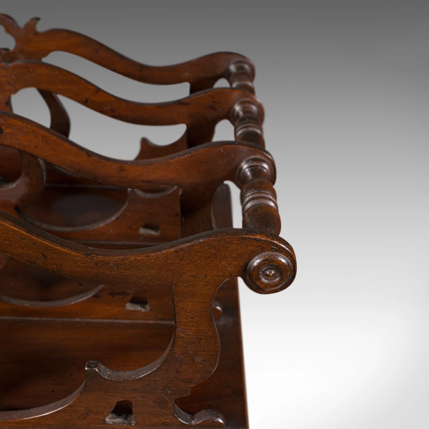 This is an antique Canterbury stand. An English, mahogany three sectioned magazine or newspaper rack, dating to the Victorian period, circa 1900.