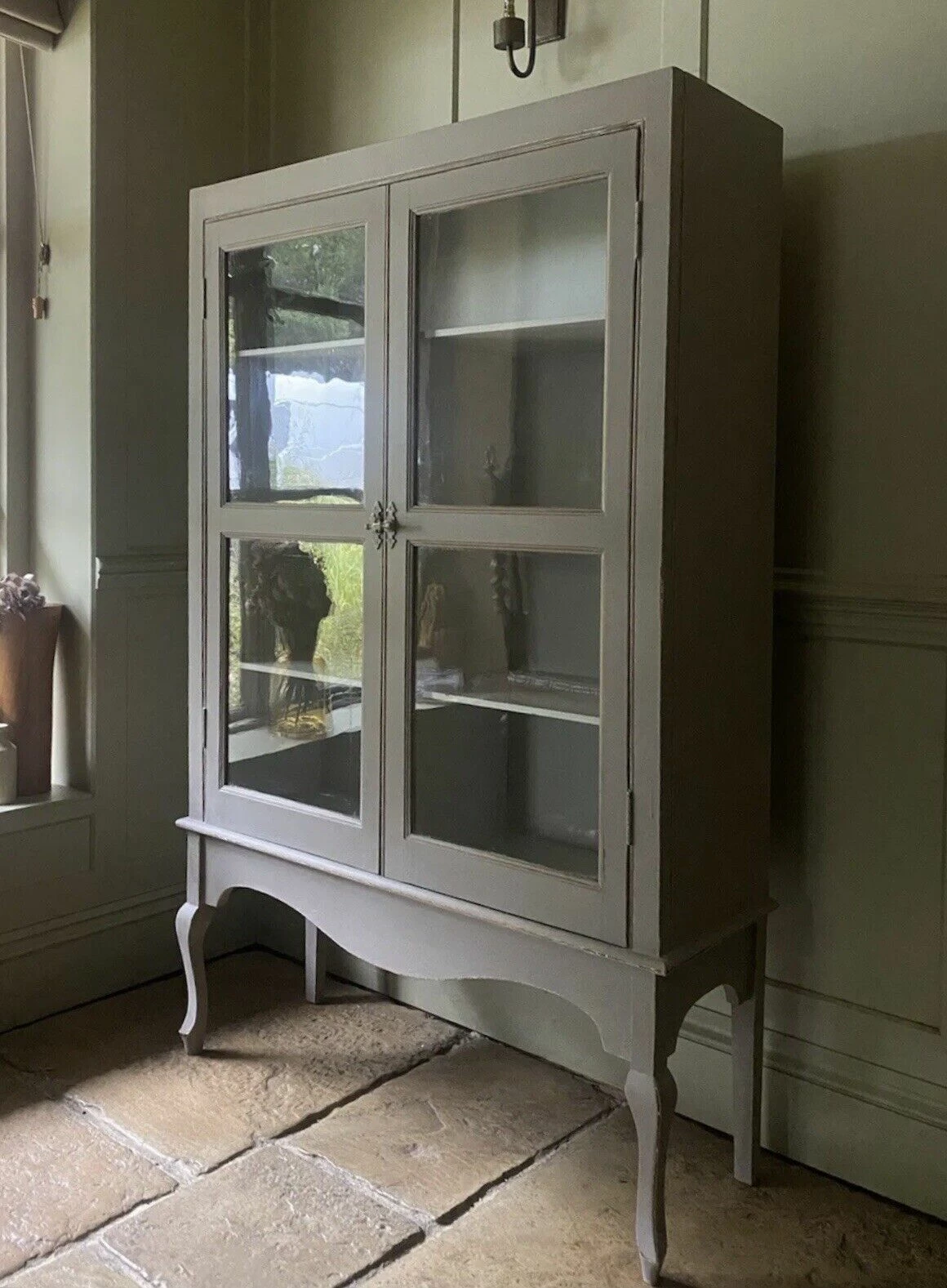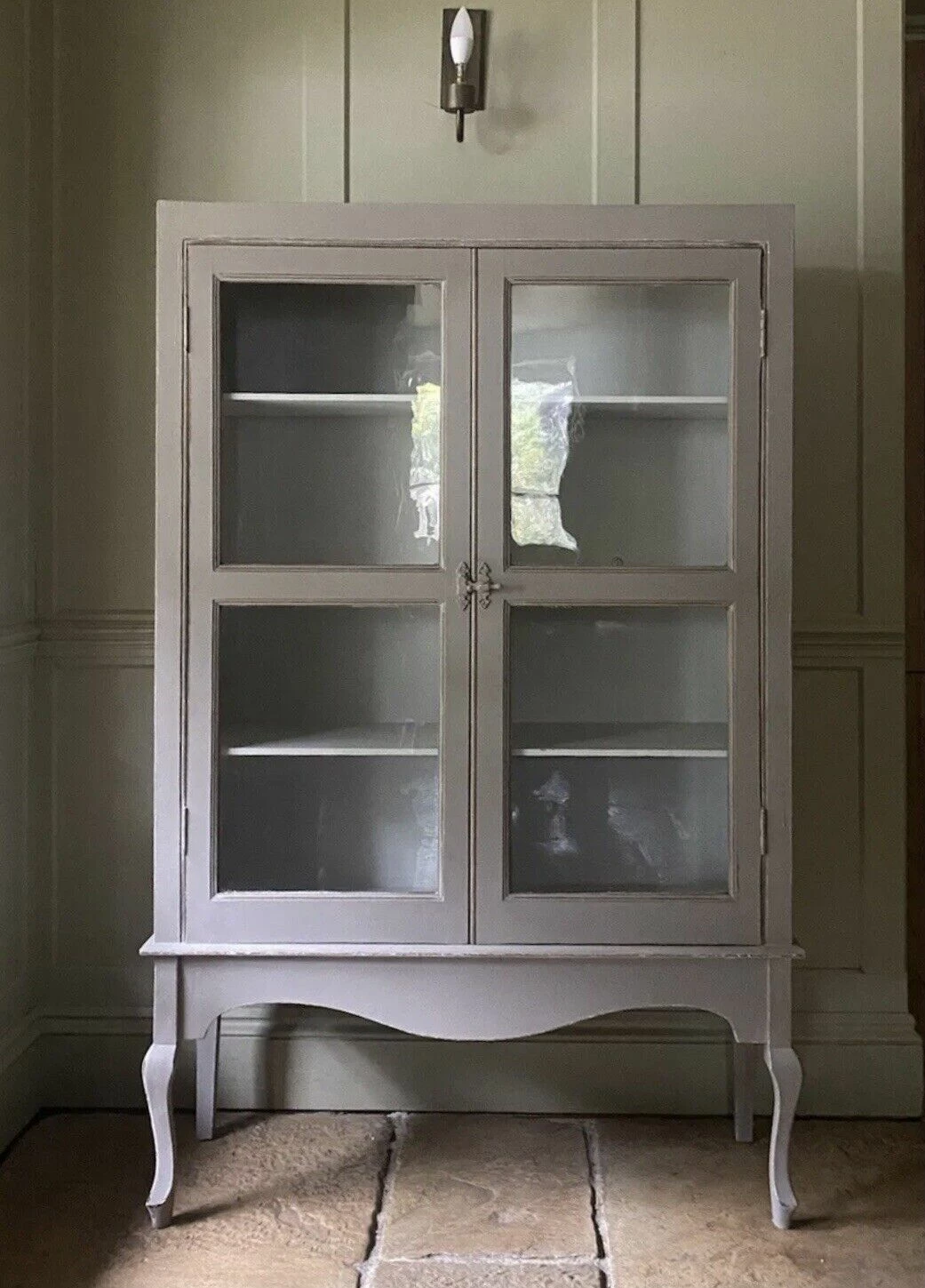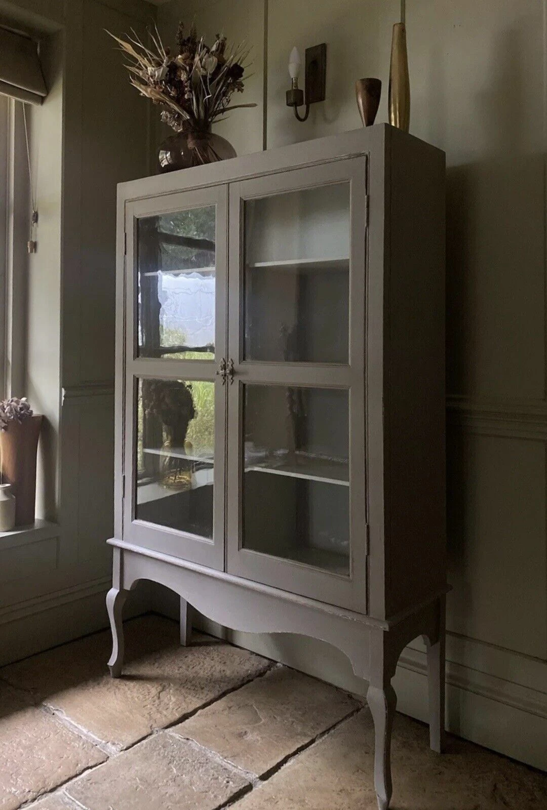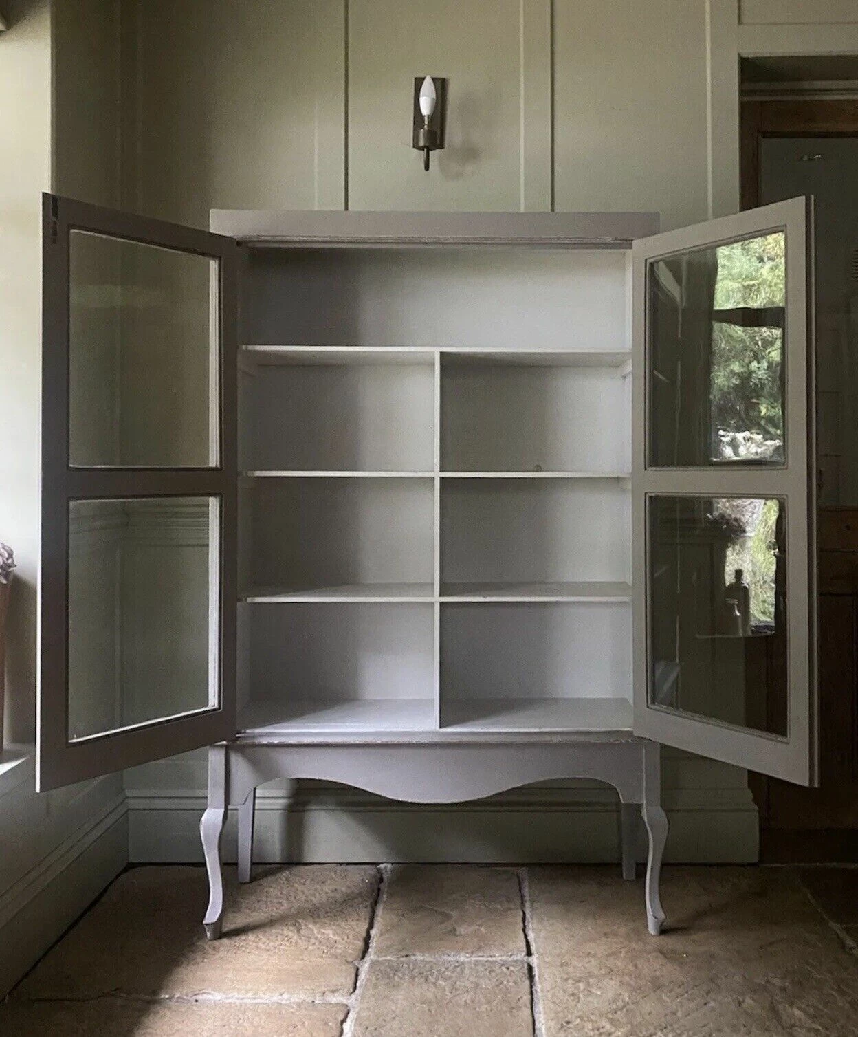 Tall Antique Painted Glazed Cabinet on Queen Anne Legs Early 20th Century Grey painted Glazed cabinet, versatile storage, would suit a variety of uses. Looks to be early C20th. Minor wear and tear commensurate with age, a solid and sturdy piece. Fixed shelves. Painted exterior in Annie Sloan French Linen, a warm grey, and original previously painted and distressed interior in an off white colour. Exterior is distressed along the edges and waxed to give this lovely authentic look.
