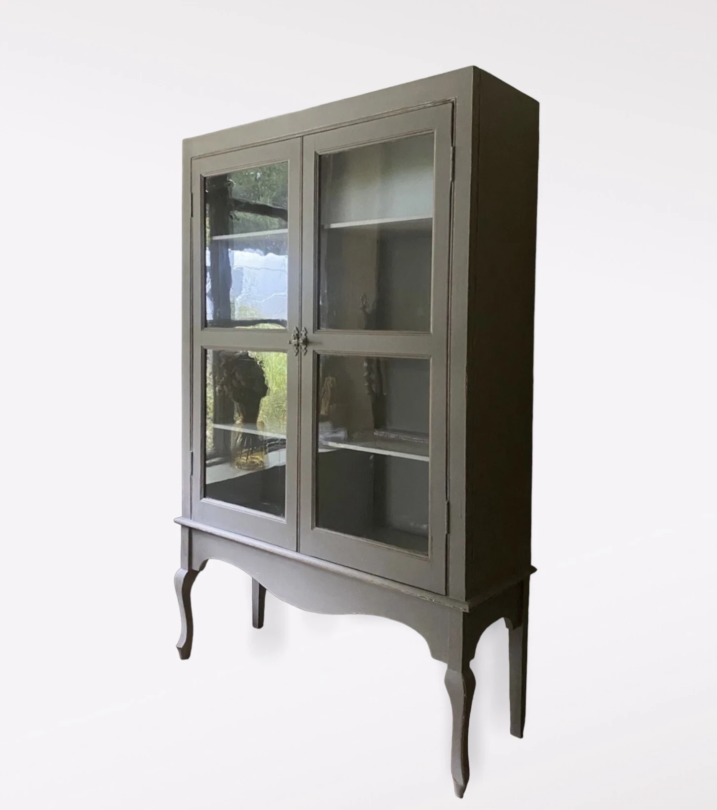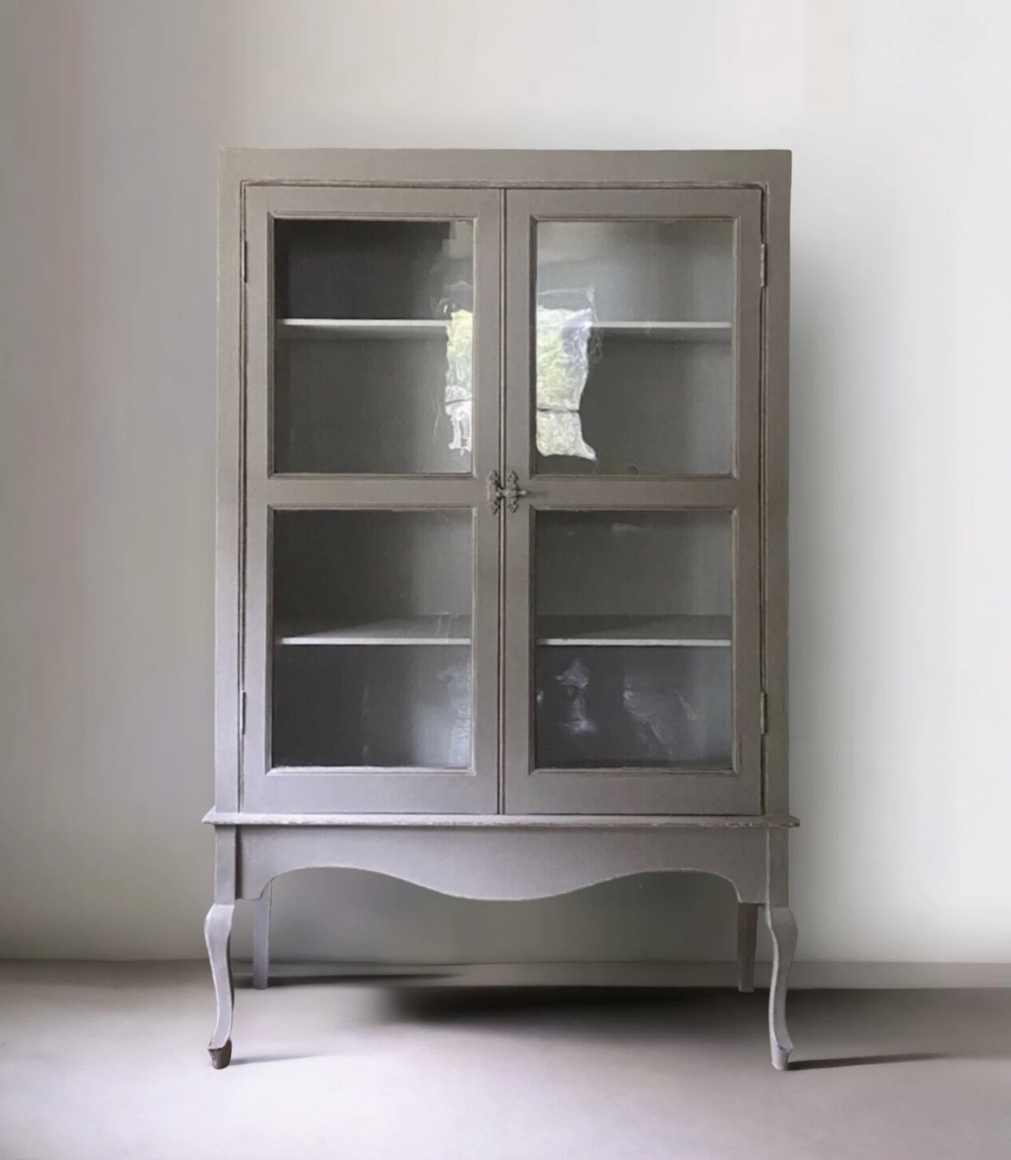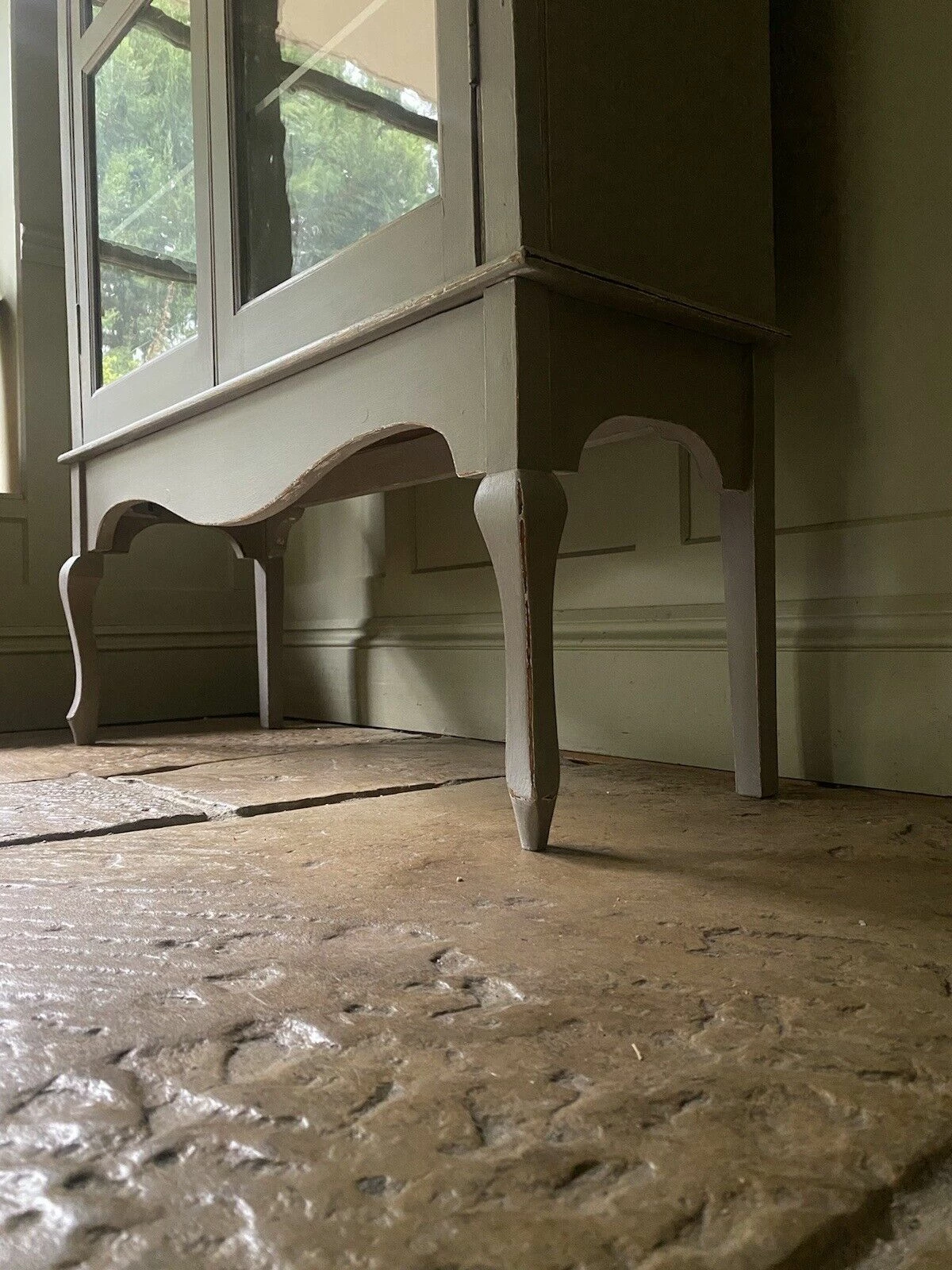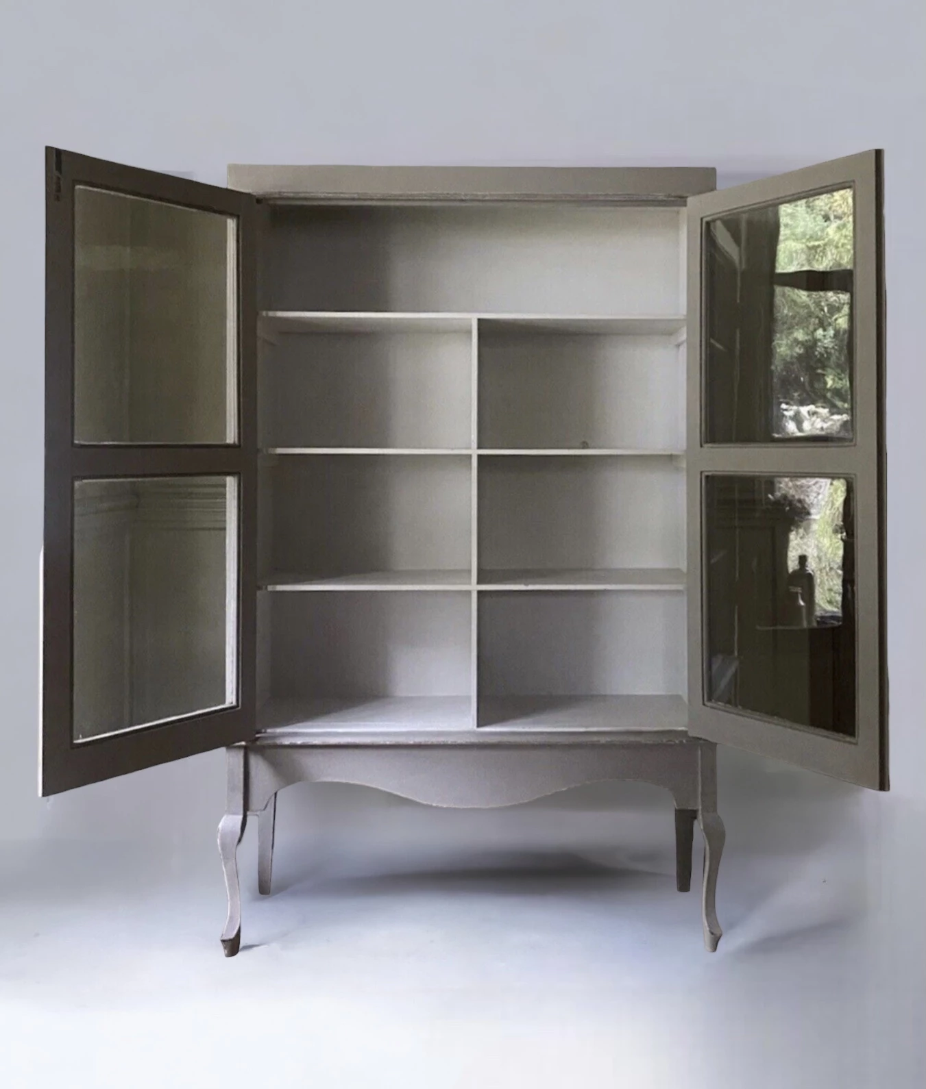 Tall Antique Painted Glazed Cabinet on Queen Anne Legs Early 20th Century Grey painted Glazed cabinet, versatile storage, would suit a variety of uses. Looks to be early C20th. Minor wear and tear commensurate with age, a solid and sturdy piece. Fixed shelves. Painted exterior in Annie Sloan French Linen, a warm grey, and original previously painted and distressed interior in an off white colour. Exterior is distressed along the edges and waxed to give this lovely authentic look.