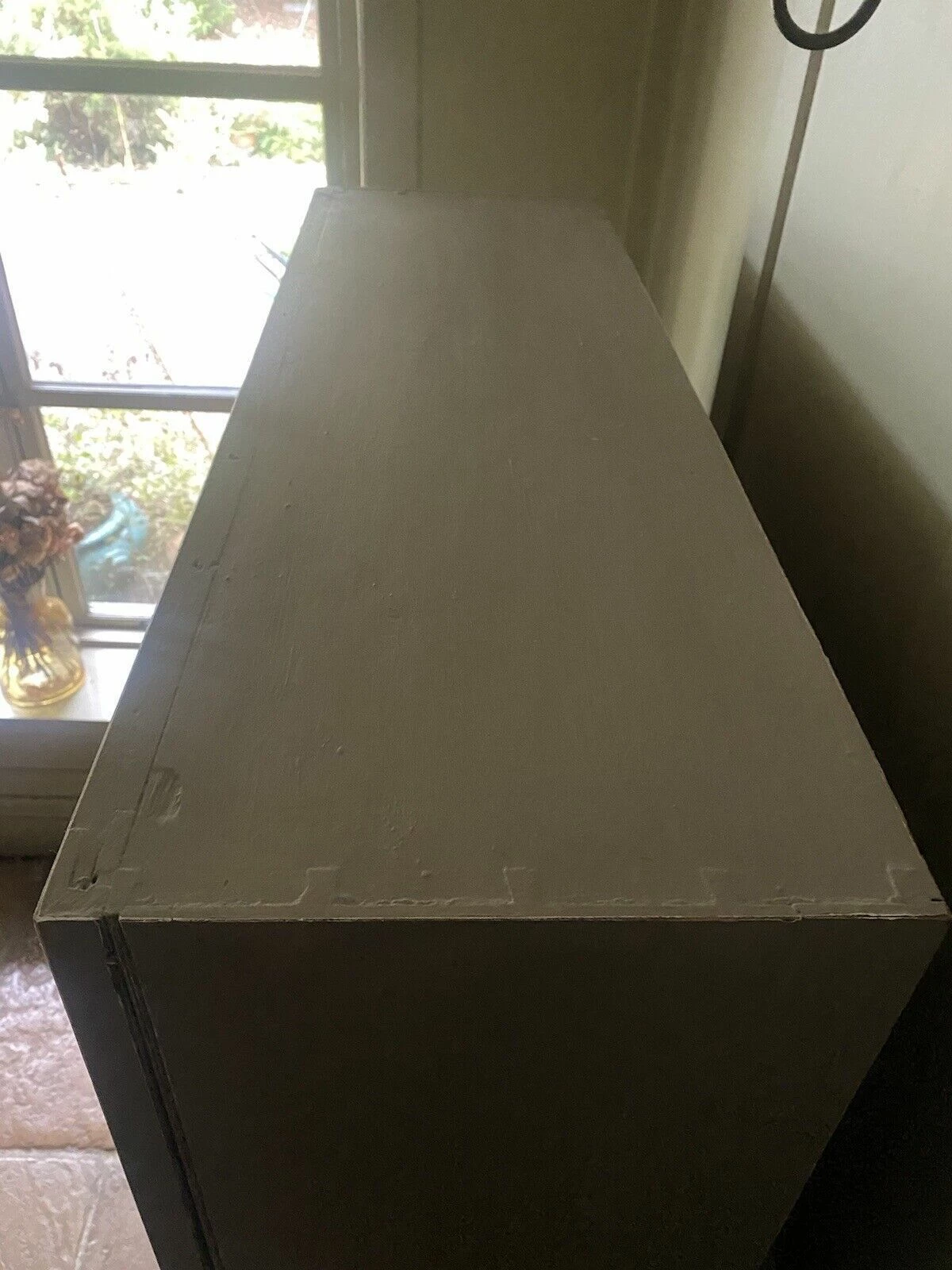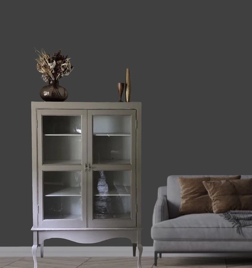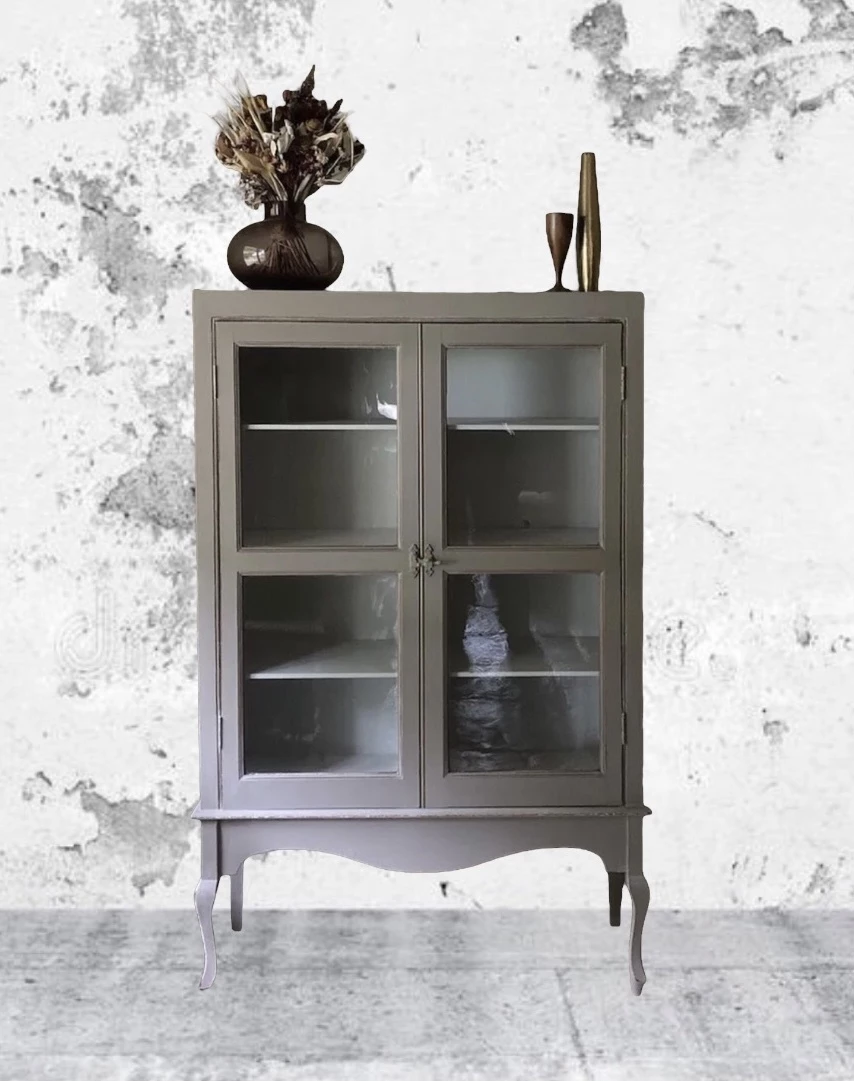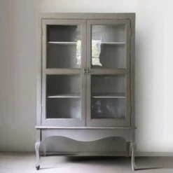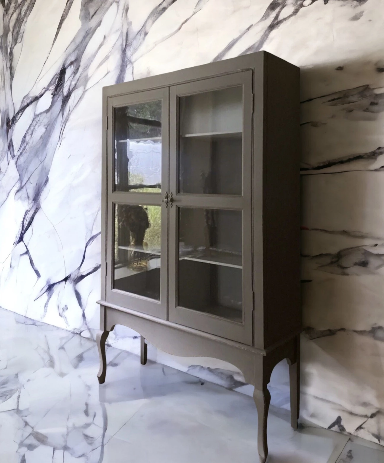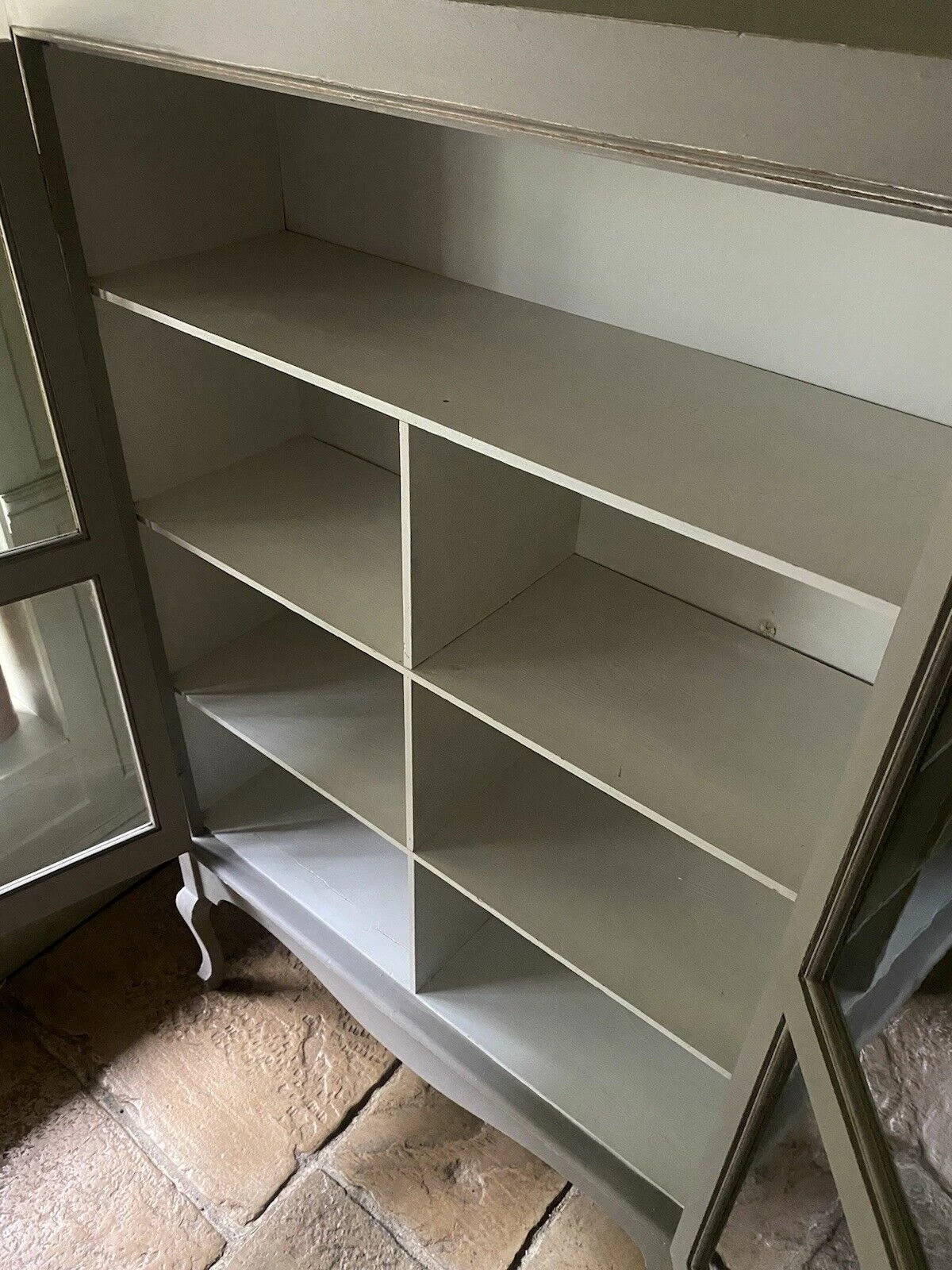 Tall Antique Painted Glazed Cabinet on Queen Anne Legs Early 20th Century Grey painted Glazed cabinet, versatile storage, would suit a variety of uses. Looks to be early C20th. Minor wear and tear commensurate with age, a solid and sturdy piece. Fixed shelves. Painted exterior in Annie Sloan French Linen, a warm grey, and original previously painted and distressed interior in an off white colour. Exterior is distressed along the edges and waxed to give this lovely authentic look.