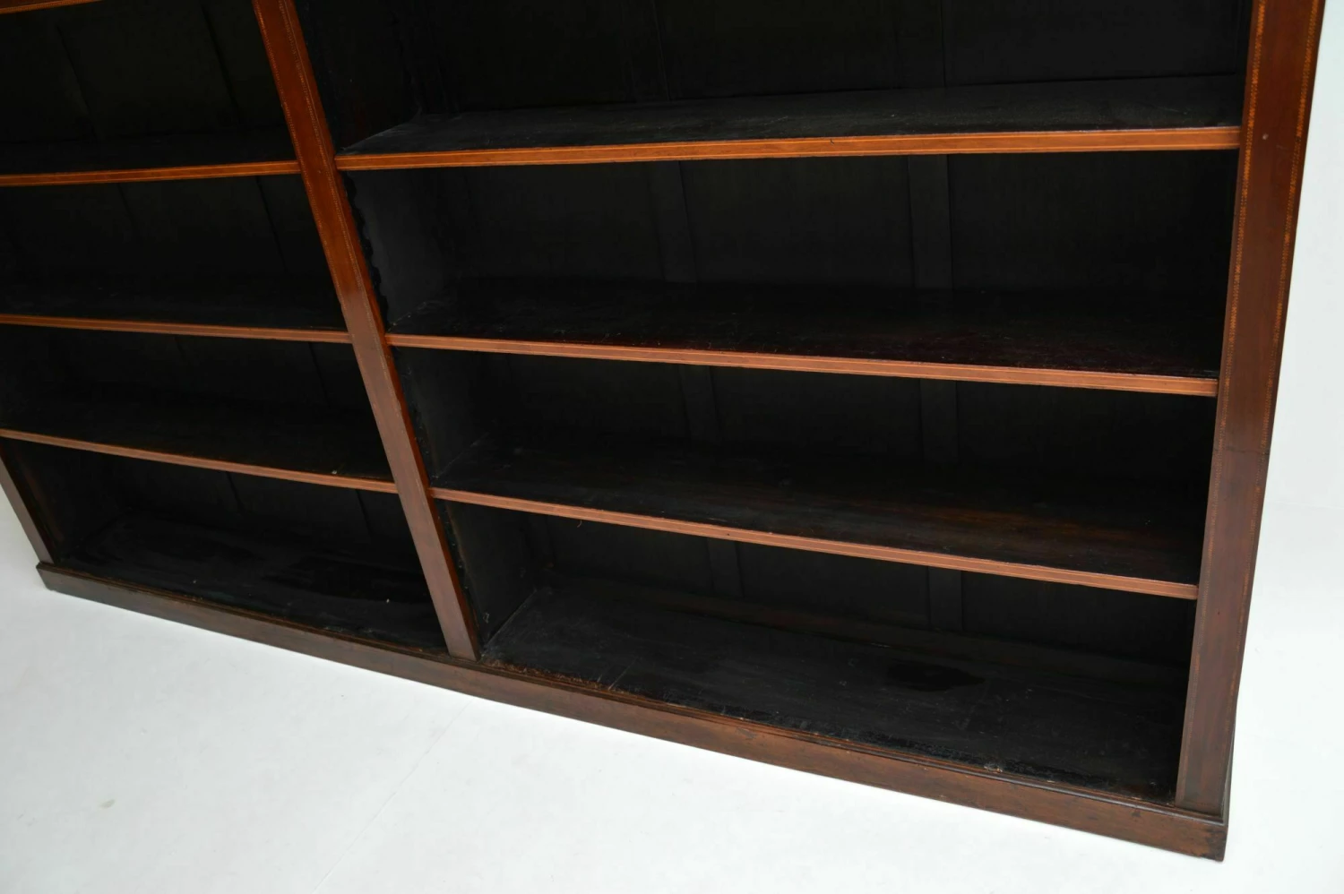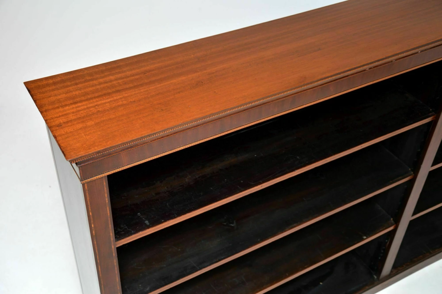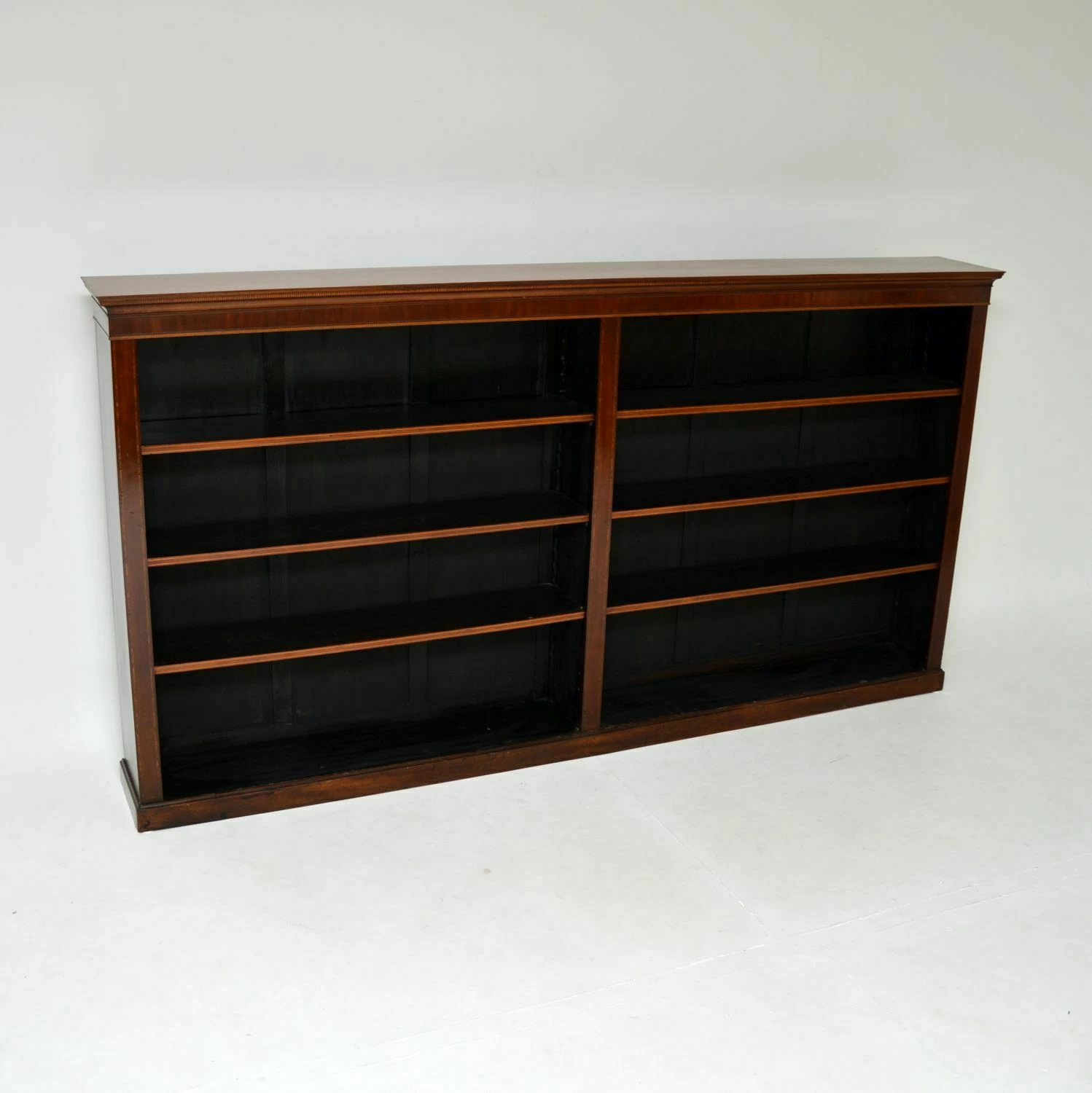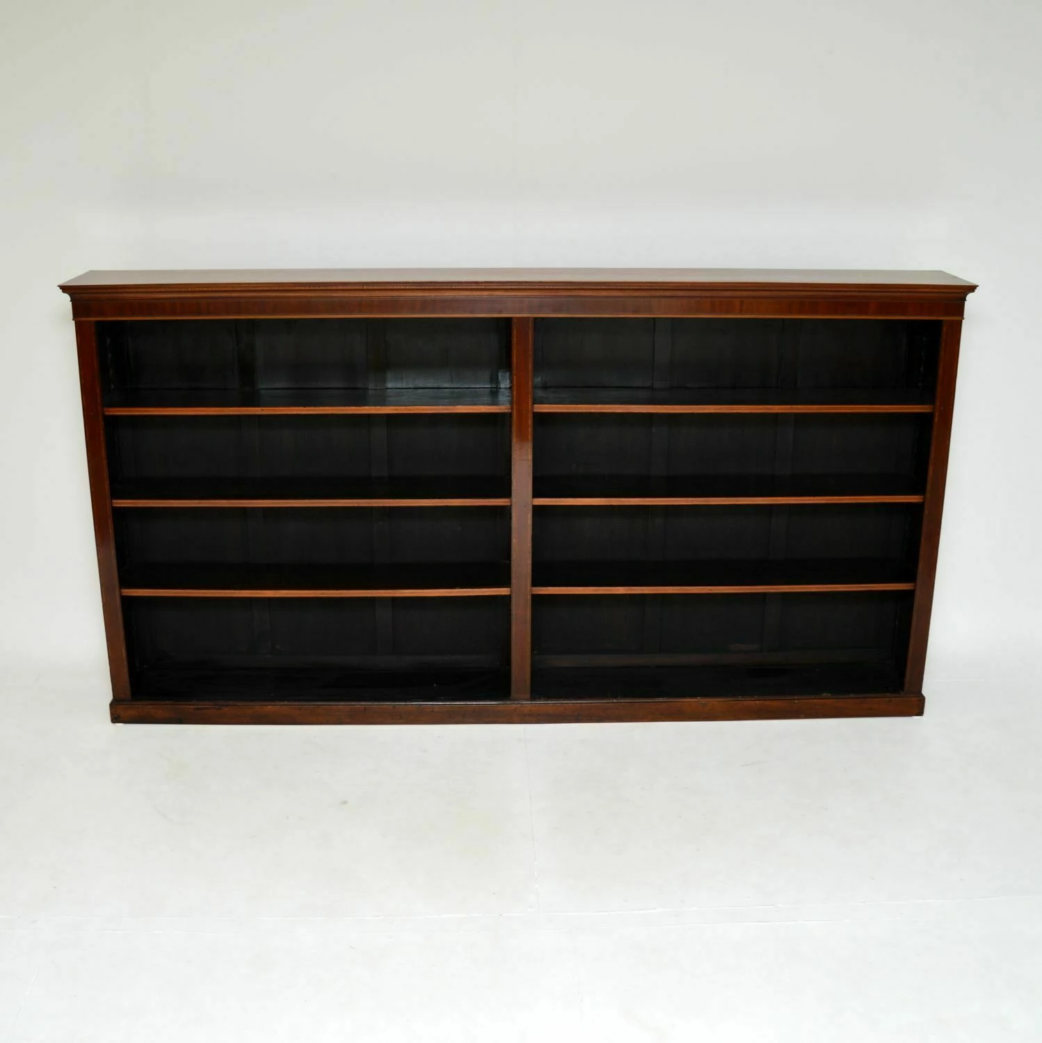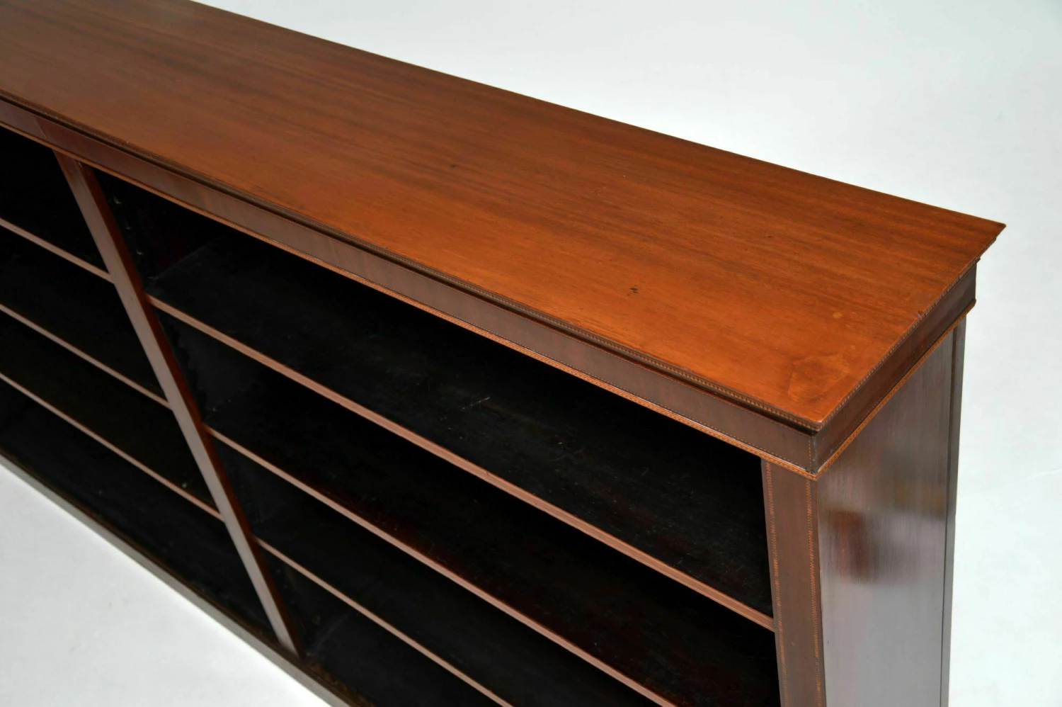 A large and impressive antique Edwardian open bookcase in mahogany. This was made in England, it dates from around the 1890-1910 period. It is of superb quality and is a great size. It is very wide, not too high and not too deep, so though it contains lots of storage space & will hold loads of books, it is not too imposing. There are three adjustable shelves in each section, and there is lovely satin wood inlay around the top and front edges. We have had this stripped and re-polished, it is in lovely condition for its age. The mahogany has a gorgeous colour tone and has acquired a beautiful patina over the years. Please check the length, because it’s very long & will take up a lot of wall space.