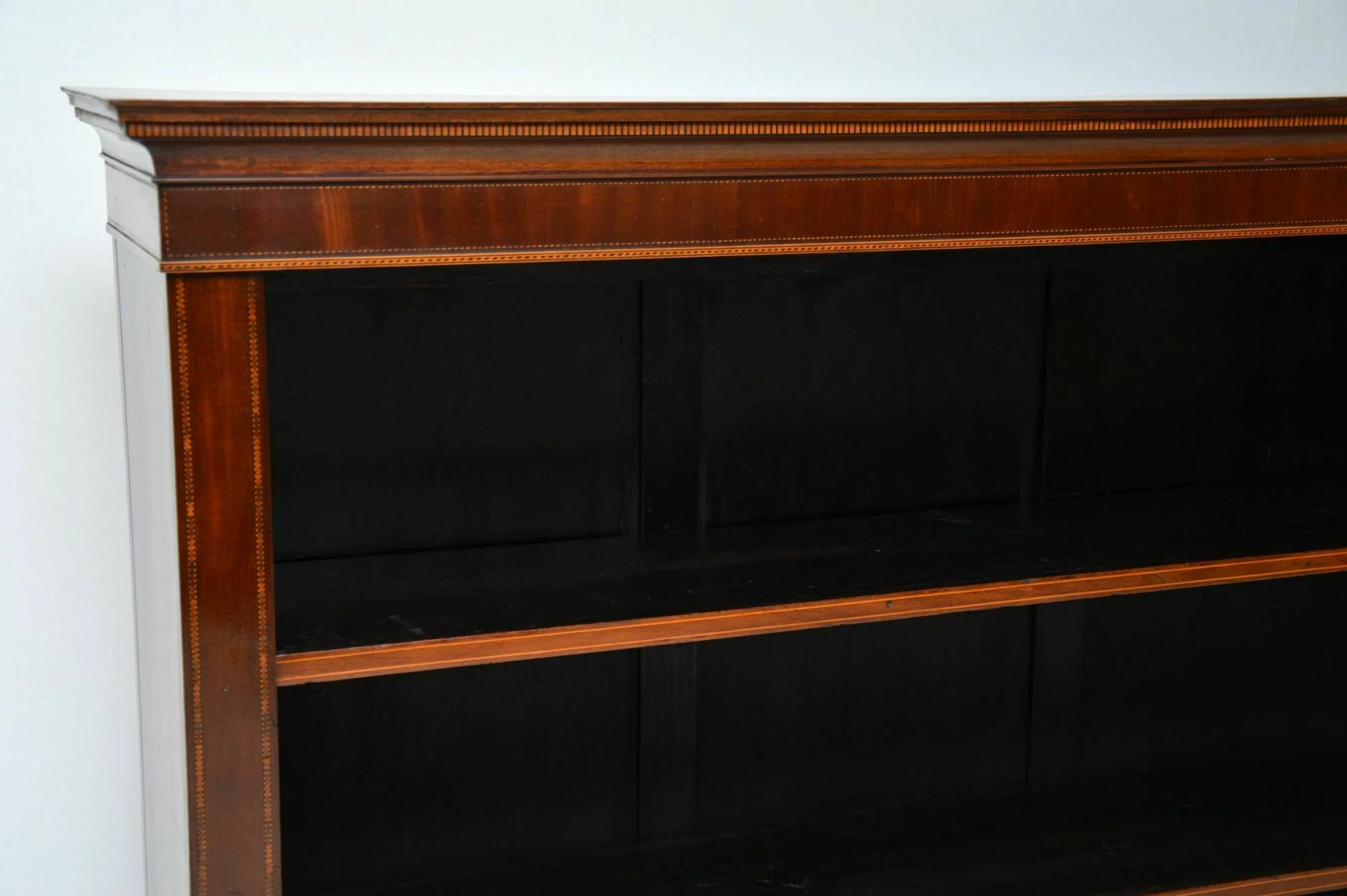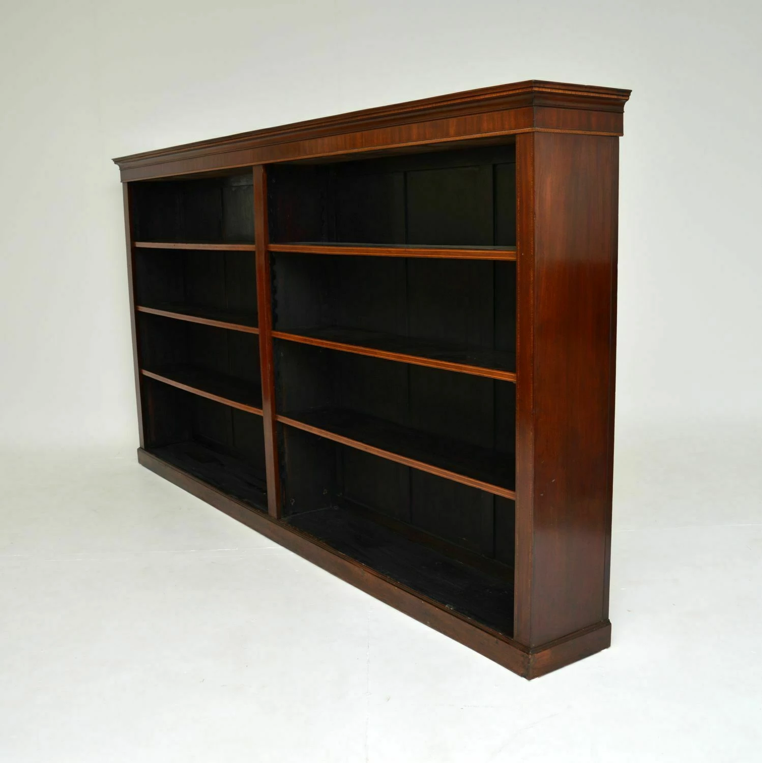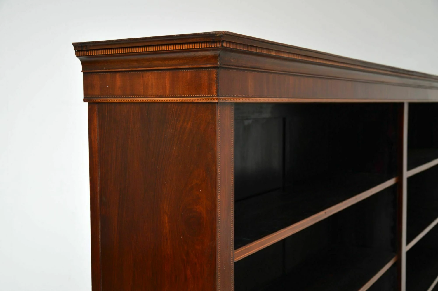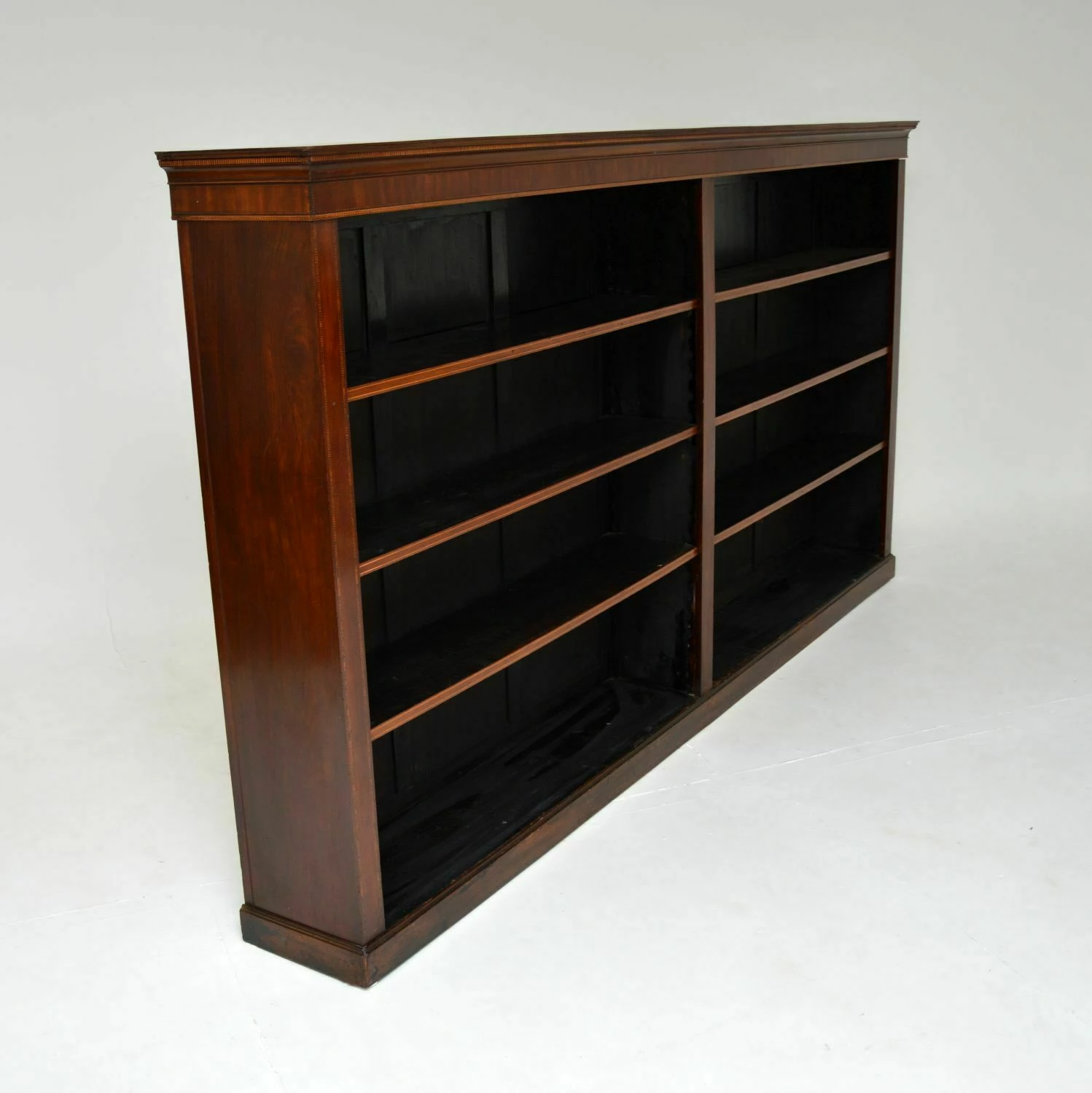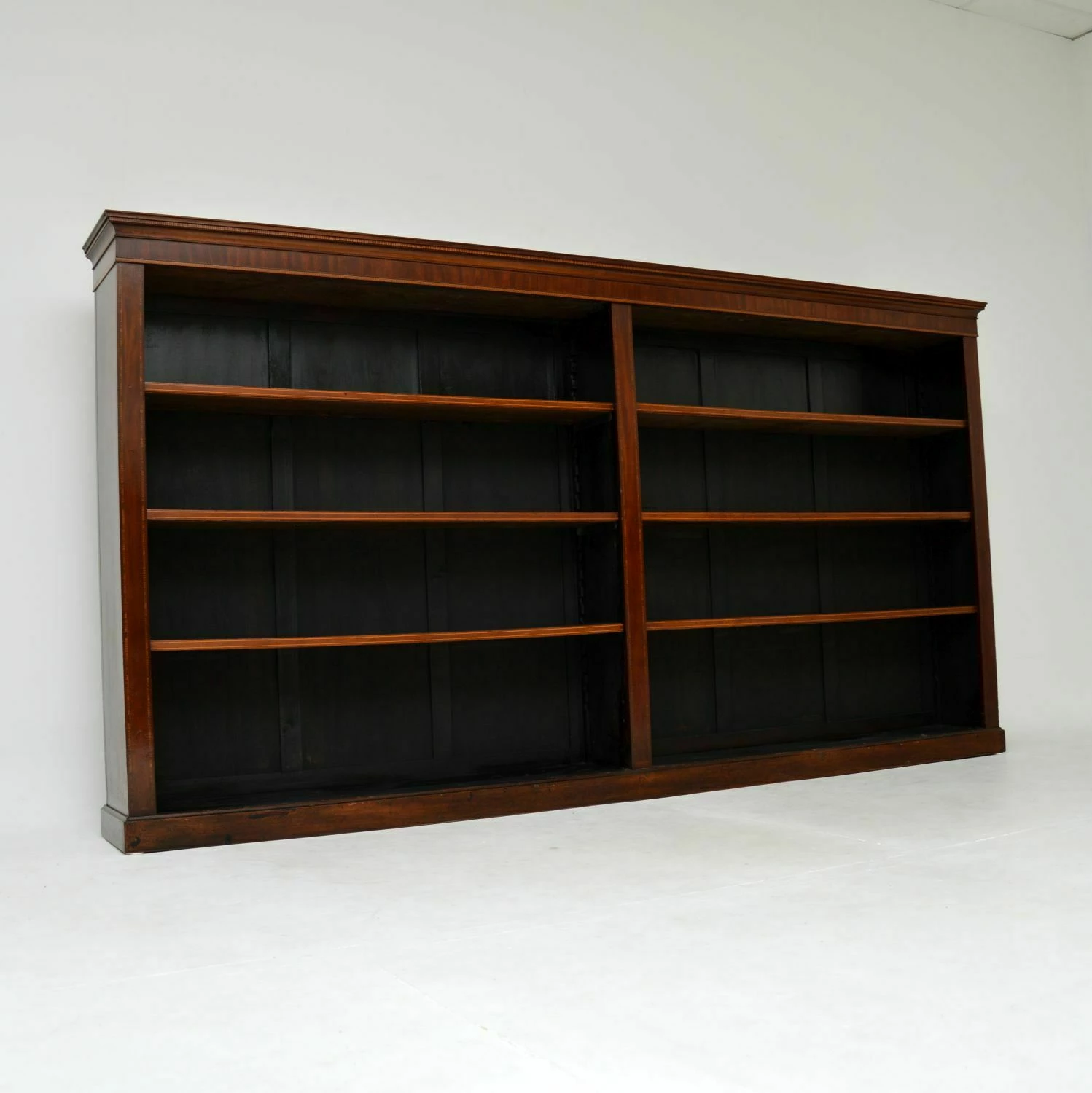 A large and impressive antique Edwardian open bookcase in mahogany. This was made in England, it dates from around the 1890-1910 period. It is of superb quality and is a great size. It is very wide, not too high and not too deep, so though it contains lots of storage space & will hold loads of books, it is not too imposing. There are three adjustable shelves in each section, and there is lovely satin wood inlay around the top and front edges. We have had this stripped and re-polished, it is in lovely condition for its age. The mahogany has a gorgeous colour tone and has acquired a beautiful patina over the years. Please check the length, because it’s very long & will take up a lot of wall space.