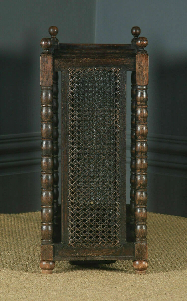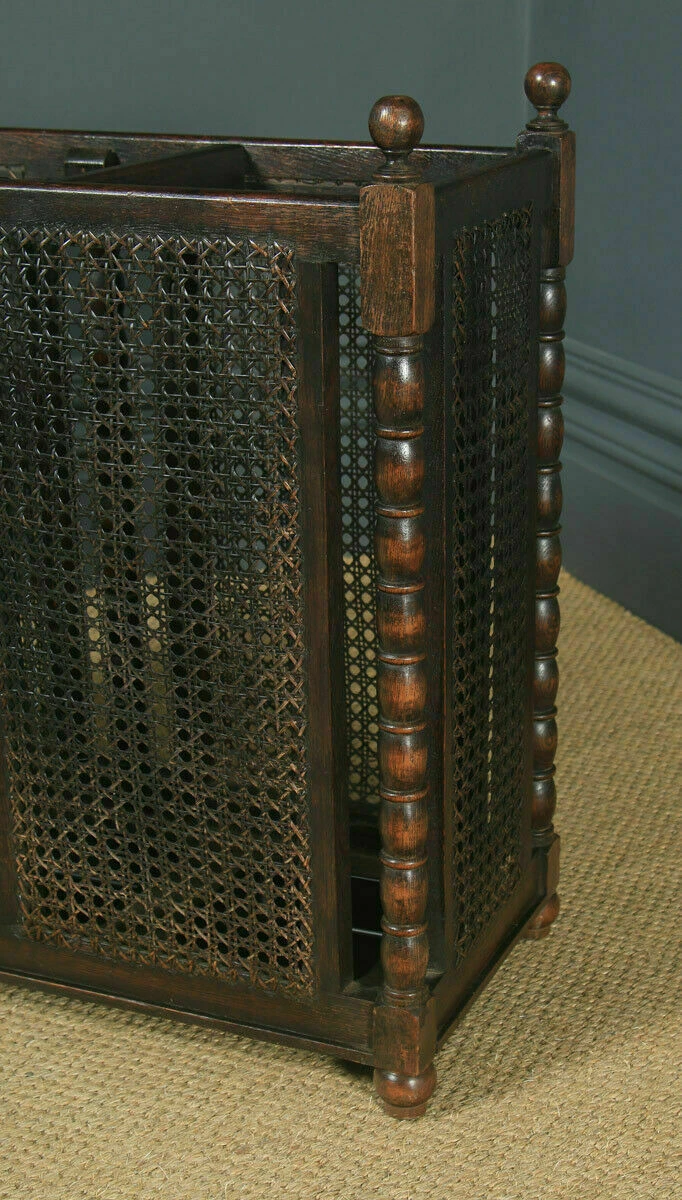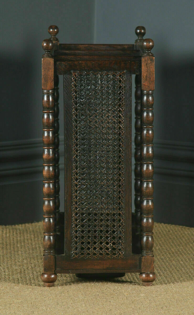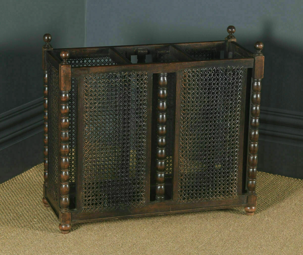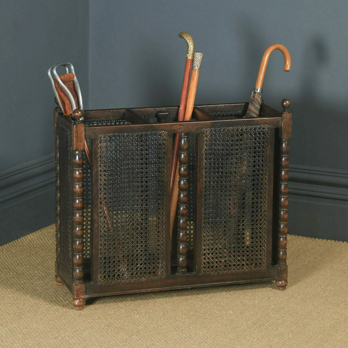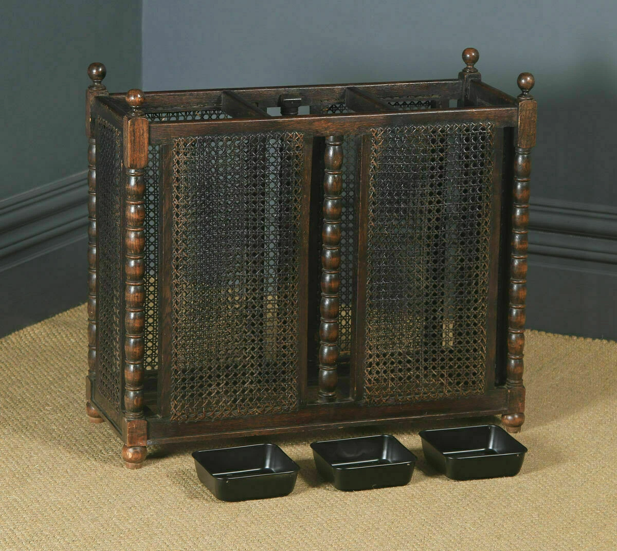 This is a good quality antique English Edwardian solid oak & cane stick & umbrella hall-stand, with three tin drip trays, circa 1910, in excellent condition. The stand comprises a rectangular frame, partitioned into three sections. The frame is raised on ring turned supports, topped with turned spherical shaped finials. Below, the supports are united by stretchers for additional strength. The stand also features cane panels to the front, sides and rear. Fitting neatly within the stretchers are three later removable tin drip trays. The stand is raised on turned feet. The item is solid in joint and ready to use.