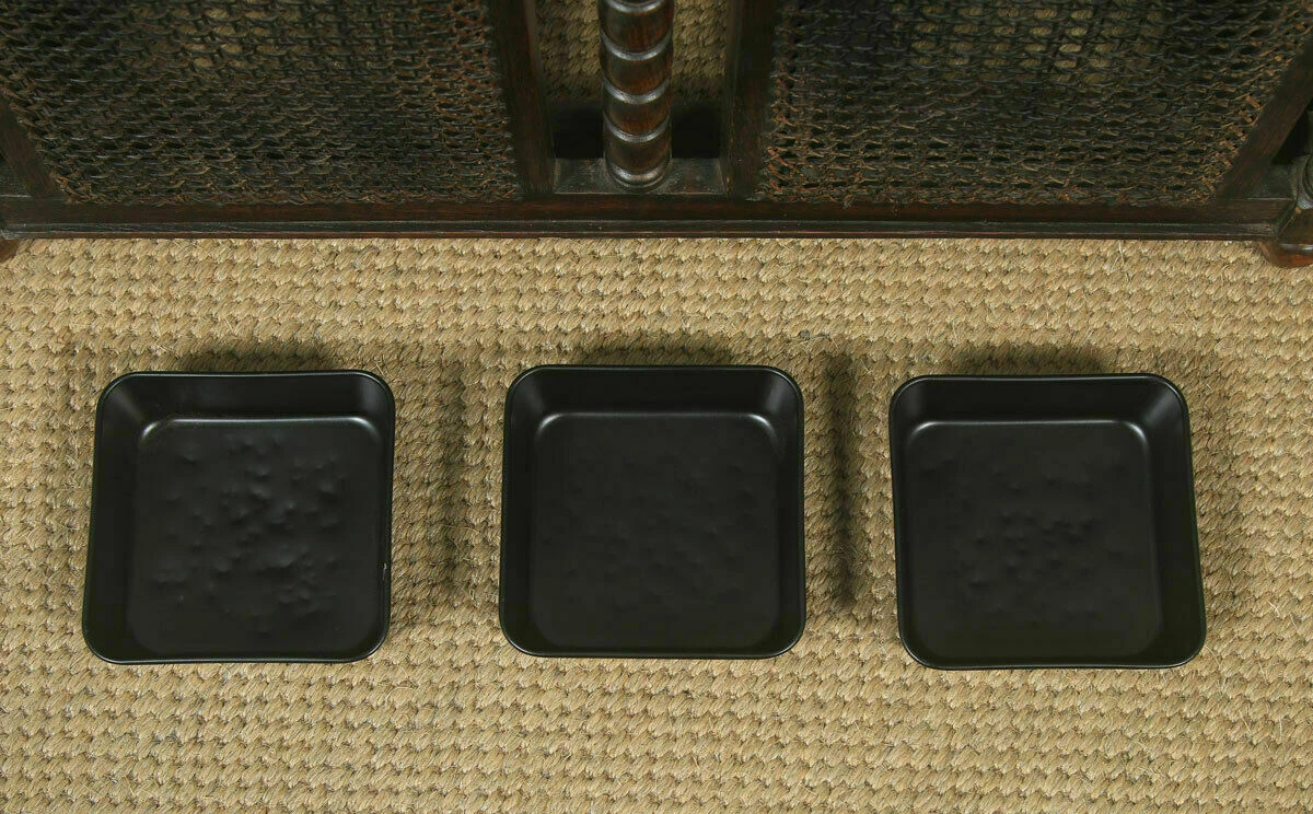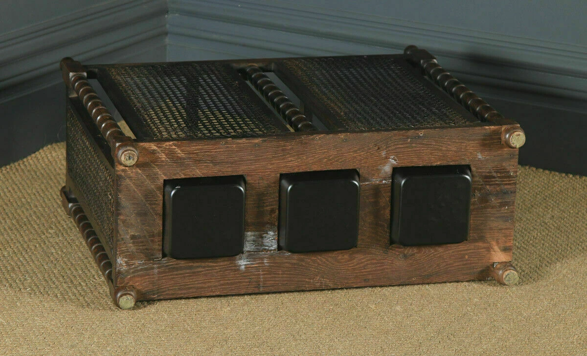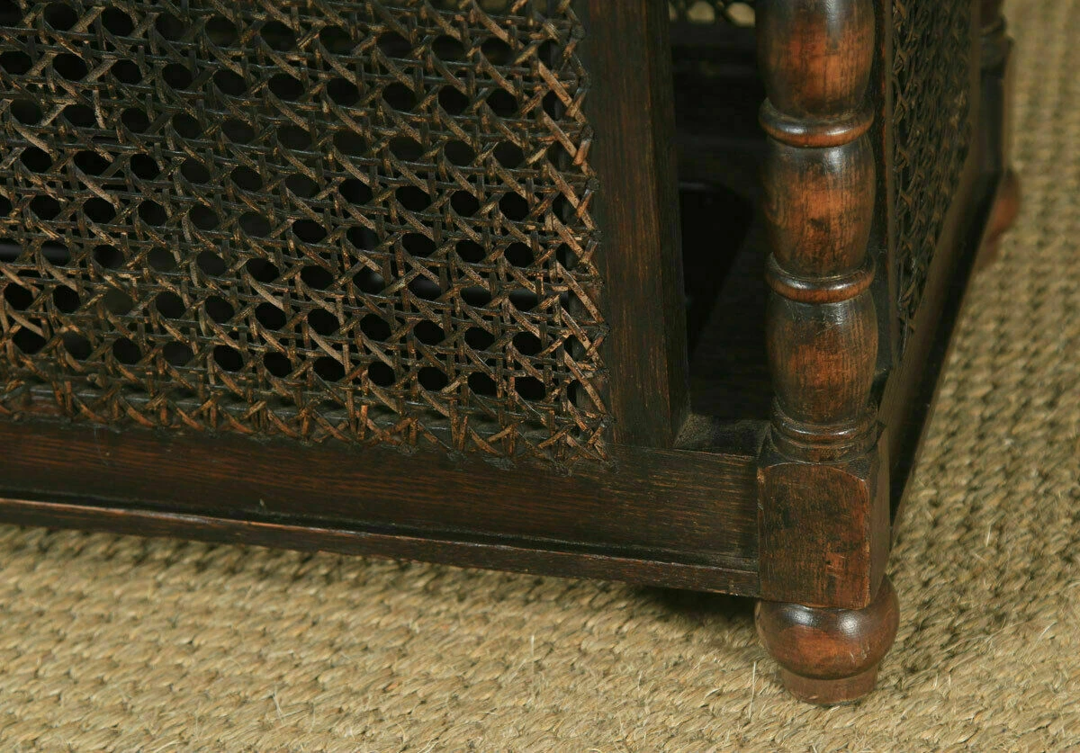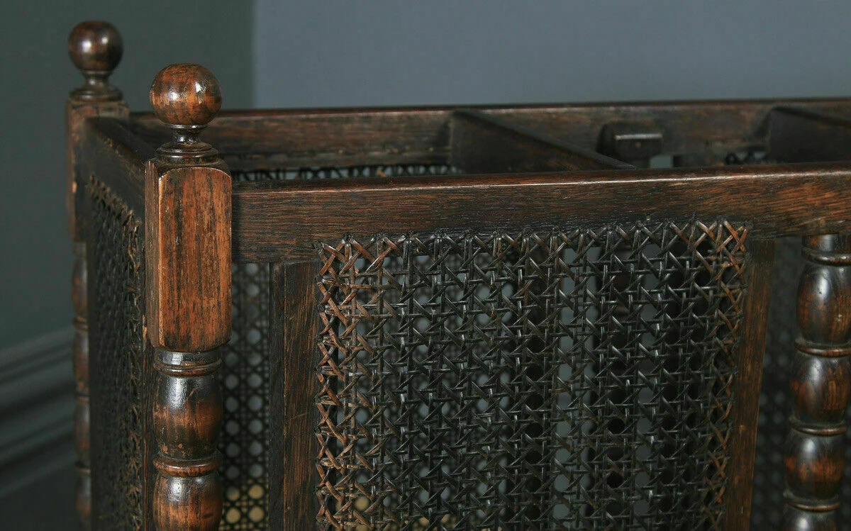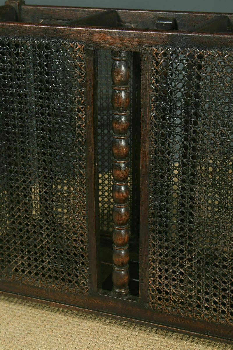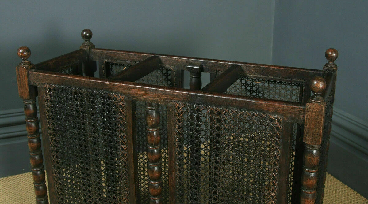 This is a good quality antique English Edwardian solid oak & cane stick & umbrella hall-stand, with three tin drip trays, circa 1910, in excellent condition. The stand comprises a rectangular frame, partitioned into three sections. The frame is raised on ring turned supports, topped with turned spherical shaped finials. Below, the supports are united by stretchers for additional strength. The stand also features cane panels to the front, sides and rear. Fitting neatly within the stretchers are three later removable tin drip trays. The stand is raised on turned feet. The item is solid in joint and ready to use.