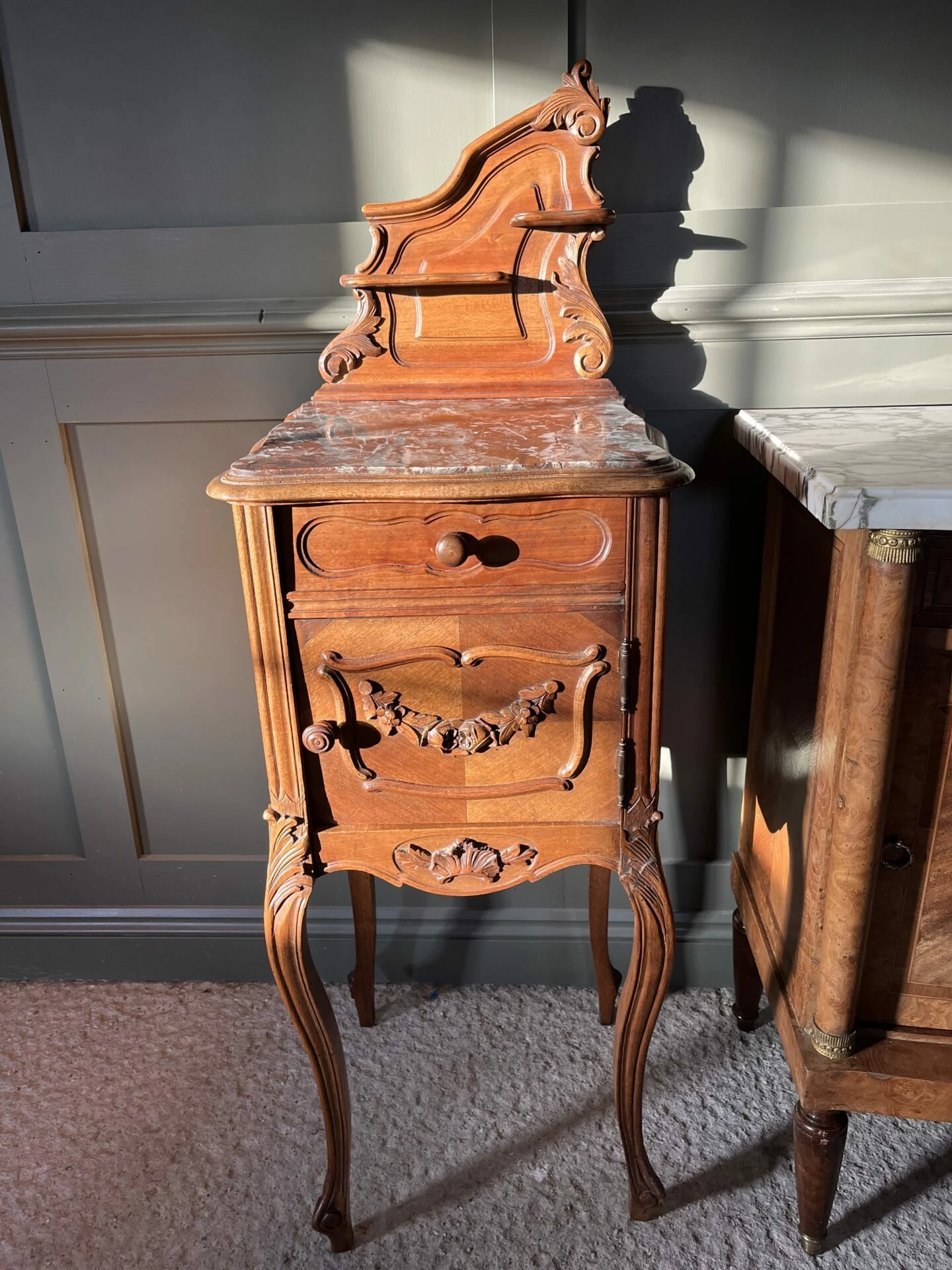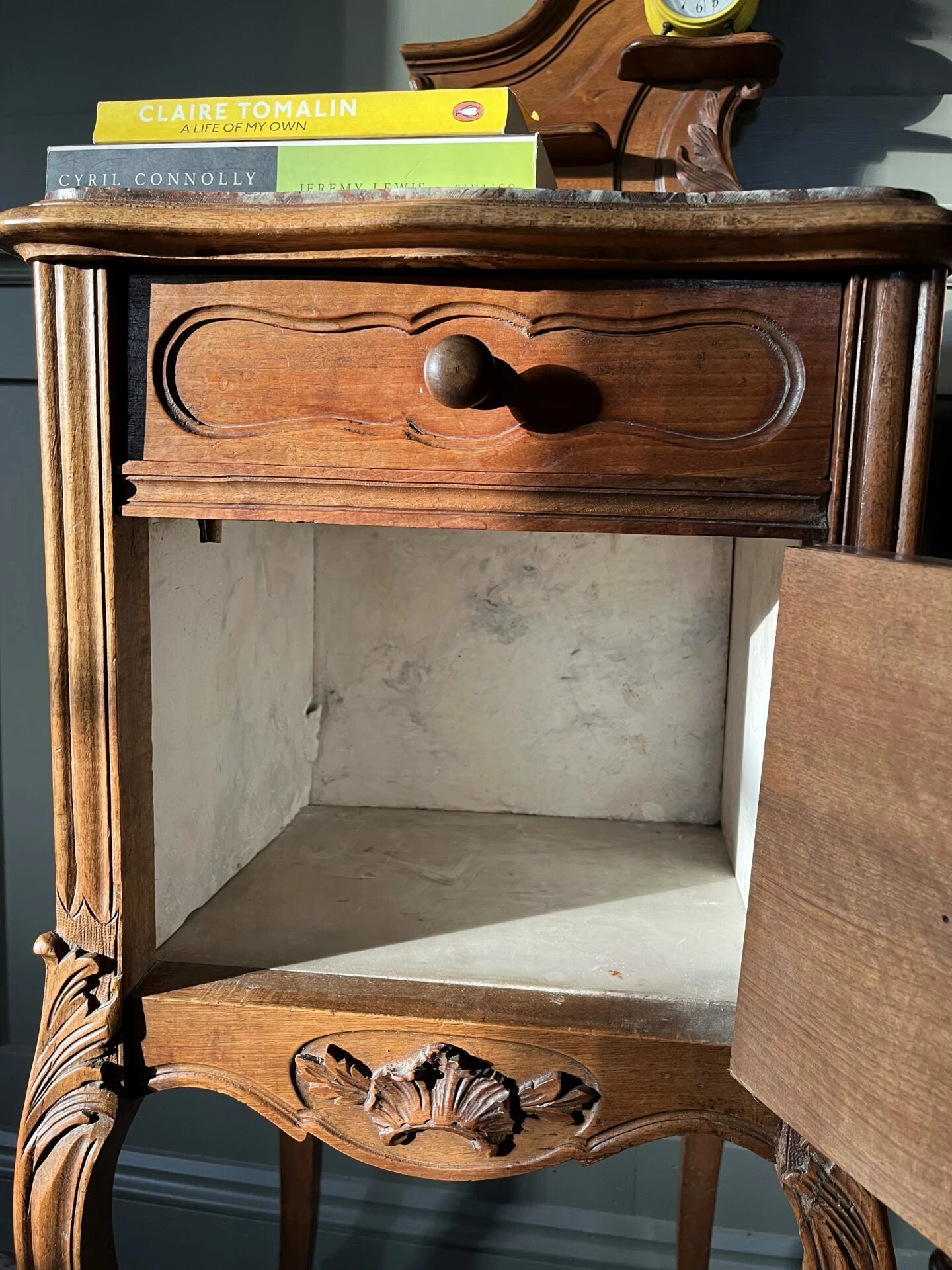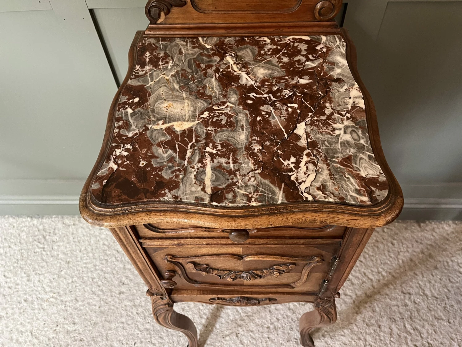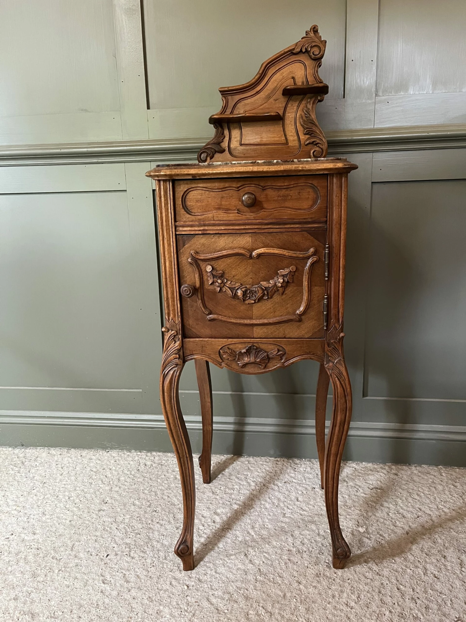 Charming and unusual antique French bedside cabinet with marble top & drawer under. Authentic item with an historic, strong, repair to one leg – please see photographs, otherwise wear consistent with age and use. Some small cracks to the marble top but nothing loose. Circa late 1800’s this is a beautiful item complete with it’s original wooden knobs & intricate carvings to front.