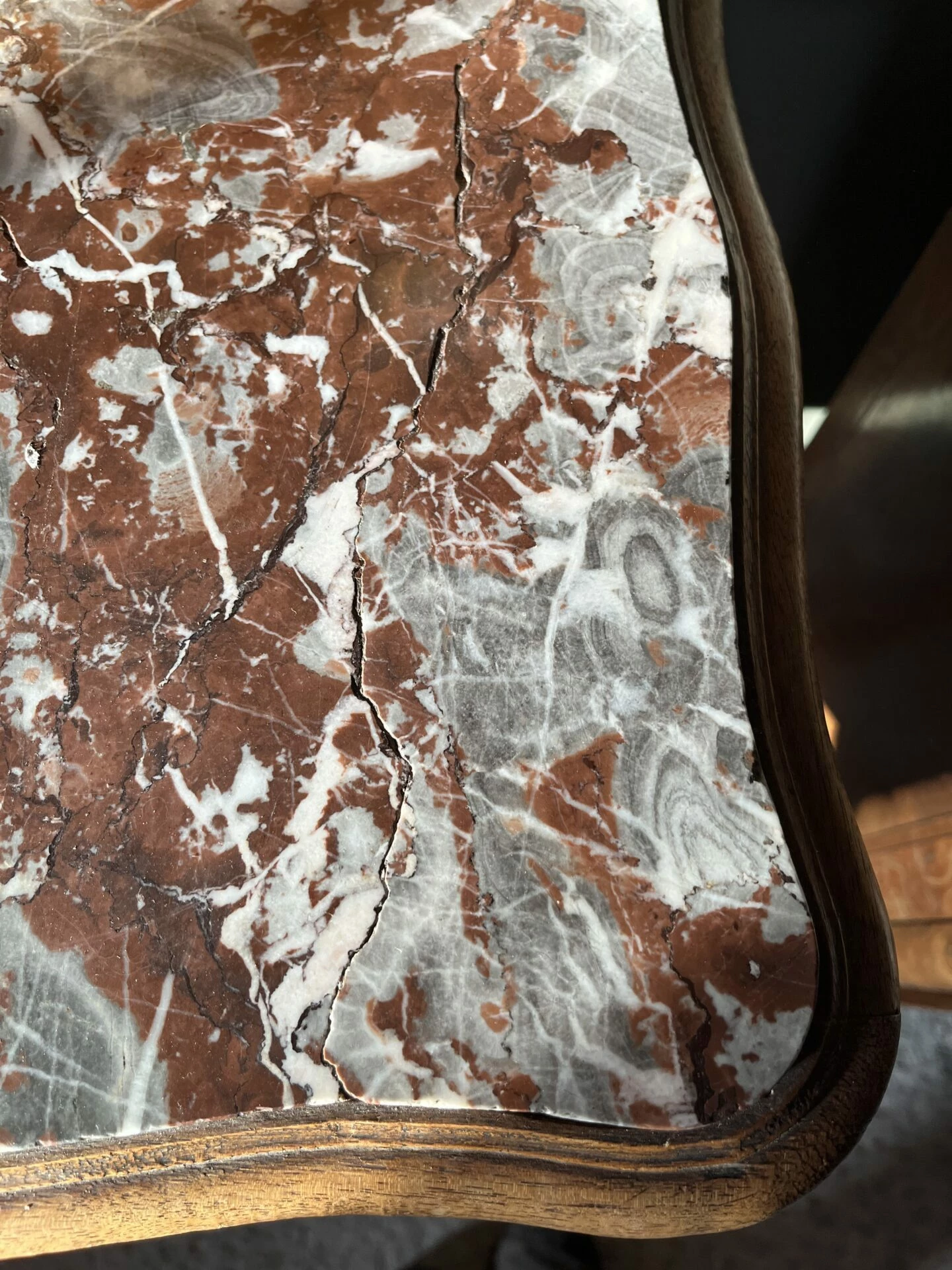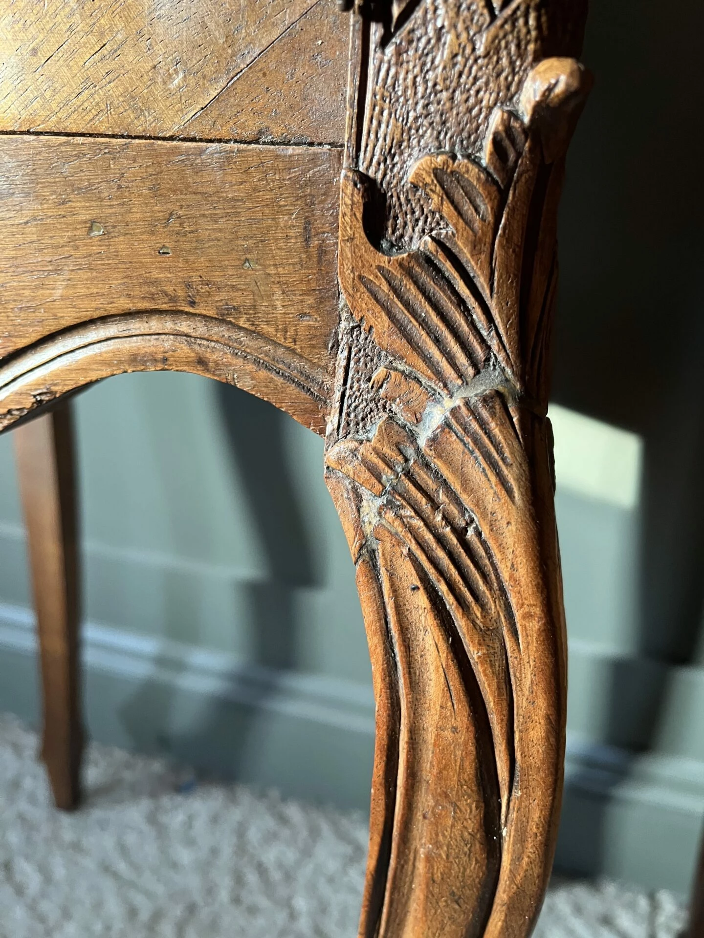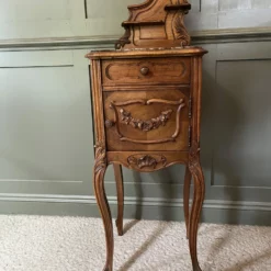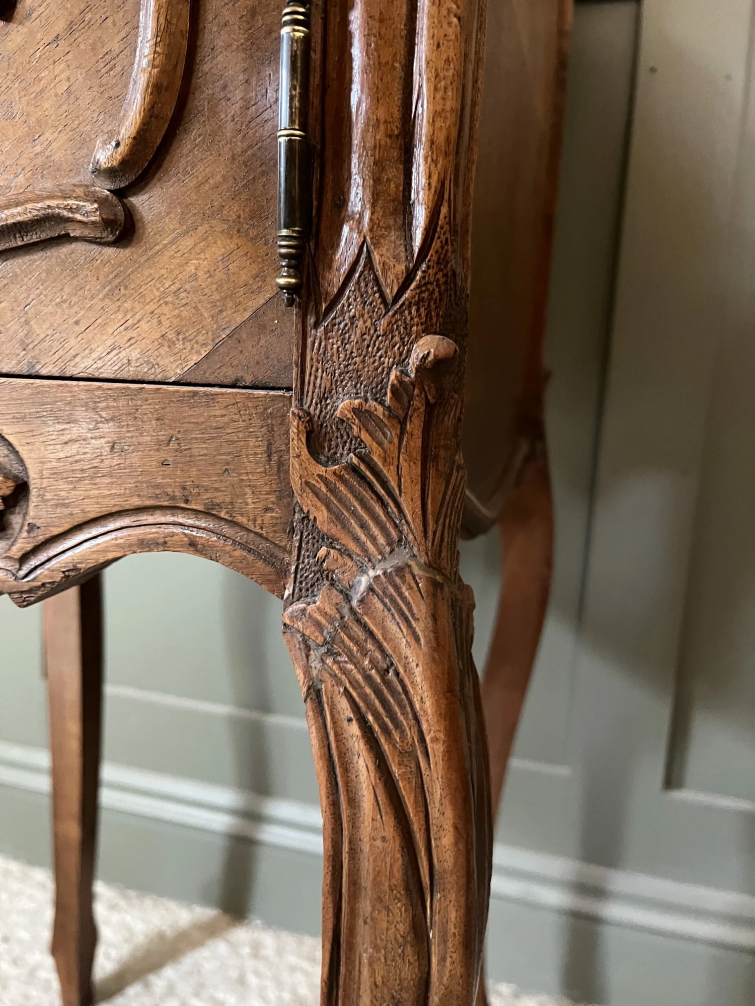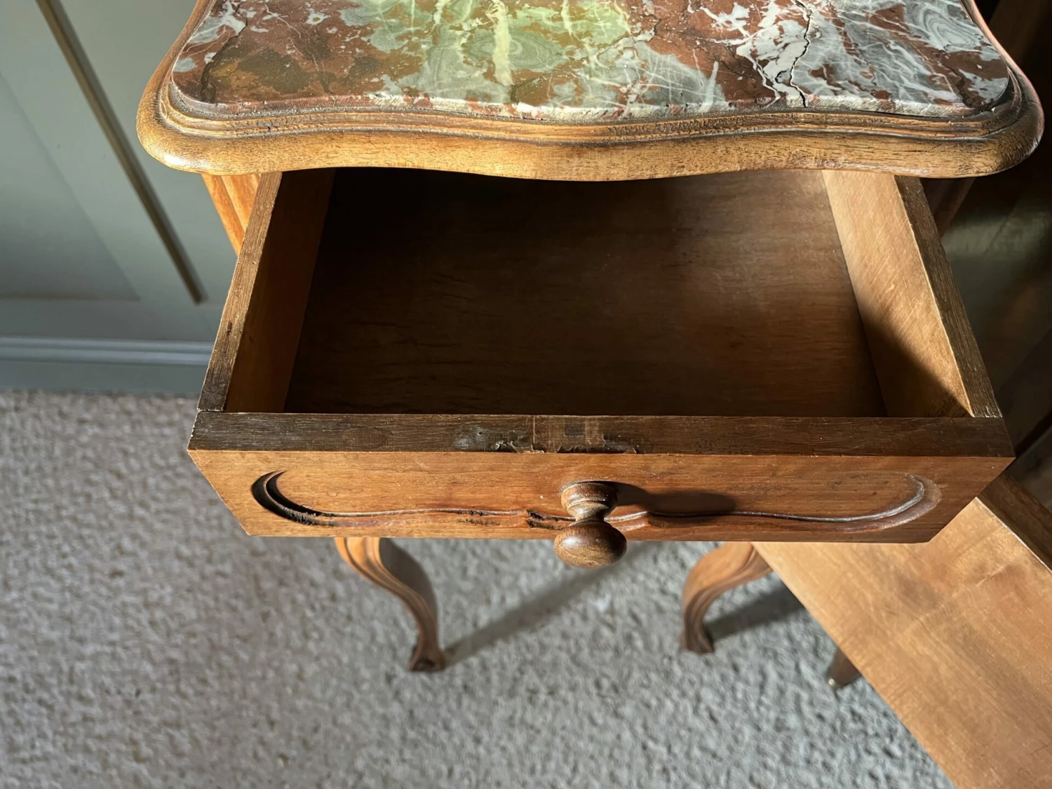 Charming and unusual antique French bedside cabinet with marble top & drawer under. Authentic item with an historic, strong, repair to one leg – please see photographs, otherwise wear consistent with age and use. Some small cracks to the marble top but nothing loose. Circa late 1800’s this is a beautiful item complete with it’s original wooden knobs & intricate carvings to front.