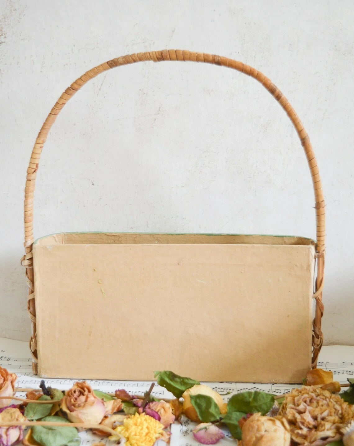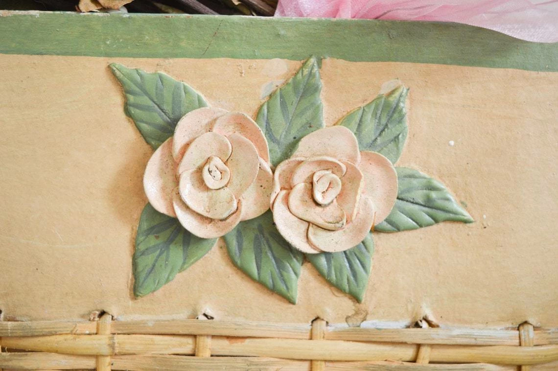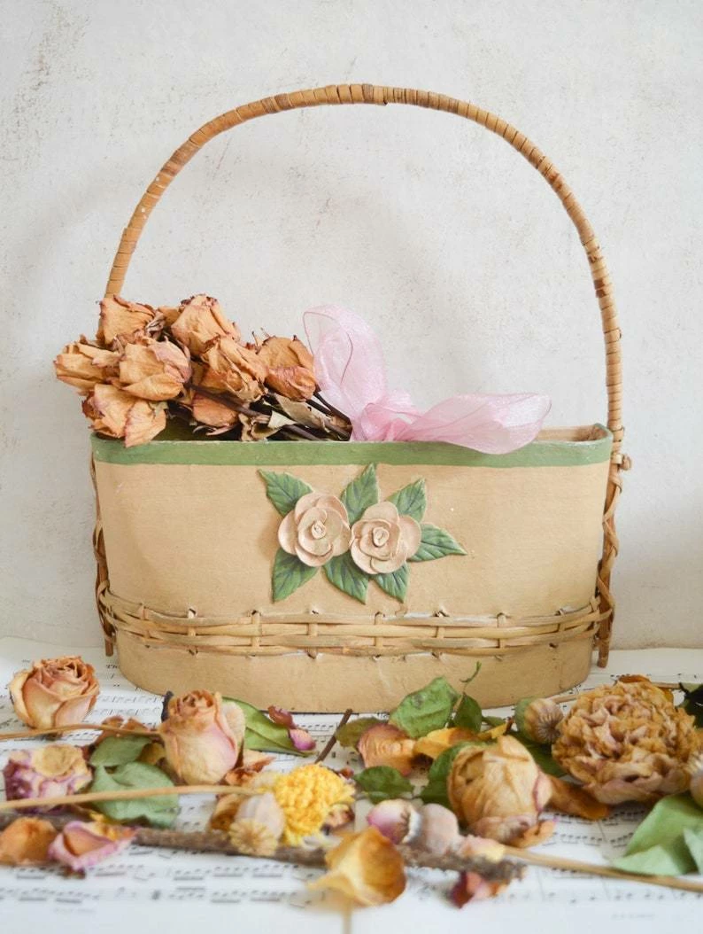 Antique French Shabby Chic Paper Mache Basket with Handle, Beautiful Hand Crafted Storage Letter Organizer with Wooden Roses and Leaves