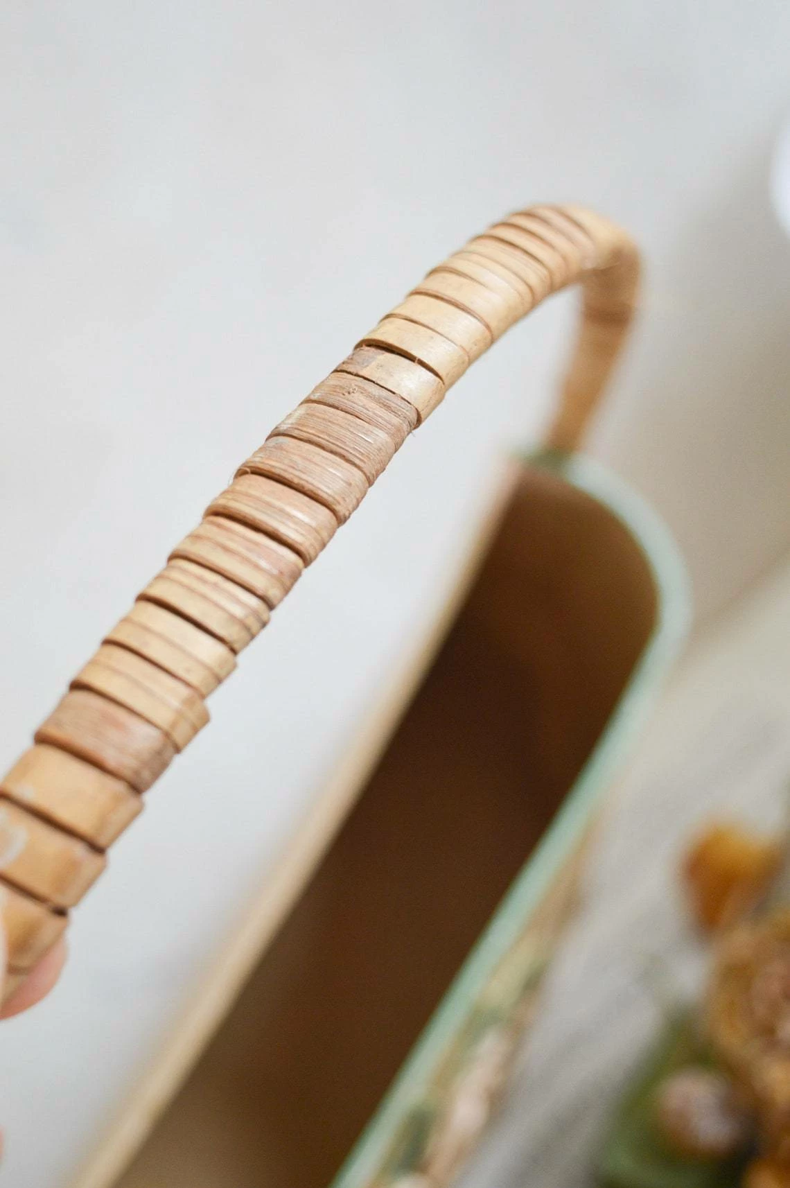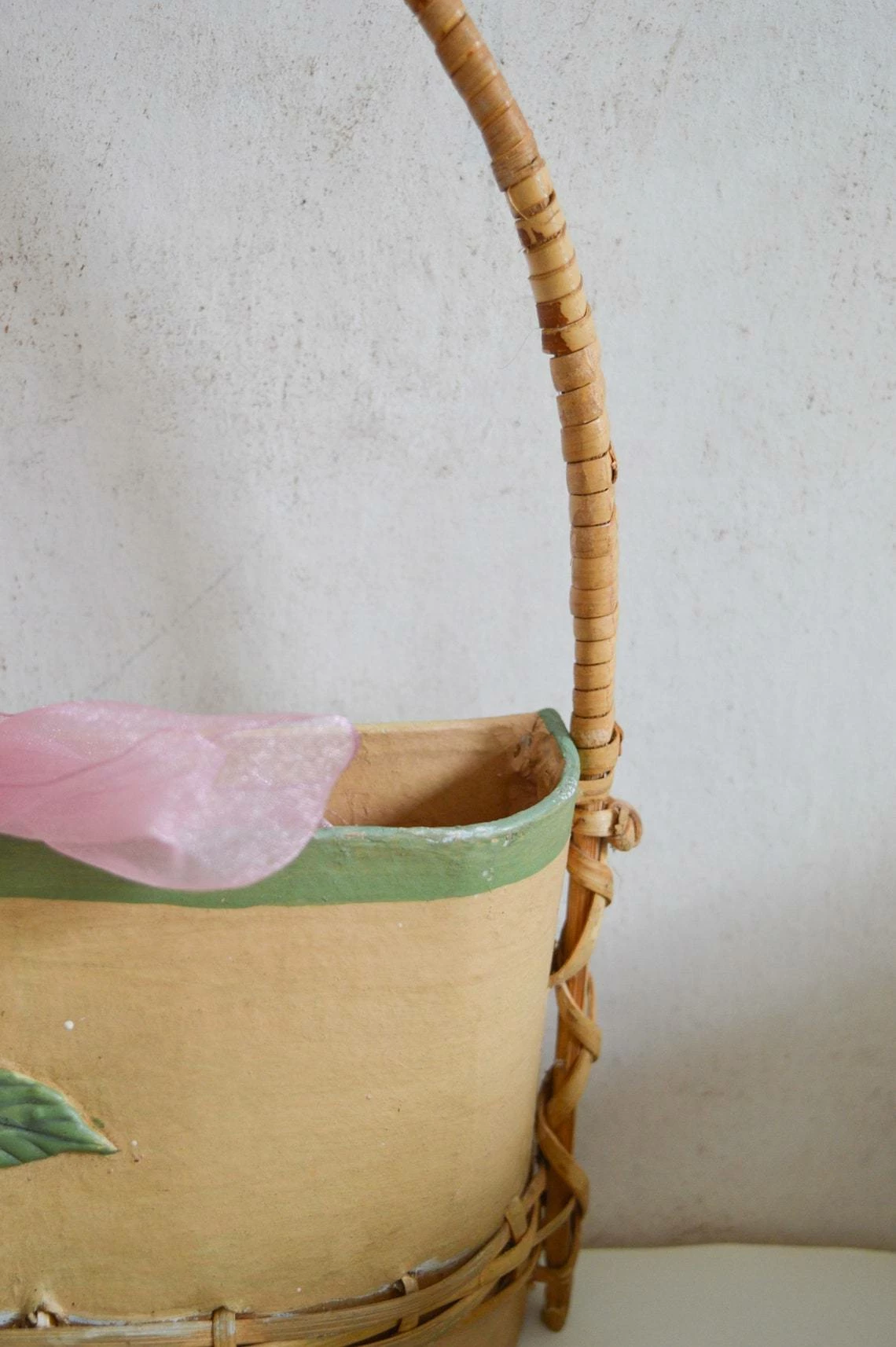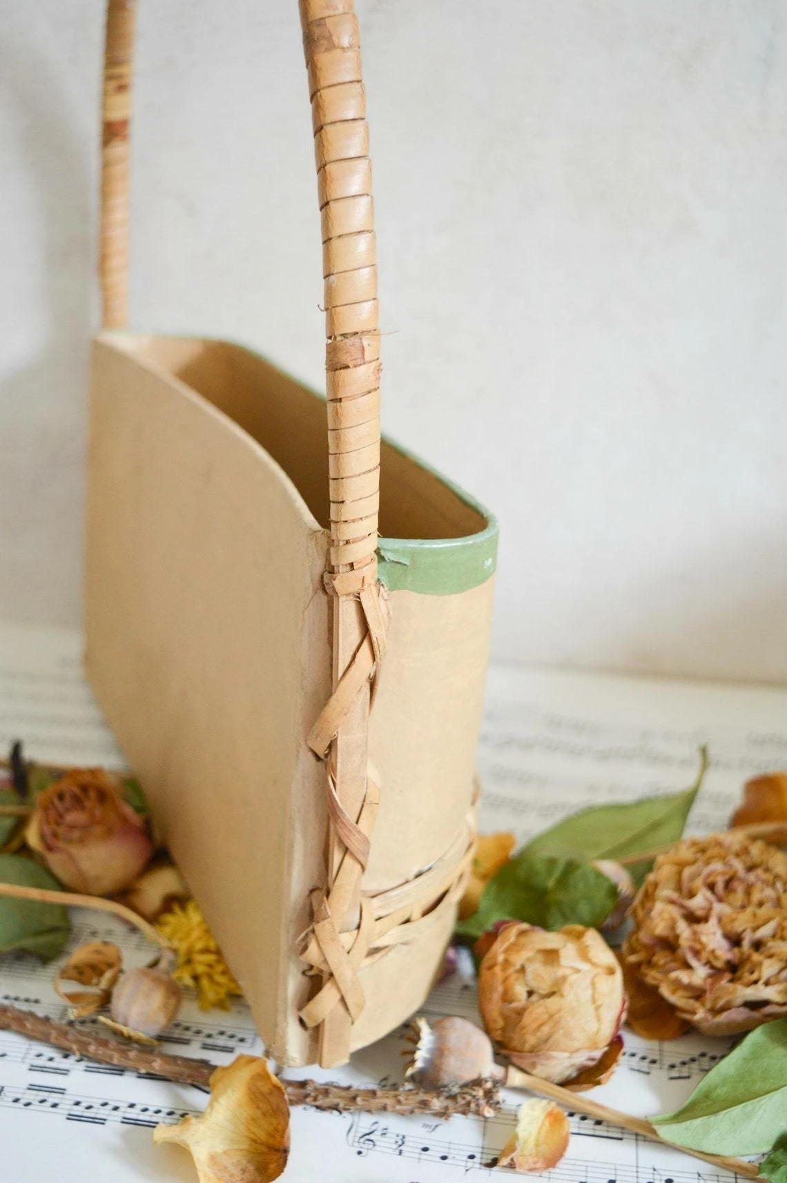 Antique French Shabby Chic Paper Mache Basket with Handle, Beautiful Hand Crafted Storage Letter Organizer with Wooden Roses and Leaves
