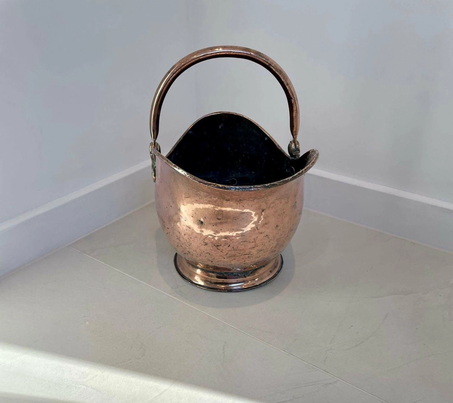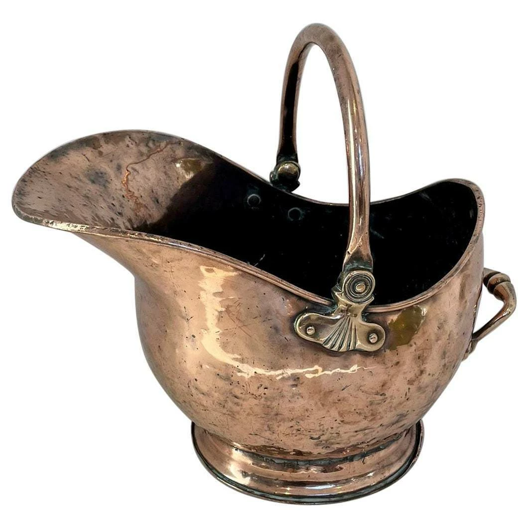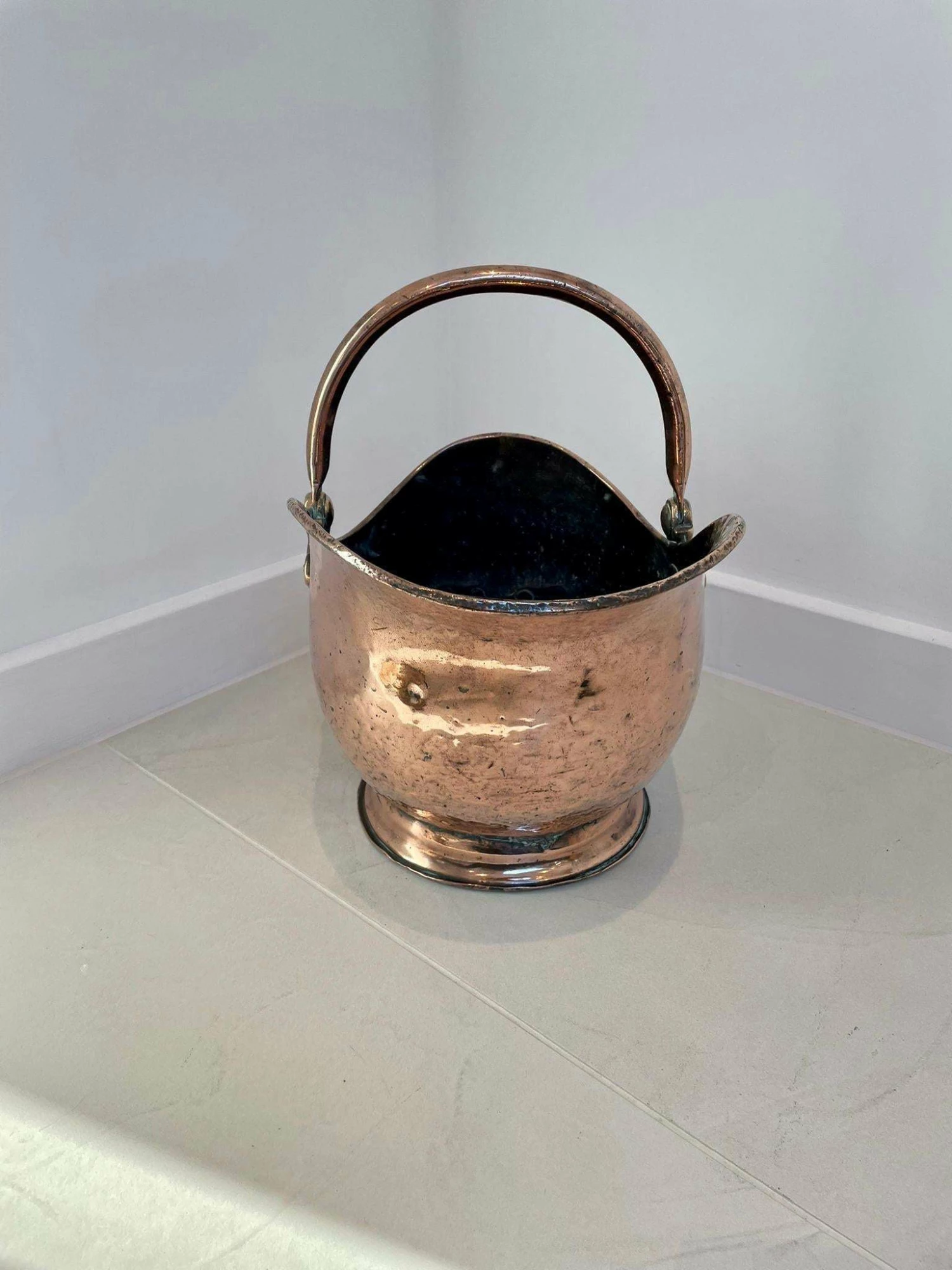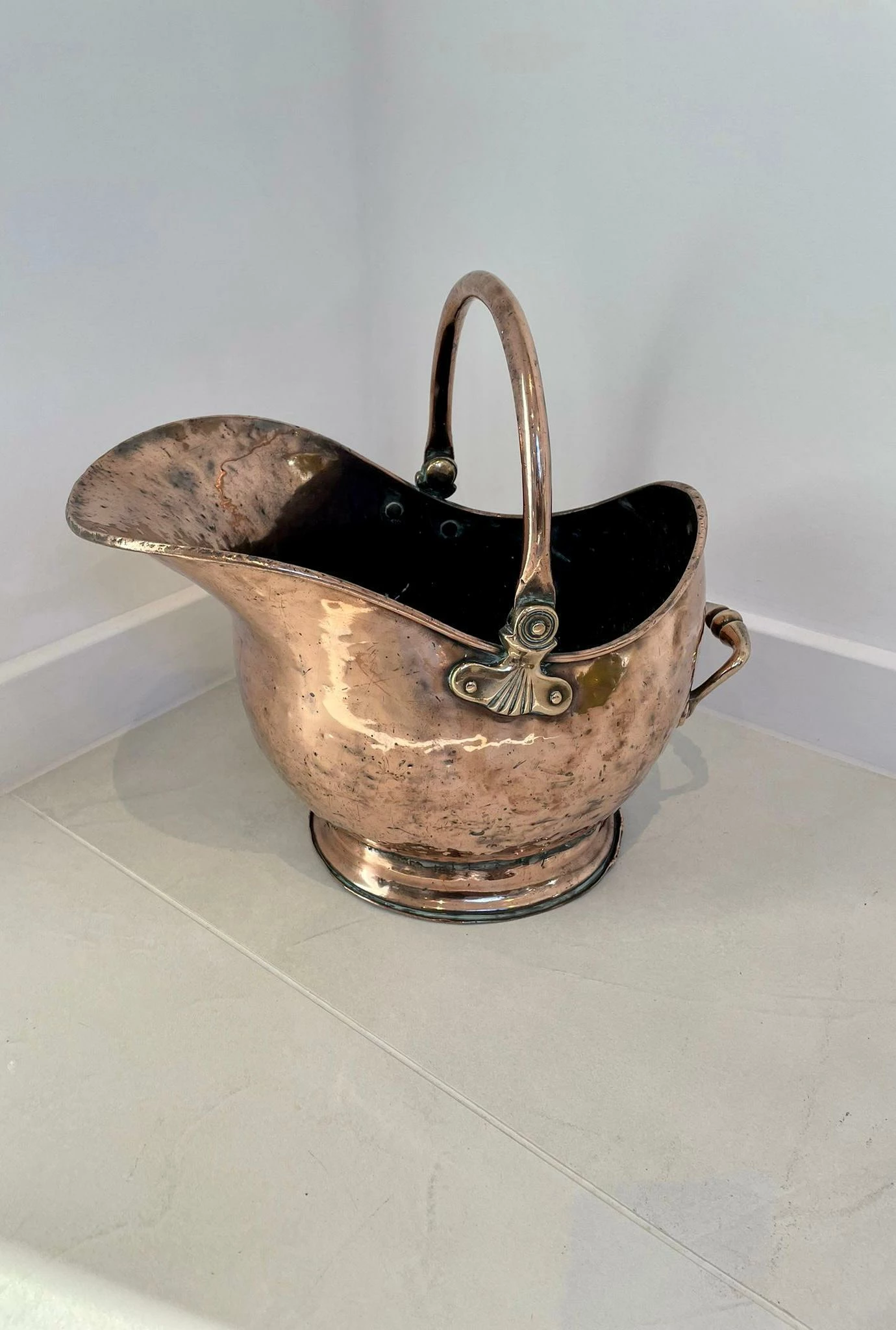 ??Antique George III quality copper helmet shaped coal scuttle having a quality copper helmet coal scuttle with a swing carrying handle and raised on a circular base.