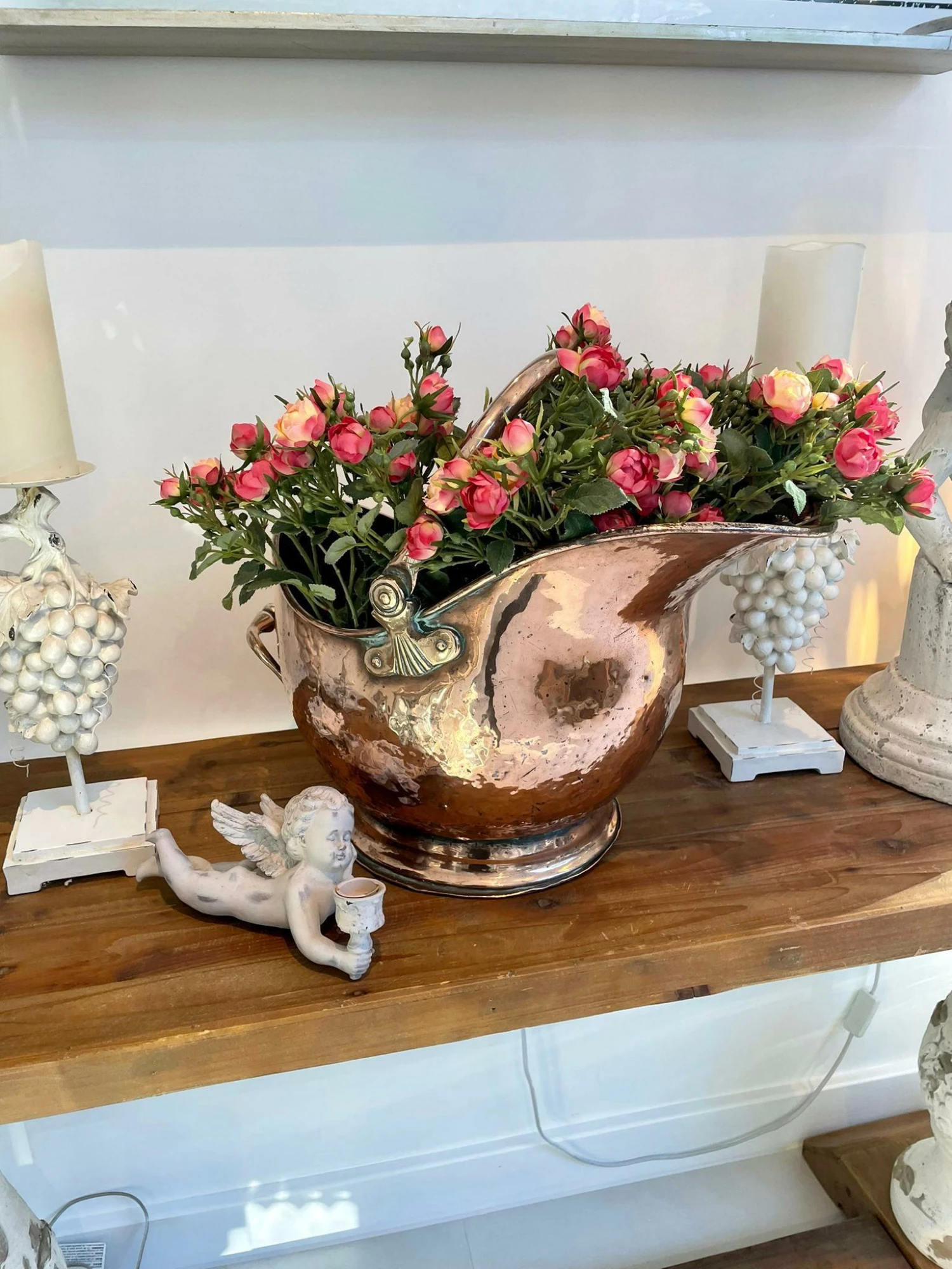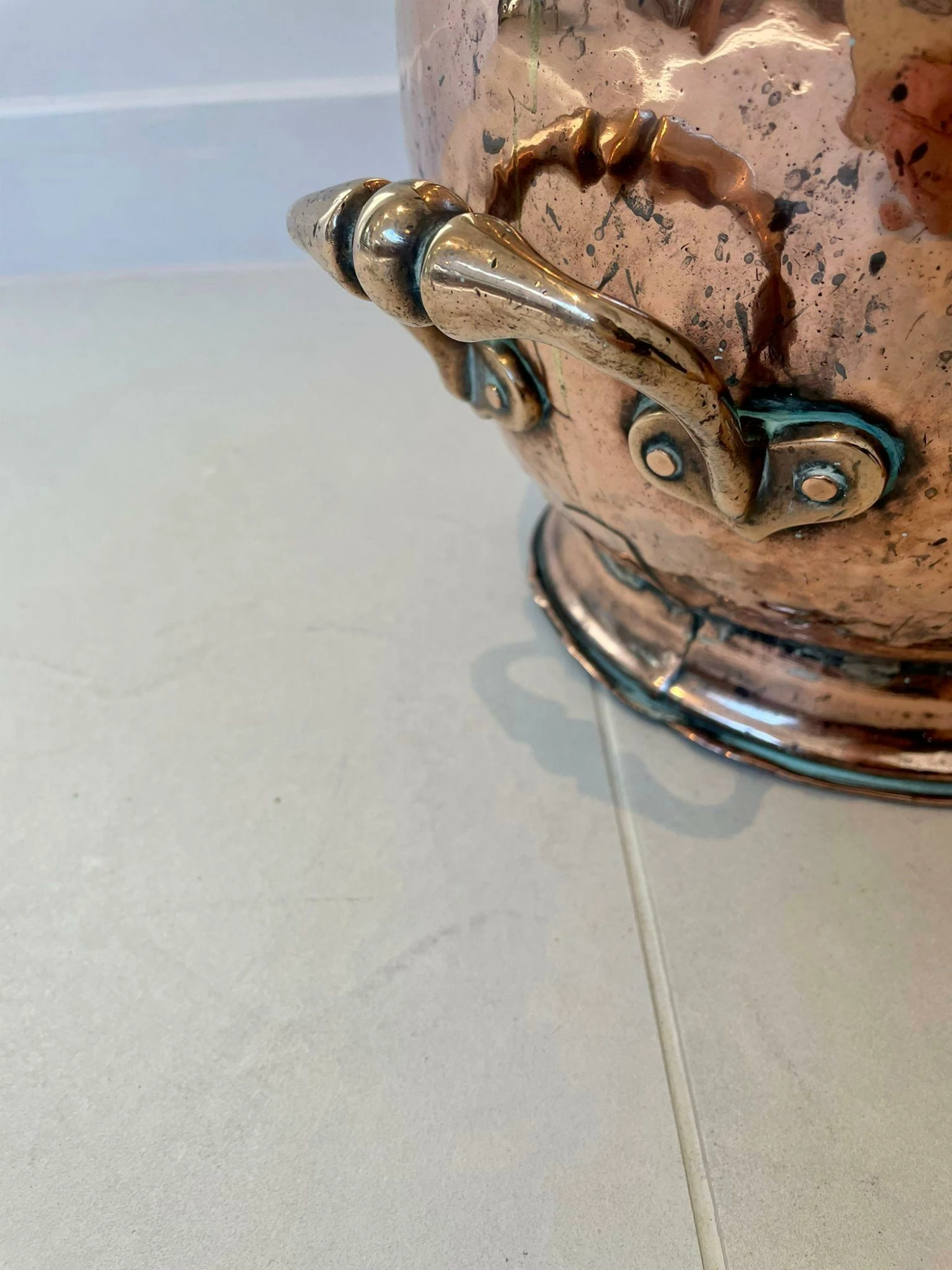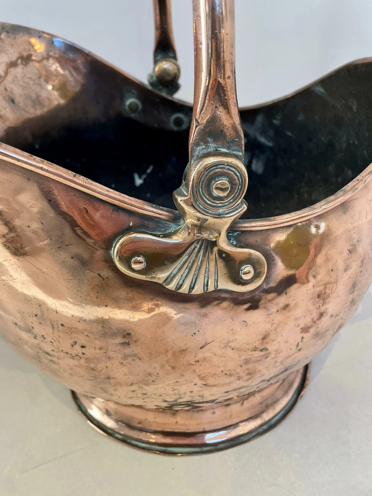 ??Antique George III quality copper helmet shaped coal scuttle having a quality copper helmet coal scuttle with a swing carrying handle and raised on a circular base.