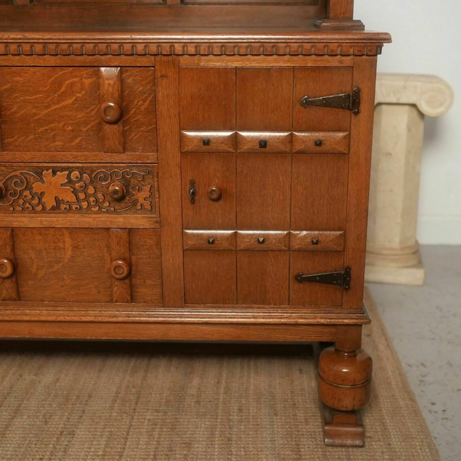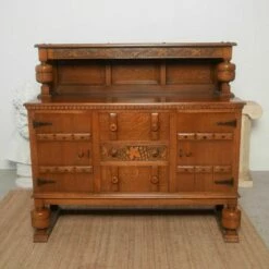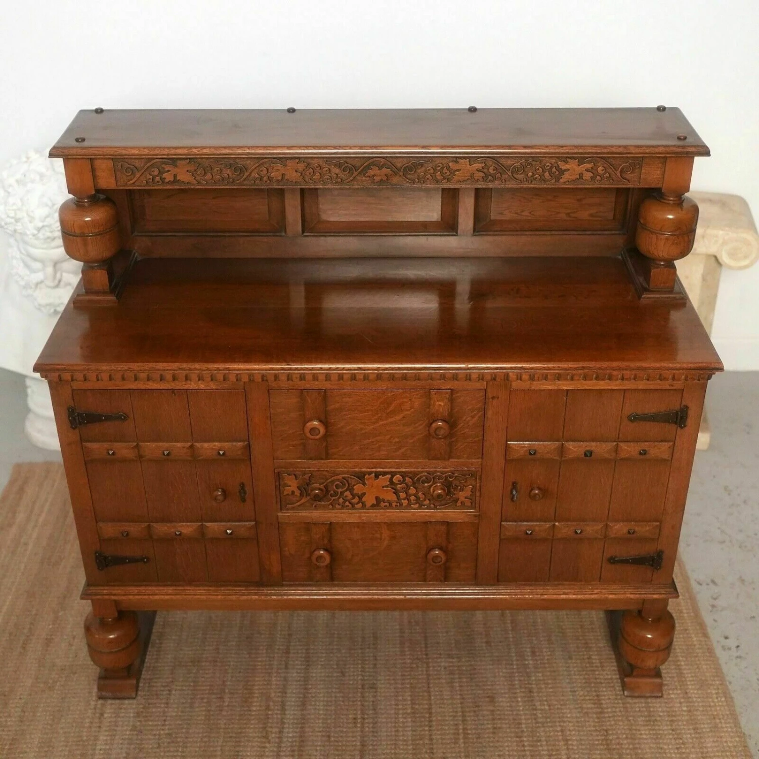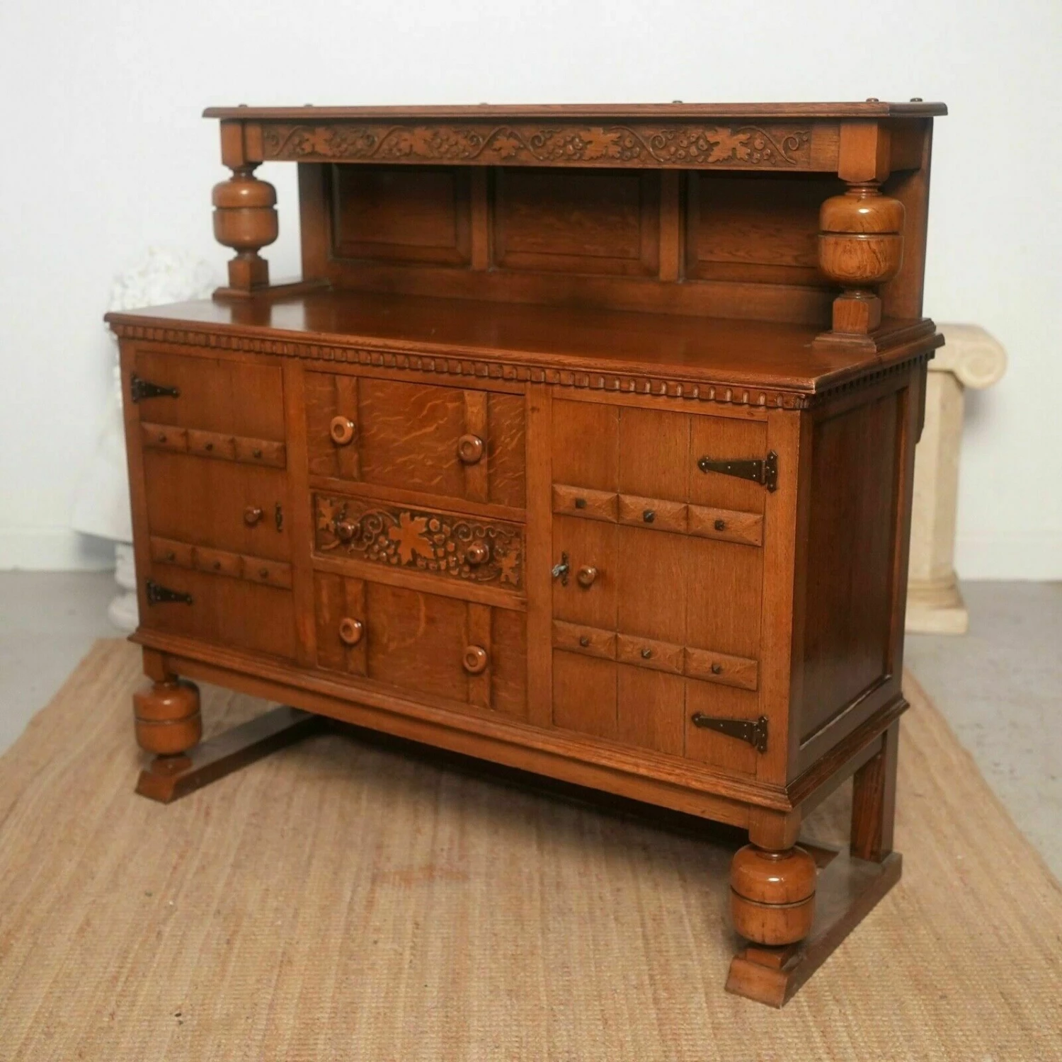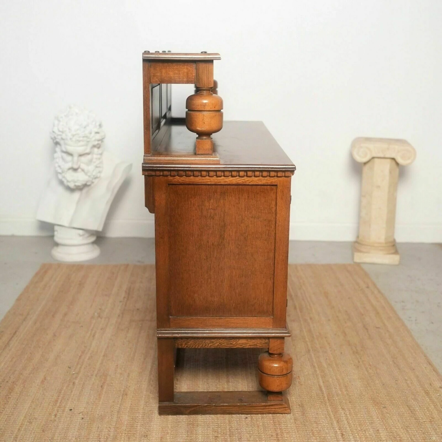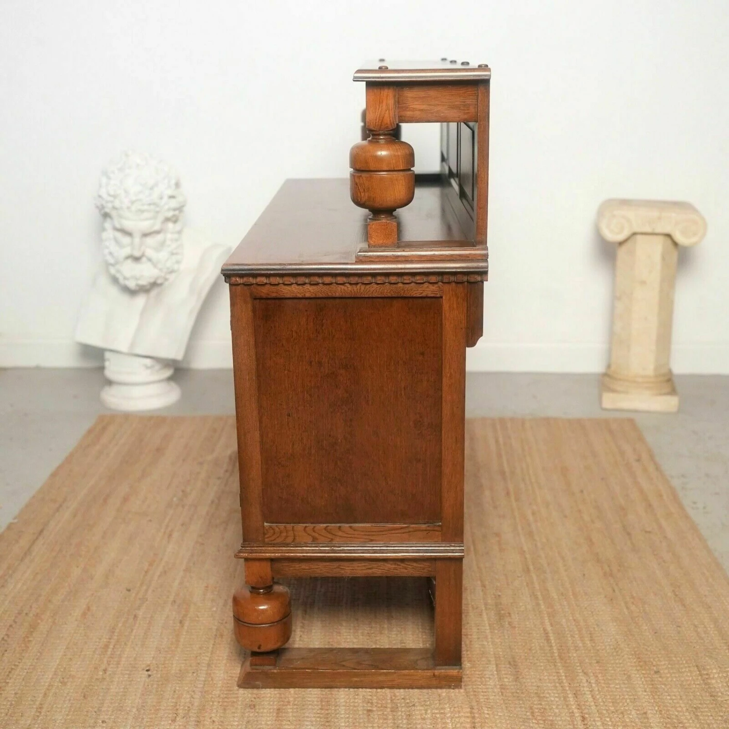 The raised gallery with carved fretwork over a central bank of drawers flanked by doors mounted with good hinges enclosed shelving and raised on carved supports.