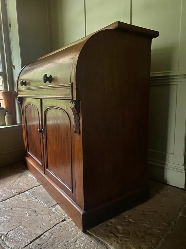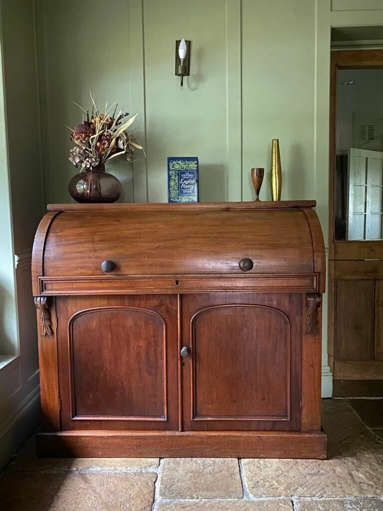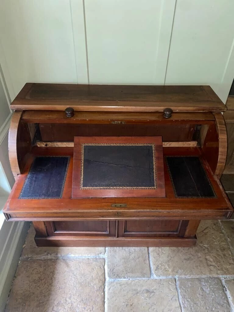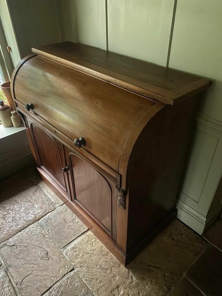 Charming Antique Victorian Cylinder Roll Top Bureau would originally had a bookcase on top, you can still see the unpolished wood on the top where this would have sat.