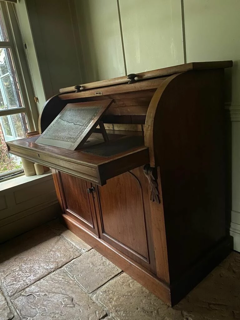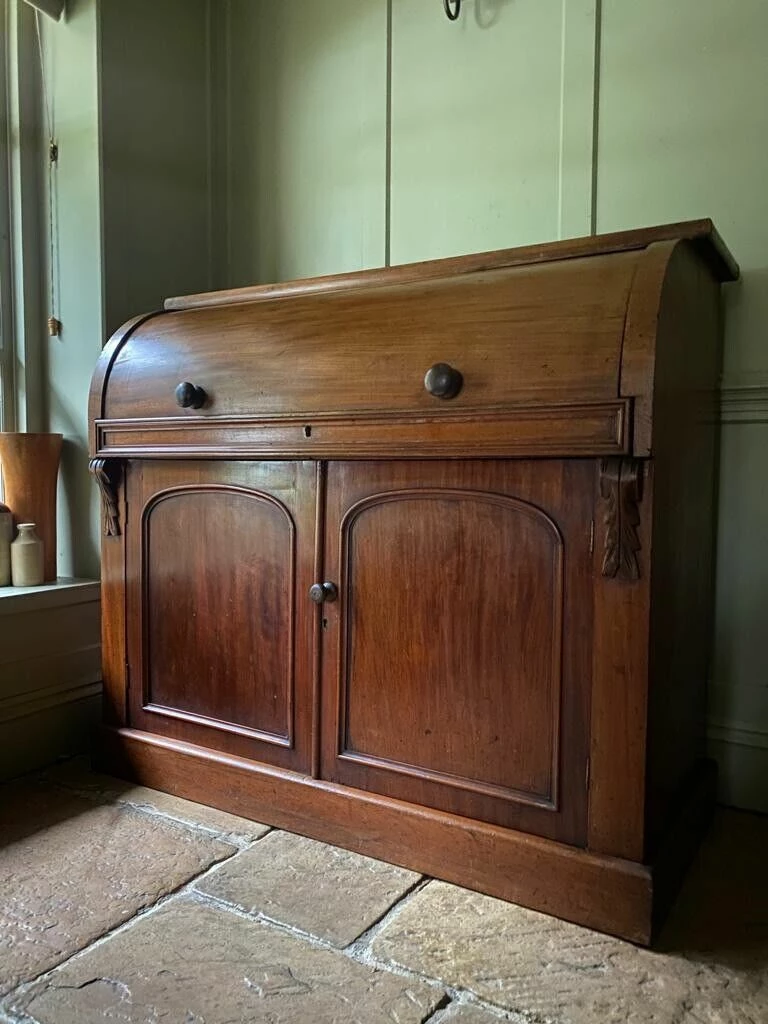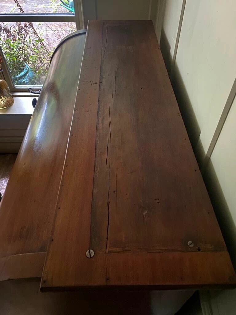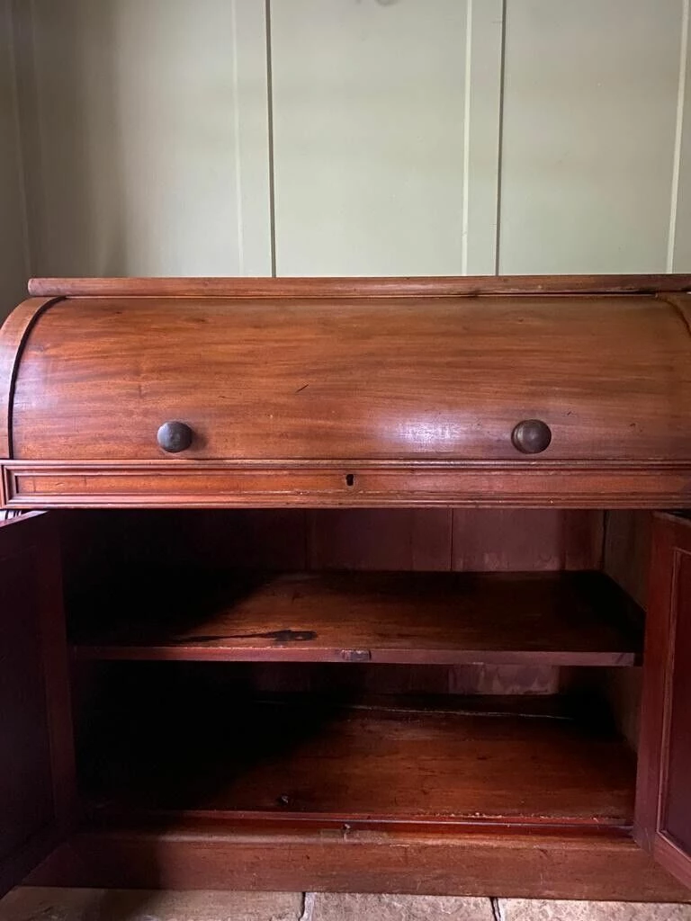Charming Antique Victorian Cylinder Roll Top Bureau would originally had a bookcase on top, you can still see the unpolished wood on the top where this would have sat.