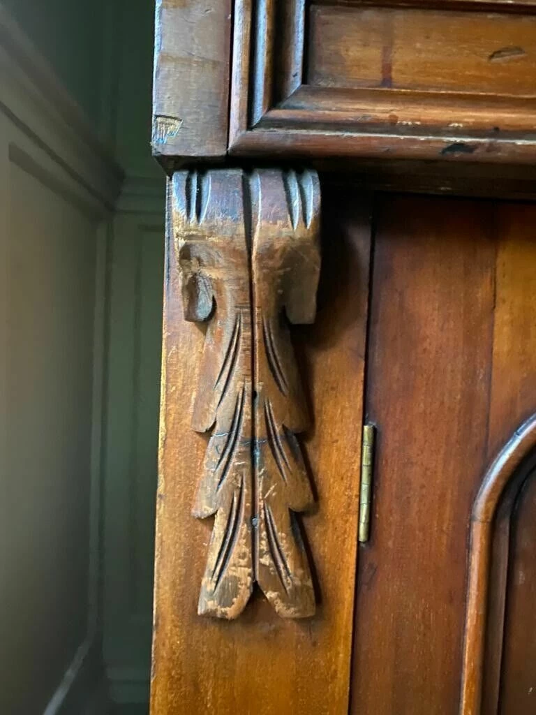 It comes with good solid shelf in the cupboard and role top reveals a nicely proportioned writing slope. There is a strip of dummy drawer fronts, but it doesn’t have working drawers inside the desk part. The desk section pulls out, so it can be used with your legs beneath.