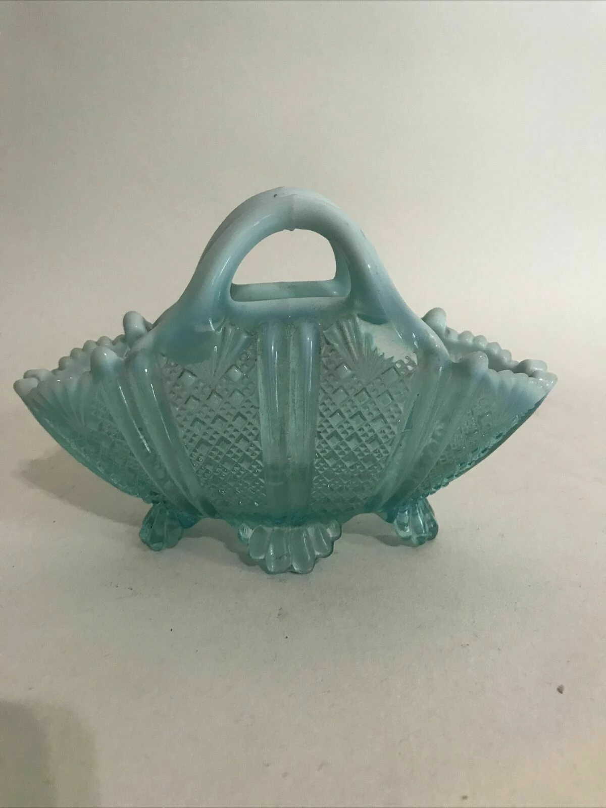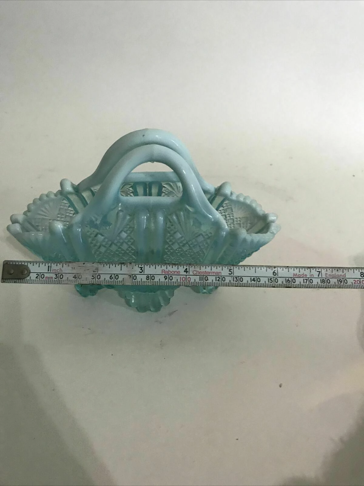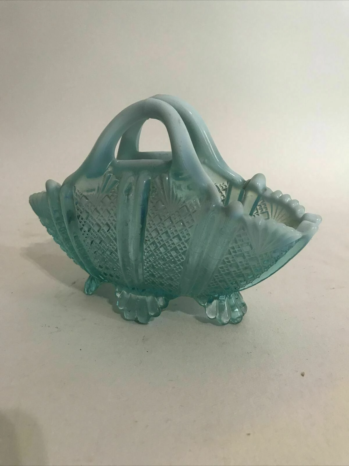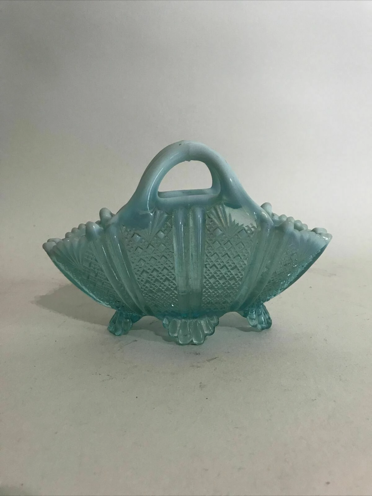 Antique Victorian Davidson Pressed Glass Blue Pearline Posy Basket.