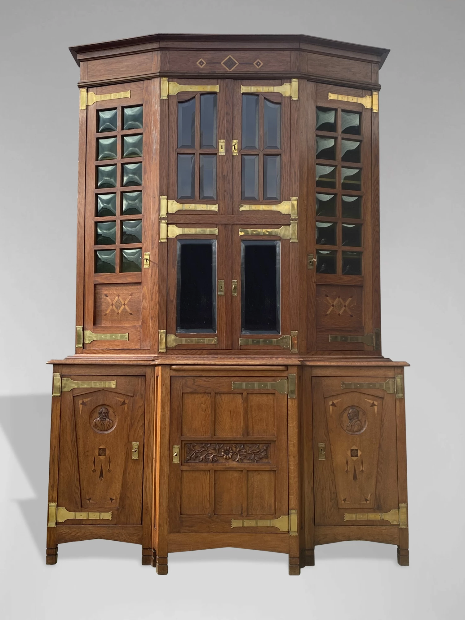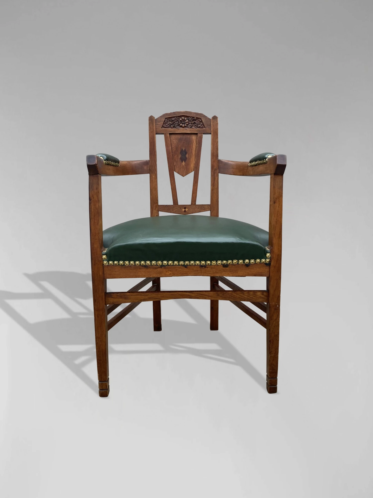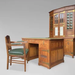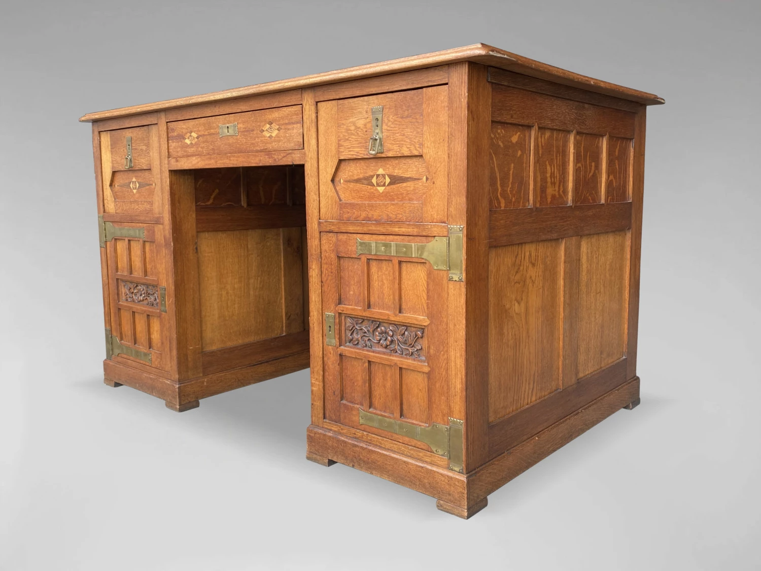 An oak Arts & Crafts, Art Nouveau set of 3 pieces, in the style of Gustave SERRURIER BOVY (1858-1910). A magnificent and rare set of three office and dining room furniture in oak, brass, rosewood and satinwood inlays comprising, an oak buffet or sideboard, an oak pedestal partners desk and an oak & leather desk armchair. All in very good and original condition with a beautiful warm patina.