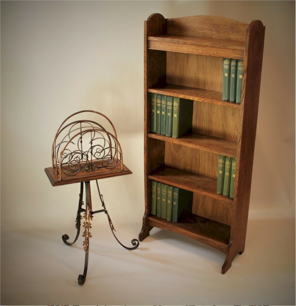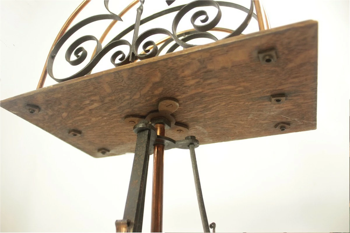 Arts and crafts movement revolving magazine rack in oak with iron legs with copper foliate decoration. Copper and iron divisional sections on oak base. Measures 80 cm high x 38 cm wide x 21.5 cm deep. Feet 42 cm wide