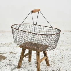 Unknown Vintage French Round Red Wire Egg Garden Potato Fruit Or Vegetable Basket With Handle