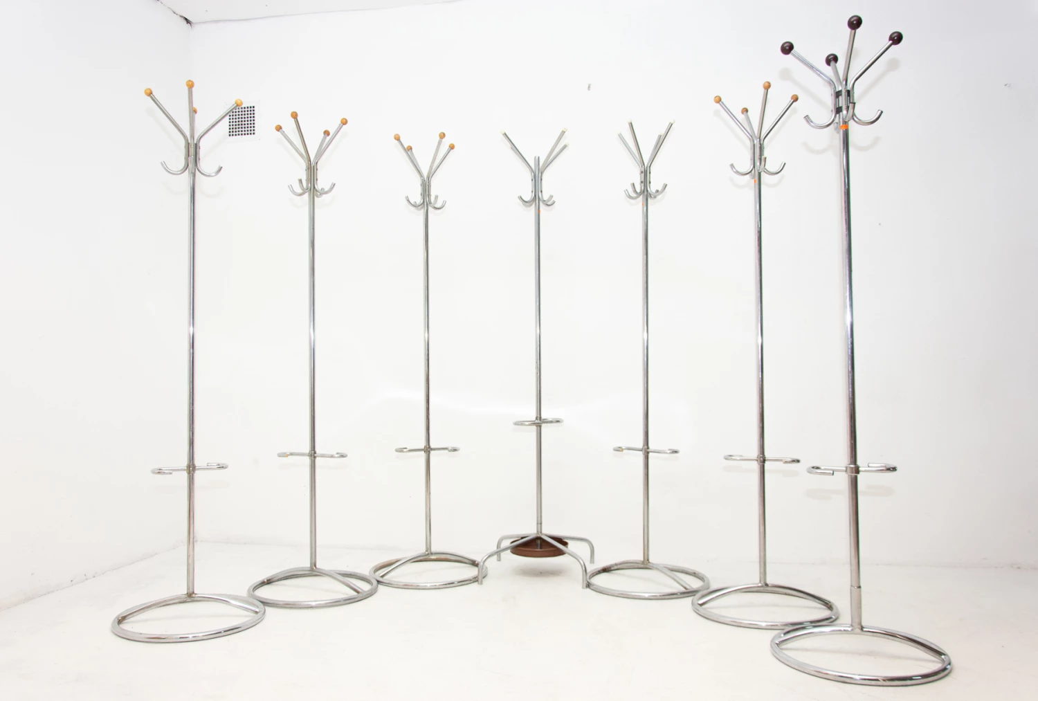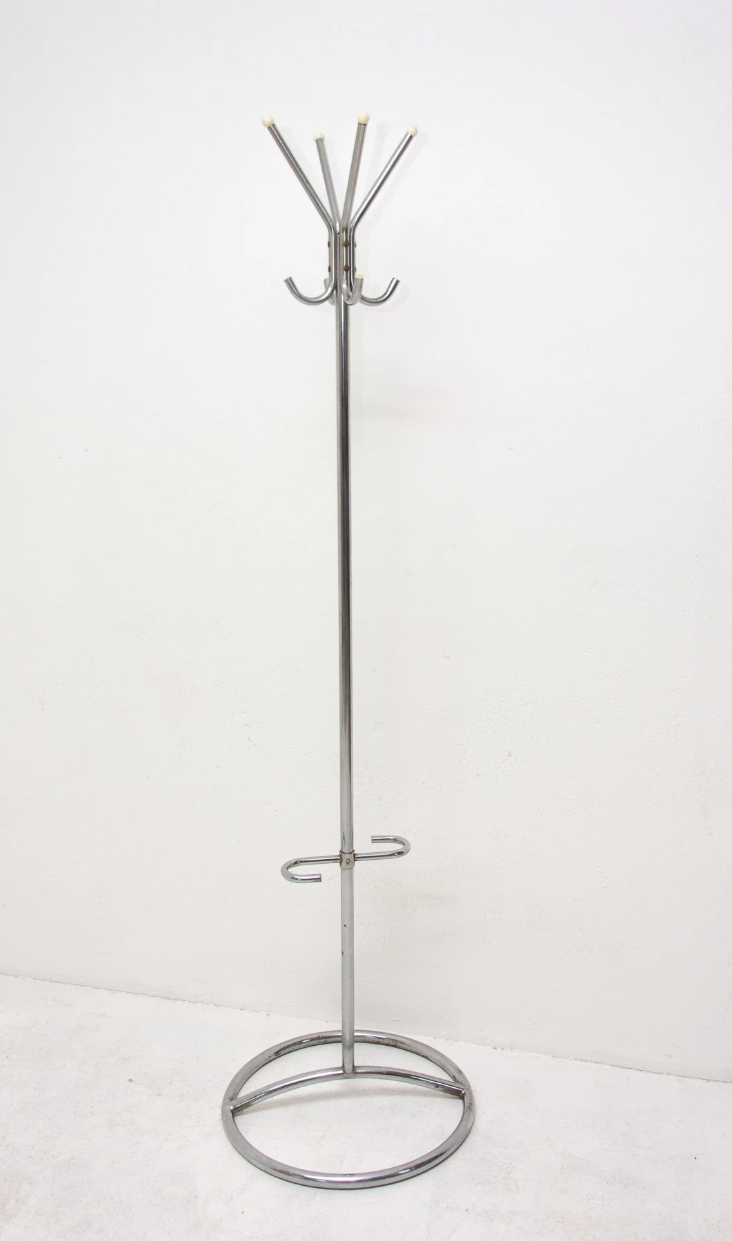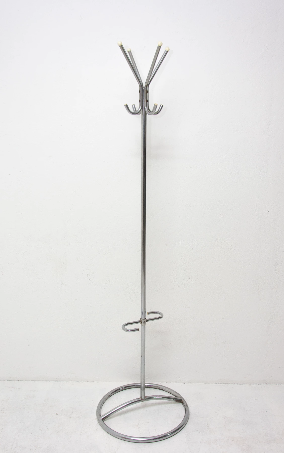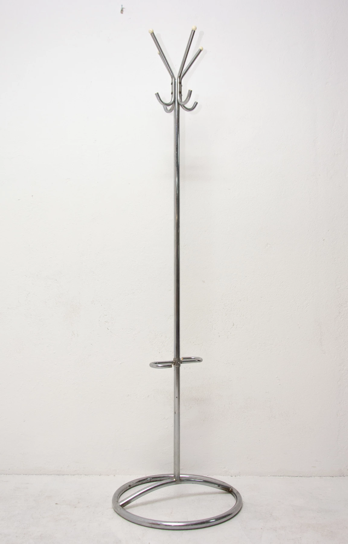 For all Bauhaus lovers! A beautiful example of Bohemian pre-war functionalism represents this model of coat rack. This hanger was designed probably by Gottwald or Slezák company in Bohemia in the 1930s and produced in the 1950´s. It features a full-chrome structure with round wooden tips at the ends and umbrella holder. These coat racks are in really good condition with slight signs of use and age.