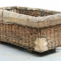 This heavy-duty basket with a crown stamp is ideal for storing logs. The rim has a thick, hardened leather border, and two wooden blocks support the basket. It has “ER F.B.K. 1952” stamped underneath, indicating it may have belonged to the British military or government.