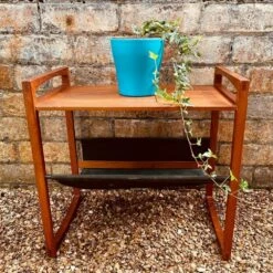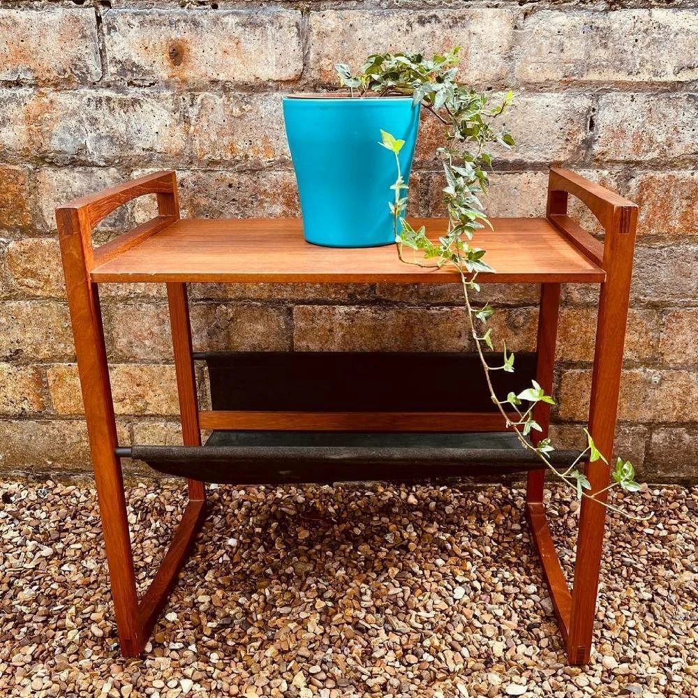 Danish designers always know how to make something special out of ordinary things. Take this magazine rack, not only the sleek design is very beautiful, it is also a handy side table. This vintage magazine rack is made of solid teak and the magazine part is made of suede in a light color. The Danish craftsmanship and design are evident from the beautiful wood joints on the corners and from the clean lines opposite the more curved arches. This magazine table is designed by the Danish designer Henning Wind-Hansen, but is also attributed to the famous designer Kai Kristiansen. It was produced in the 1960s by the Danish furniture manufacturer Sika Møbler.