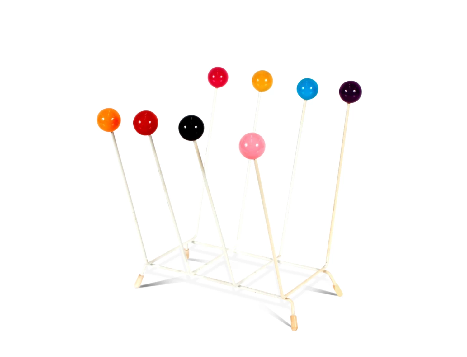 Eames Design Sputnik Chrome Magazine Rack With Brightly Covered Atomic Balls Mid Century Modern 1960s