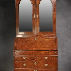A Fine Queen Anne Double Dome Walnut Bureau Bookcase with figured matched Walnut veneer and feather banding throughout. The fall opens to reveal a wonderful quality shaped and stepped interior with a sliding well to the centre. The central door is flanked by Columns with brass to the base and caps. The mirror plates are bevelled and are old replacements as are the handles. The linings are in Oak, they are in clean condition and original throughout as is the exterior. The Bookcase is the classic Queen Anne design with double domed top. It is a rich warm honey colour and the proportions work particularly well.