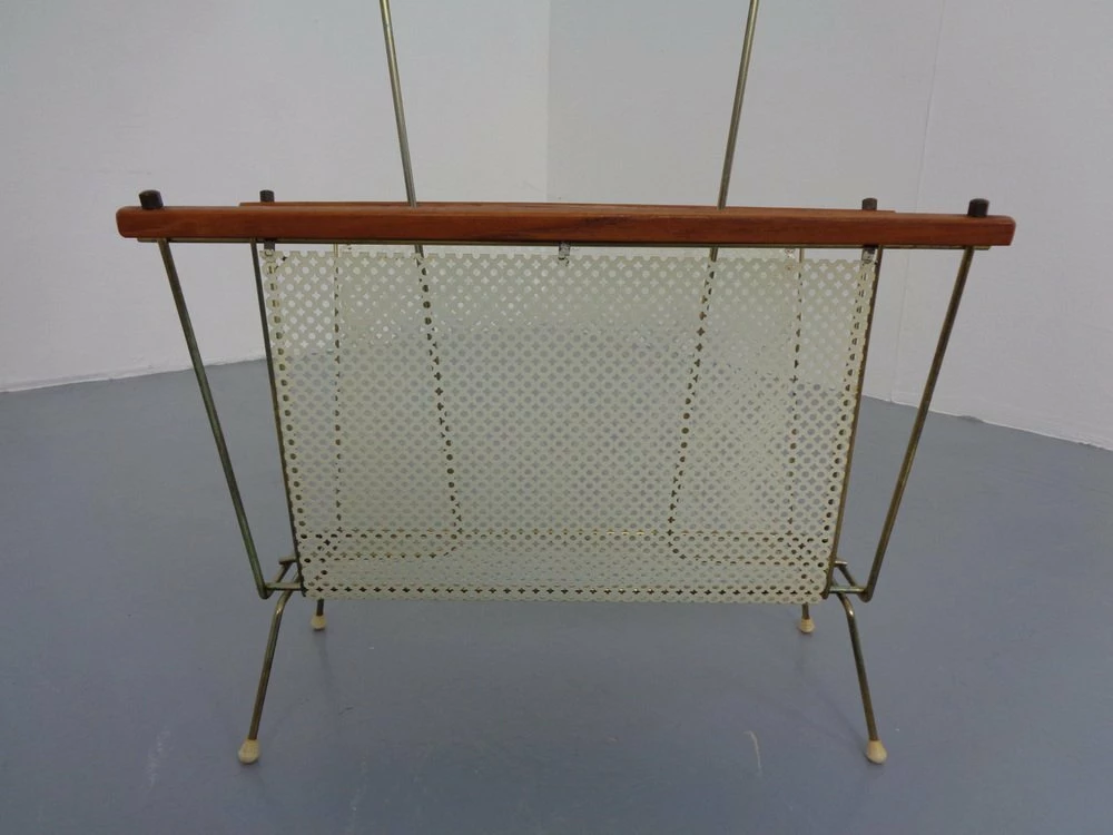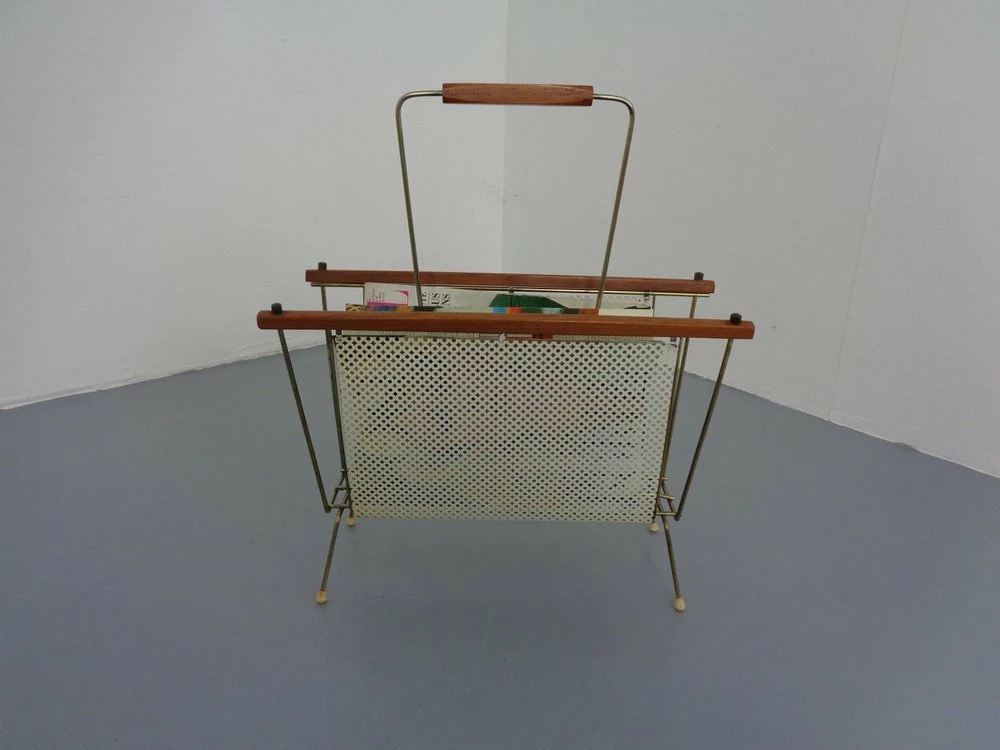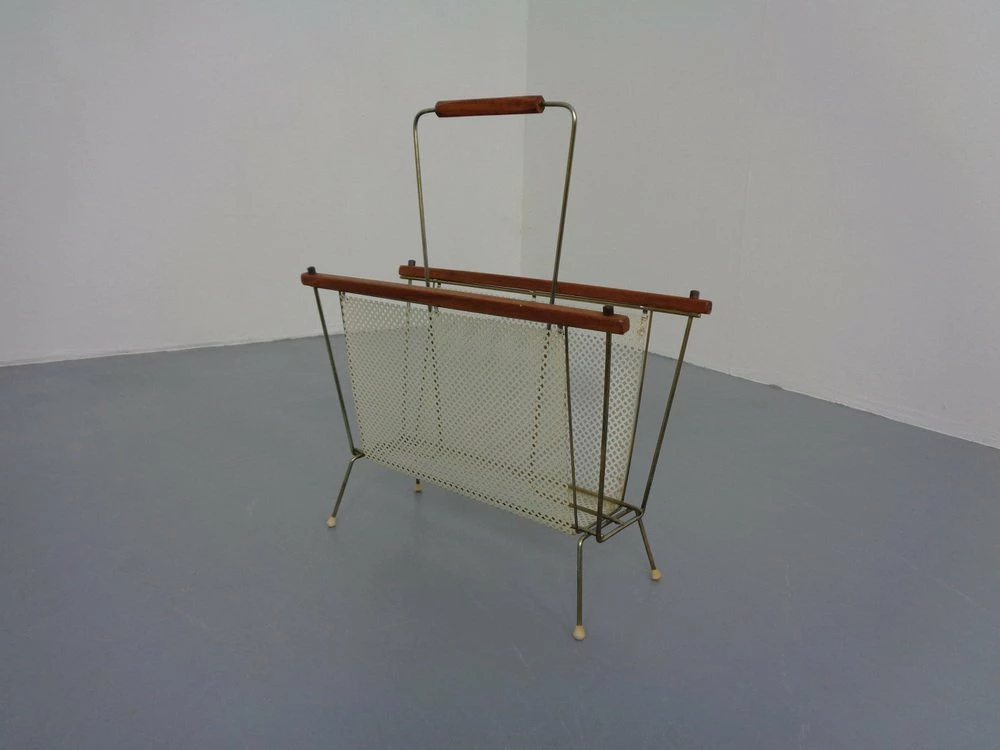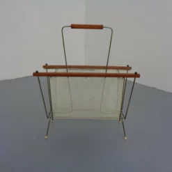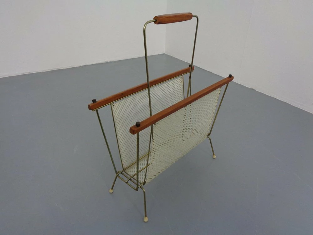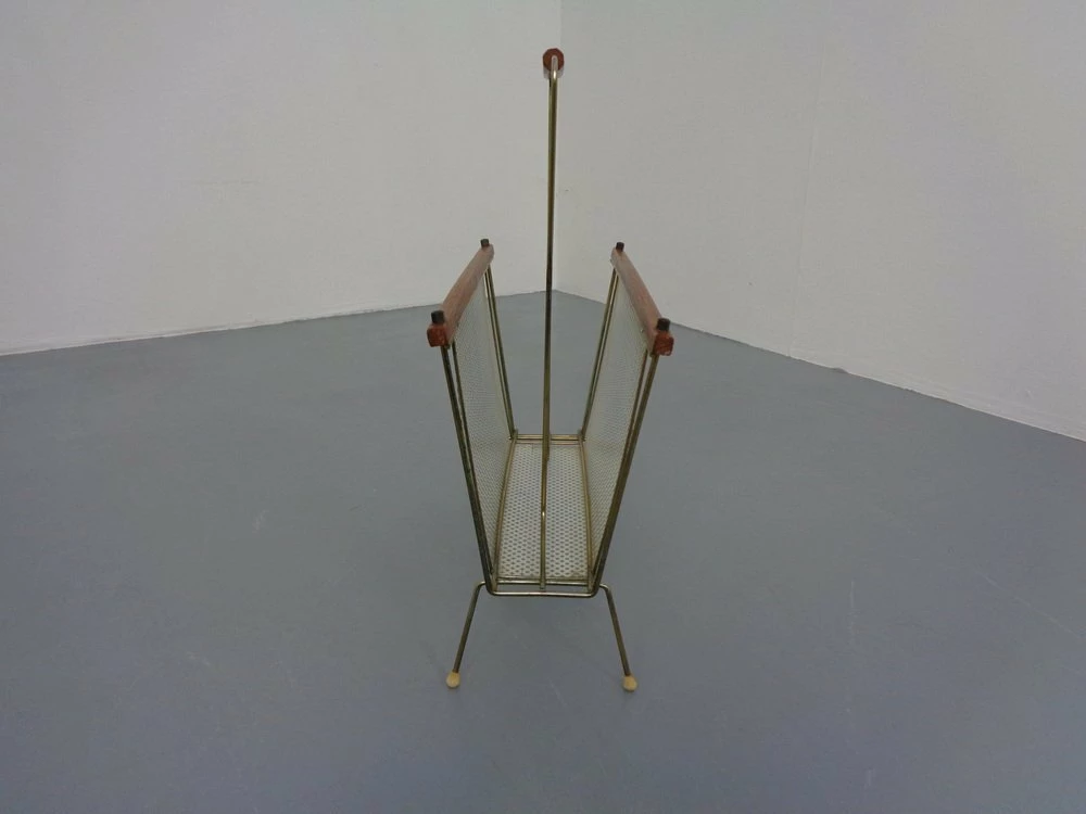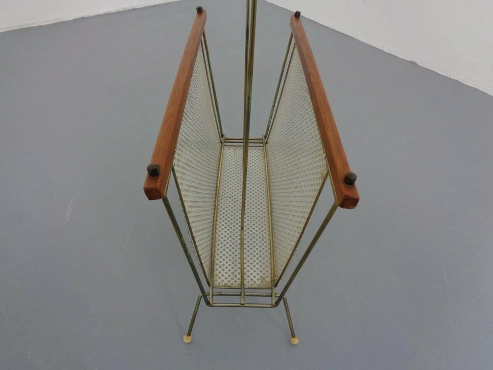 French newspaper stand made of metal and teak.