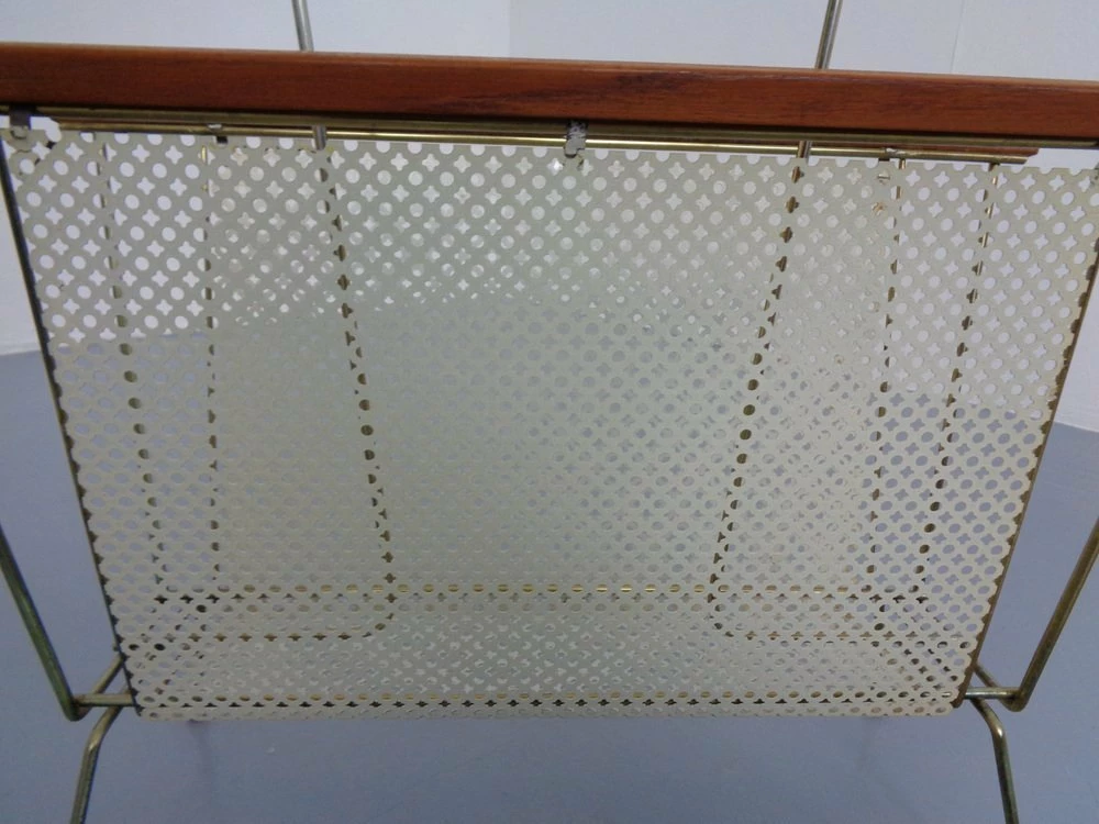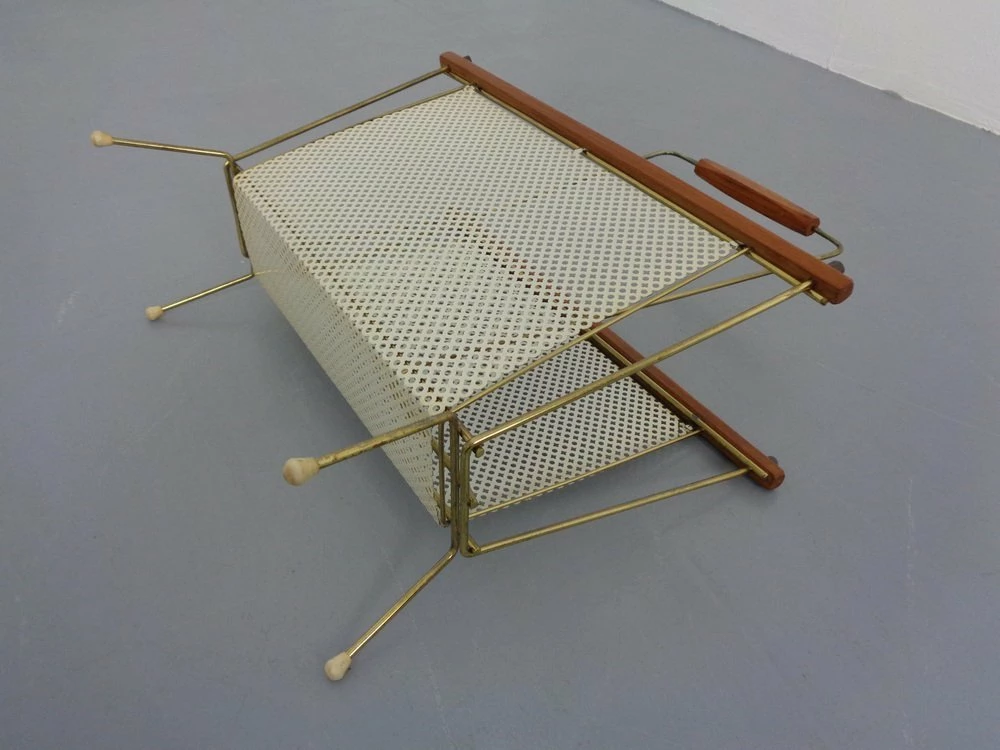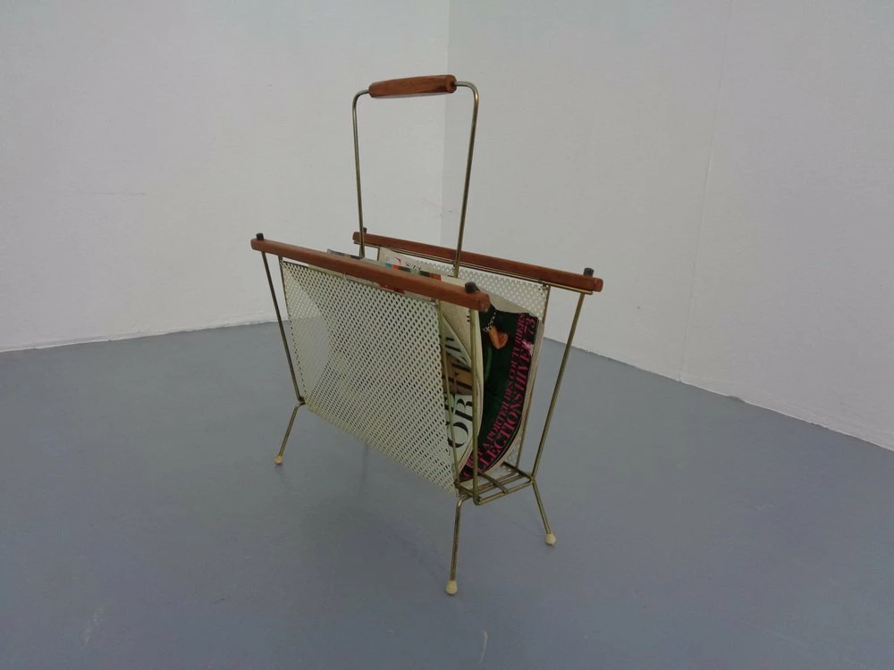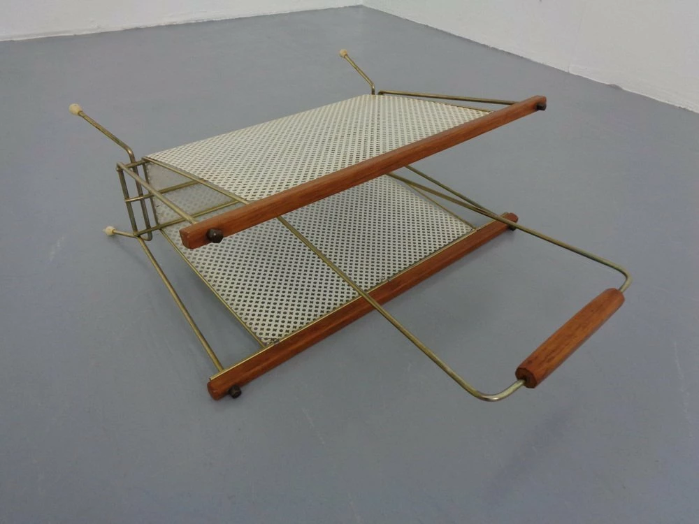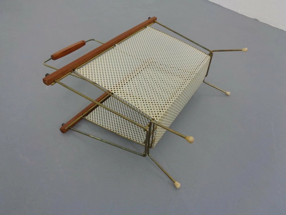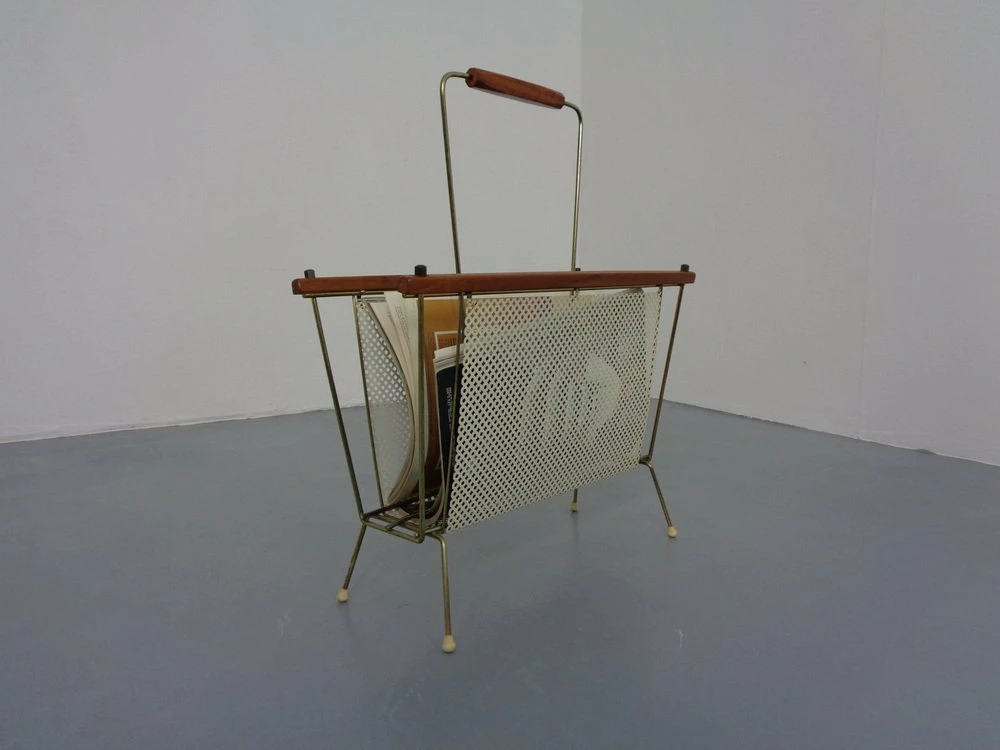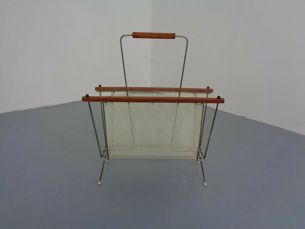 French newspaper stand made of metal and teak.
